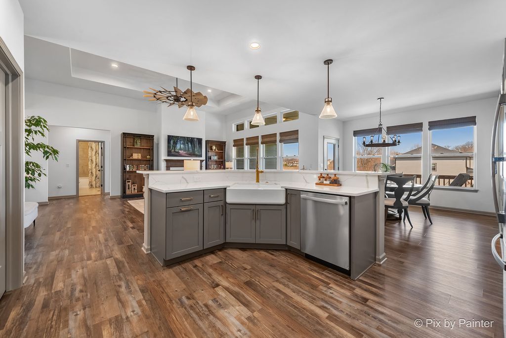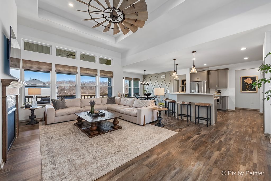This Stunning Custom Ranch with Water Views Will Become your Favorite Place to Be! Over 4200 S.F Of Living Space On Beautifully Landscaped 1/3 Acre Lot. Wonderful Split Bedroom Floor Plan with 4 BEDROOMS plus OFFICE/5th BR, 3 FULL BATHS, a FULL WALK-OUT FINISHED BASEMENT, and a 3-CAR GARAGE. But that's just the beginning! This ideal layout offers ease of movement for many guests as they flow from the GREAT ROOM to the KITCHEN to the DINING ROOM to the COVERED BACK DECK That Converts To A Screened Porch!. When there's a chill in the air, step back inside and enjoy the Gas FIREPLACE. Or step downstairs and treat them to an amazing MOVIE EXPERIENCE in your custom THEATER ROOM with INCREDIBLE SOUND! Just don't forget to stop by the wall-mounted Candy Dispenser for a sweet treat on your way out. Down here you'll also find a 2nd FAMILY ROOM with an Electric FIREPLACE, REC ROOM/GAME ROOM, 3rd FULL BATH, BEDROOM and ....HELLO FABULOUS!.... it's a 2nd EAT-IN KITCHEN with Stainless Fridge, Oven, MW, DW. This basement set-up would make for a happy In-Law or Teen Suite. Did you notice that Water View out back? You'll spend many serene hours enjoying the views from your Paver Patio while enjoying the Built-in Firepit, cooking on the Built-in Gas Grill or just relaxing in the Covered Table Space. No Expense Spared on the $$$$$ Professional Exterior Landscaping. Up on the Main Level, the PRIMARY SUITE features Tray Ceiling, Gorgeous BATH with Step-in Shower, and a Walk-in Closet with Custom Built-in California Closet Organization System. Down the hall is the LAUNDRY ROOM and Back Entry FOYER. In the north wing of this fabulous home, you'll find TWO Sunny BEDROOMS, FULL BATH, and the Front OFFICE/5th BEDROOM. Now for the NEIGHBORHOOD SCOOP: This location is just a short walk to the elementary school and is adjacent to the Clubhouse with Pools, Splash Pad, Fitness Center, Tennis & Sport Courts, Sand Volleyball and lots of Open Space and Trails. If you want a Luxury Lifestyle Neighborhood and an Exceptional Ranch with perfectly chosen high-end finishes throughout, then this is the place to call "Home Sweet Home"!