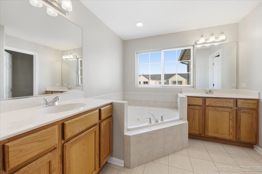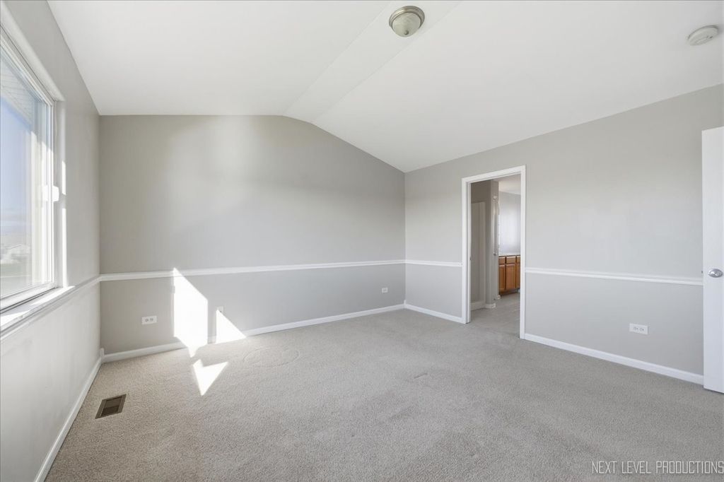 Enjoy peaceful pond views from your living and dining rooms. The entire home has been freshly painted, professionally cleaned, and is move-in ready. The kitchen features a breakfast bar, dining area, ceramic tile flooring, and a stainless steel refrigerator. Laminate flooring runs throughout the first floor. The primary bedroom suite offers a vaulted ceiling, walk-in closet, and full bath. The primary bathroom includes dual sinks, a whirlpool tub, and a separate oversized walk-in shower. Two additional spacious bedrooms complete the second floor. Additional details include crown molding and beveled edges. Convenient second-floor laundry. The full basement includes a rough-in for a future bathroom. The attached 2-car garage is fully drywalled. Welcome to this home featuring expansive living space.