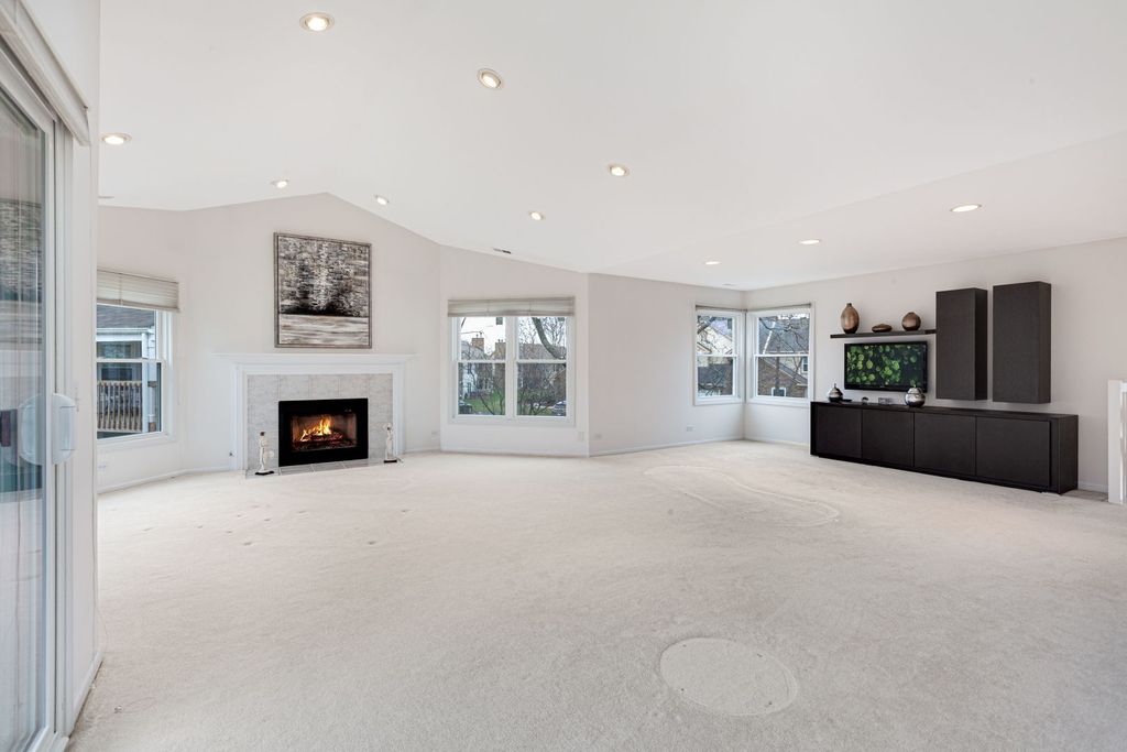 Large size Corner Townhome unit in the wonderful community of Woodlands of Fiore with it's own outdoor pool and a club house. As you step into the sun-filled foyer, you'll be greeted by natural light that flows throughout. Head upstairs to find the spacious dining room, living room combo. The living room is a bright and sunny retreat with sky lights and large newer windows, vaulted ceiling, recessed lighting, gas fireplace, and access to a large balcony, perfect for morning coffee, family and friend gathering or just relaxing. The eat-in kitchen offers ample white cabinet space and 2 skylights. Down the hall, you'll find a convenient laundry room and a bedroom with vaulted ceiling and a walk -in closet, which has access to a full bathroom that can also be reached from the hallway. The primary bedroom includes an en-suite bathroom with dual sinks, and nice size walk-in closet. This home is ideally located in an award-winning school district (Stevenson High-school), while shopping and the train make it a perfect choice for those seeking convenience and comfort.