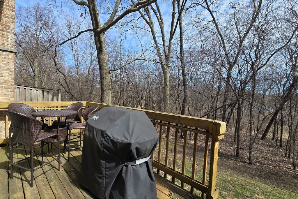 This beautiful two-story 2 bedroom 2.5 bath end unit townhome with 2 car garage presides over a prime cul-de-sac location and features a deck that backs to a peaceful wooded setting & pond. Large living room has vaulted ceiling and gas fireplace and planation blinds. Home also has first floor den/office. Generous master suite features vaulted ceiling, walk-in closet, and private bath with double vanity and jetted tub. Kitchen has plenty of cabinet space, a pantry closet, Corian countertop, and has a separate eating area with volume ceiling. Home also features wood trim and 6-panel doors throughout. Pull-down stairs to additional storage in garage attic. Security system. As an end unit, this home has additional windows & additional light. First floor laundry. The complex is located adjacent to Palatine Hills Park for the sports enthusiast who enjoys golf, tennis or trails. Terrific townhome in a great location! See it today!