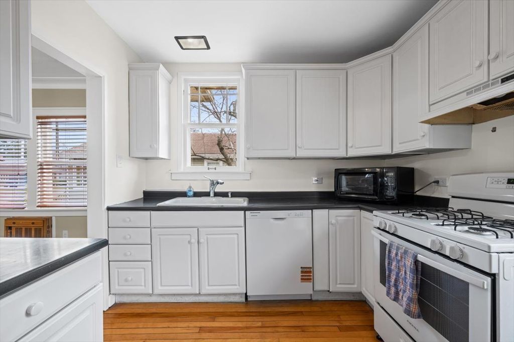 What great curb appeal this charming bungalow offers! The interior reflects all that charm, featuring sparkling hardwood floors throughout. A vintage wood-burning fireplace with a brick surround, flanked by windows, creates a beautiful focal point in the living room. The bright kitchen includes a brand-new range and dishwasher, while the spacious dining room showcases two original built-in corner cabinets. Rich wood trim and lovely original hardwood doors add even more character to this timeless home. An attached porch provides wonderful additional outdoor living space-perfect for relaxing and enjoying the deep backyard. The full basement offers approximately 924 square feet of additional space for the next lucky owner. Super clean and fresh-move-in ready!