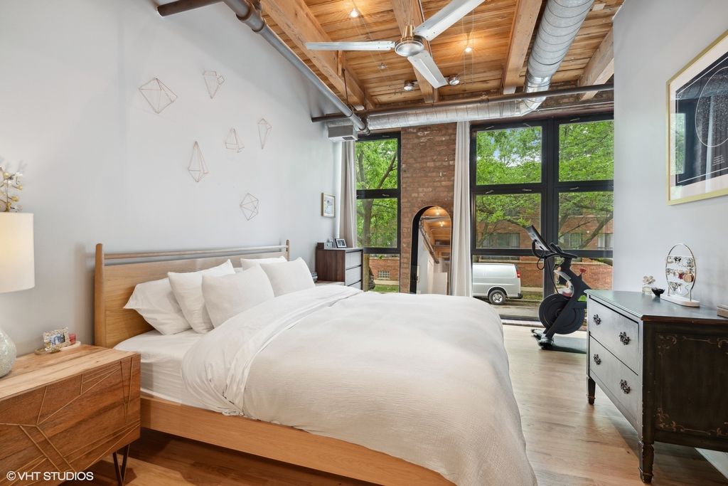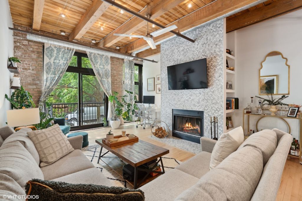 A true quintessential Chicago loft. This stunning brick and timber conversion, thought to have been built around 1907 and once a factory to a manufacturer of kitchen and bath fixtures, blends rich industrial history with modern design in one of West Town/Ukrainian Village's most sought-after locations. Completely remodeled, this condo features tall (12') ceilings, exposed character, and a bright, open floor plan ideal for both living and entertaining. The expansive east-facing living room is anchored by a gas fireplace and dramatic floor-to-ceiling windows that flood the space with natural light. There's ample room for a large dining table and island. This split floor plan offers both privacy and functionality. The primary suite includes generous closet space and a fully renovated, spa-like bath. Additional conveniences include hardwood floors throughout, new in-unit washer/dryer and abundant storage. This well run, boutique building consists of just 30 units and offers a shared rooftop deck with breathtaking skyline views, a bike room, and additional storage. This home includes two parking spaces (one garage space and one outdoor space). See fact sheet for more upgrades and additional information. All of this in an unbeatable location with easy access to the Metra, every day shopping, parks and some of the best restaurants in West Town.