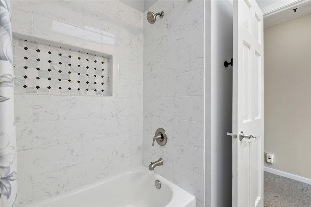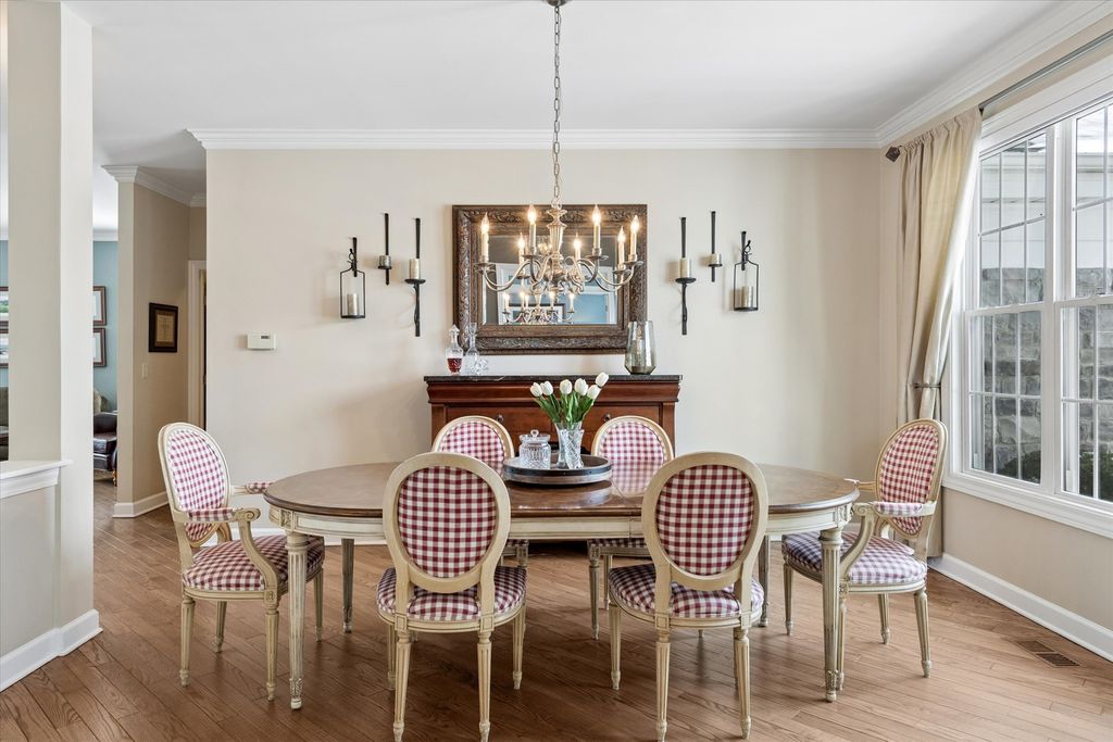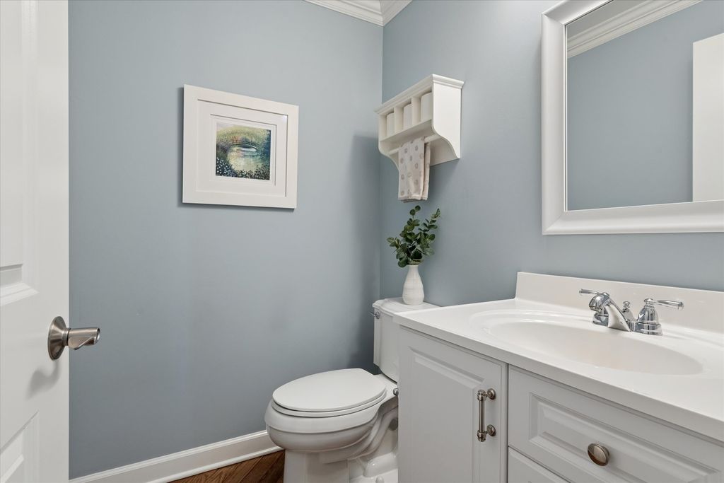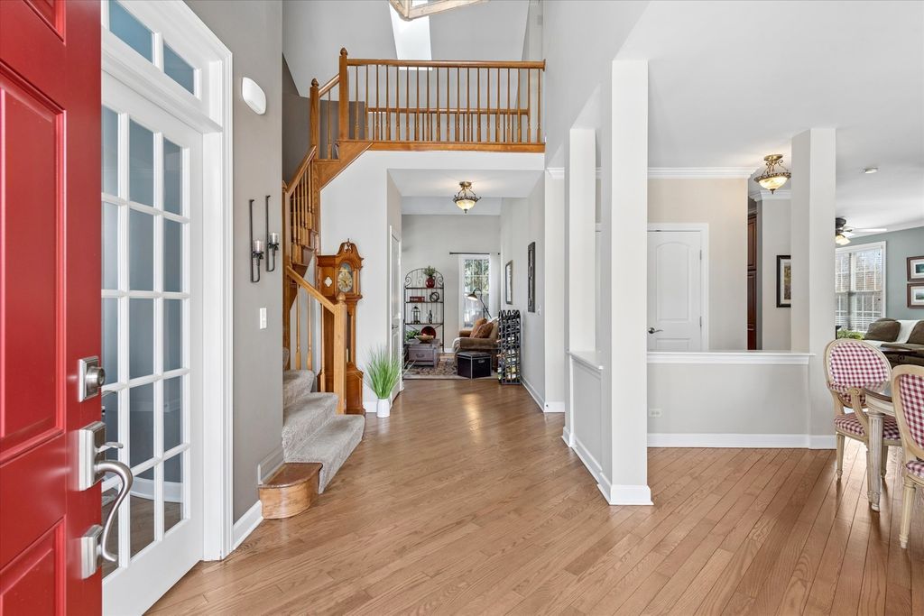 You know the one... the crisp, picture-perfect home in sought-after Hunters Creek with gray siding, white trim, stone accents, classic red door and a beautifully fenced yard. Yes-that one is finally on the market! Step inside and you'll find an interior that is every bit as impressive. Diagonal hardwood floors, today's on-trend colors, white trim and doors, and elevated lighting throughout create a fresh, sophisticated feel. A dramatic two-story entry with arched window above the front door welcomes you in, while the side staircase with skylight and catwalk adds architectural interest. The private study-tucked behind double French doors with a transom and featuring a peaked ceiling-is flooded with natural light. The dining room offers crown molding, knee walls, and a classic candelabra-style chandelier, while the volume living room provides a stylish setting for entertaining (and yes... the perfect place to enjoy a glass of wine with friends!). The heart of the home is the expansive family room with fireplace, white millwork and marble surround, ceiling fan, mounted TV, and 2" white wood blinds-flowing seamlessly into the beautifully renovated kitchen. Here you'll find custom cabinetry with crown tops and soft-close drawers, granite counters, stone backsplash with mosaic detail, stainless steel appliances including a French door refrigerator, breakfast bar with TV wall mount, abundant recessed lighting, and atrium doors leading to a custom deck and fenced yard. Function meets style in the main level laundry room with raised machines, extensive cabinetry, utility sink, and hanging space. The powder room has been tastefully remodeled with a white vanity, crown molding, and chic finishes. Upstairs, the spacious owners' suite offers a bayed sitting area, dimensional ceiling with fan, and a stunning remodeled bath featuring stone tile flooring, dual vanities with a dedicated "beautification station," full wall mirror, soaking tub, and a separate shower with glass enclosure and custom tilework. Bedrooms 2, 3, & 4 all offer generous closets and overhead lighting. The hall bath has also been beautifully updated with horizontal stone tile, white vanity, modern fixtures, and a custom inset niche in the tub/shower. The finished English basement is truly next-level-complete with a recreation area, game room, fitness studio, recessed lighting, drywall ceiling, and abundant storage. (Pool table included!) Outdoor living shines with a two-tier deck overlooking a manicured, fully fenced yard with dual gates and lush landscaping. Notable updates include: roof, siding, and most windows (2010), additional windows and skylights (2019), front door (2020), water heater (2021), garage doors (2016), sump pump with backup (2026), and freshly stained deck (2025). TVs are negotiable, and all bathroom mirrors stay. All this, plus a fantastic location-walk to the park and ballfield and just minutes to shopping, dining, entertainment, fitness, and major access roads. You can stop the search... you've found it!
