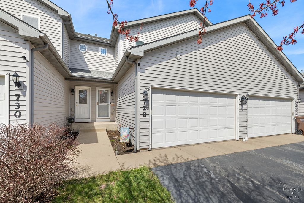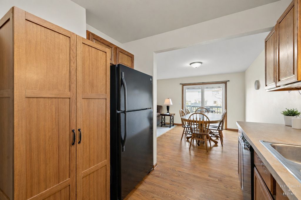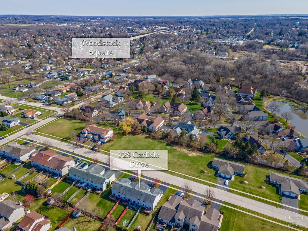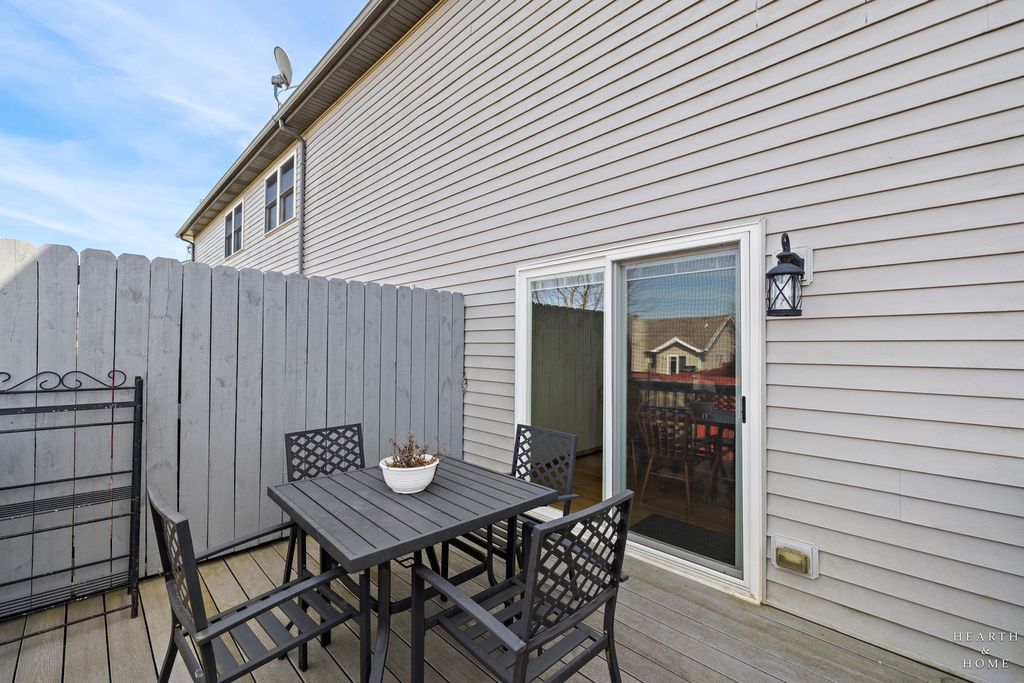 Two story townhome with extra-large full basement in Woodstock's coveted Prairie Terrace development. Bright and open floor plan allows for ease of circulation. Stylish kitchen with hardwood flooring and black appliances. Ideally situated near the bustling Square and all its year-round activity, commuter train, schools and Olson Park. Relish your privacy with fully fenced yard and new deck. This property boasts no association fees! Numerous big-ticket items already addressed here: seller replaced windows (including skylight) in 2019, new HWH, furnace and A/C in 2020 and installed new deck, privacy fence in 2022. Attic space boasts loads of room for storage and attached 2/car garage a plus!