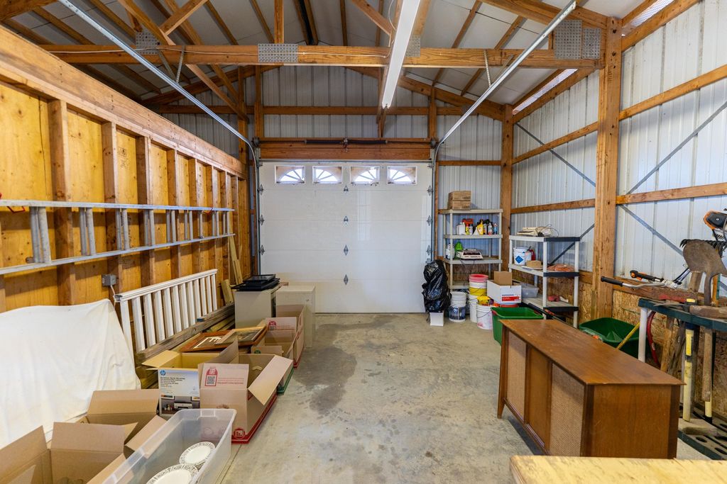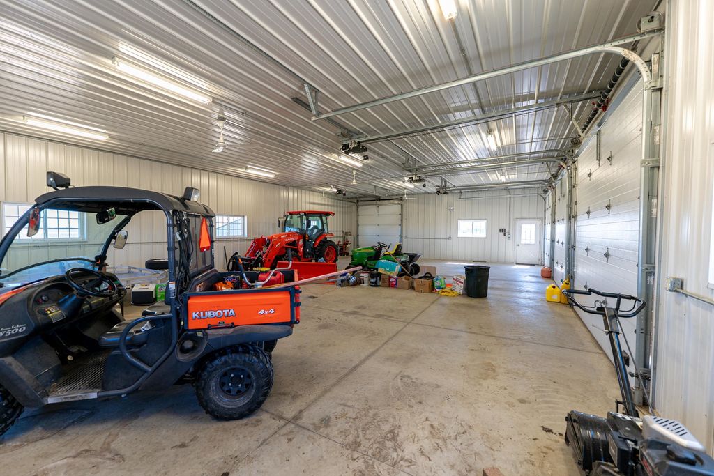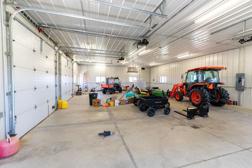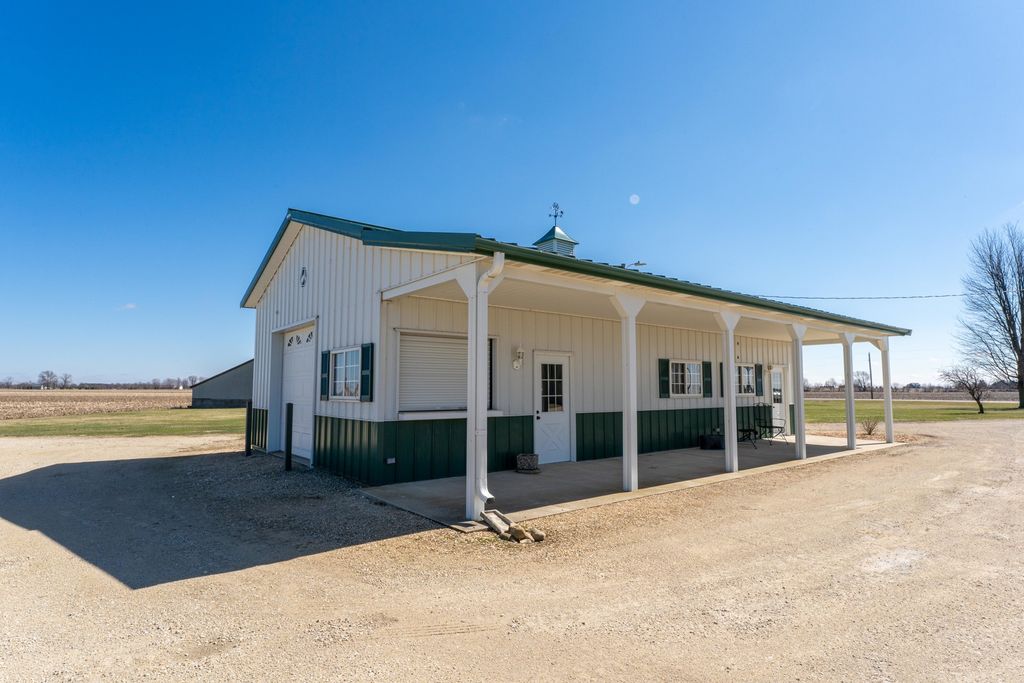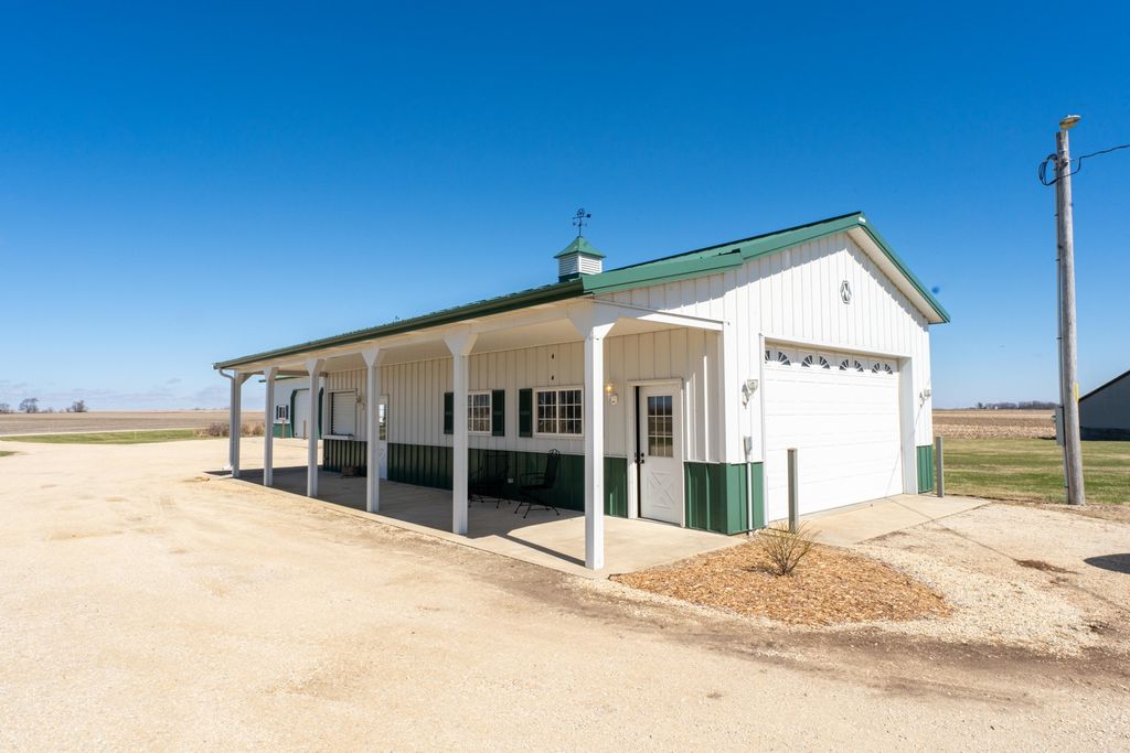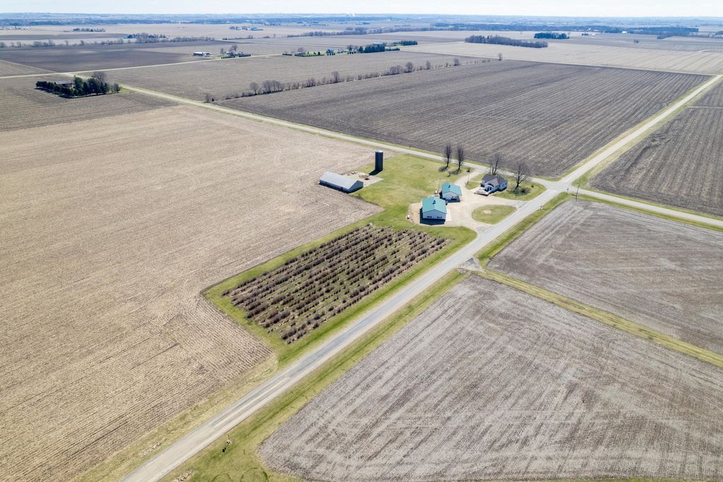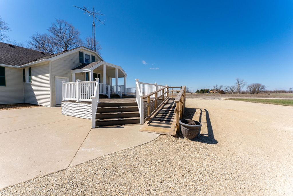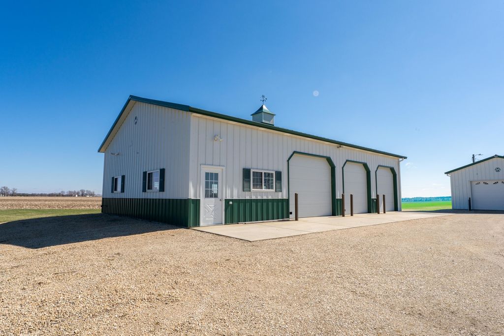 Located in a rural setting just outside of Rochelle, this Ogle County property offers a combination of residential living, functional outbuildings, and open space suited for a variety of uses. The layout provides separation from nearby properties while still maintaining access to town, making it a practical option for those looking for acreage with usable improvements. The farmhouse sits in a central position on the property and has been maintained with attention to its original layout while providing functional living space. Inside, the home features a natural flow between the kitchen, dining area, and family room. The kitchen is equipped with a large amount of cabinet storage and counter space, allowing for meal preparation and daily use. An eat-in island provides space for informal dining, while a separate dining room offers additional room for gatherings. The dining area connects directly to an oversized family room, creating a continuous main living space. The main level of the home includes two bedrooms and a full bathroom, offering convenient access without the need for stairs. Upstairs, there are two additional bedrooms along with space designated for a second bathroom that is ready for installation. This layout provides flexibility depending on how the home is used. From the kitchen, there is direct access to a back deck that overlooks the outbuildings and open areas of the property. This outdoor space connects the home to the working portions of the acreage and allows for easy movement between the structures. The outbuildings are a key component of the property and offer a range of uses. The primary building measures approximately 36 by 56 and is set up as a fully functional shop. It includes three overhead doors on one side for vehicles and an additional door for larger equipment access. The building is equipped with heat, hot water, floor drains, and extensive lighting. This setup supports equipment storage, maintenance work, or workshop use. A second building measures approximately 24 by 44 and includes a concrete floor. While currently unfinished, it provides a solid structure that can be completed and adapted for additional storage, workspace, or other uses. The design includes overhead doors on both sides, allowing for drive-through access that can accommodate trailers, boats, or equipment. An 80 by 40 open lean-to structure adds additional covered storage. This area is suitable for equipment, machinery, or vehicles and is positioned alongside a large concrete parking area that supports easy access and maneuverability. The open ground surrounding the buildings provides space that could be used for pasture, fencing, or general outdoor use. The layout supports the addition of livestock areas or continued use as open ground, depending on the next owner's plans. This property combines a maintained farmhouse with multiple functional outbuildings and open acreage in a location that is a short drive from Rochelle. Its structure and layout support a range of uses, including residential living, equipment storage, and agricultural activities.