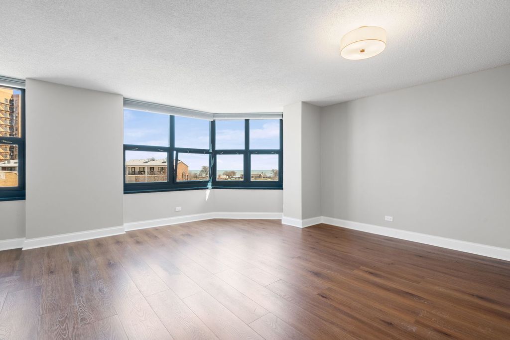 Stunning unobstructed lake and harbor views from this rehabbed 5th-floor junior 1BR/1BA end unit with approx. $30K in improvements. Bright, open-concept layout with wall-to-wall windows, great natural light, and wood-look laminate flooring throughout. Updated kitchen with new stainless steel appliances, upgraded cabinetry, and new countertops. Bathroom refreshed with updated tile, fixtures, new sink, and refinished soaking tub/shower combo. Fresh paint, designer window treatments, and move-in ready condition. Ample storage. Assessments include heat, A/C, water, cable, and internet-only; electric is separate (HOA $371 + $65 cable/WiFi). Full-amenity building with 24-hour door staff, recently upgraded high-speed elevators, fitness center (membership available), party room, rooftop deck, bike room, and attached garage parking available for rent. Strong reserves (~$2.5M). Pet-friendly. Prime Lakeview East lakefront location near the lakefront, dining, shopping, and transportation.