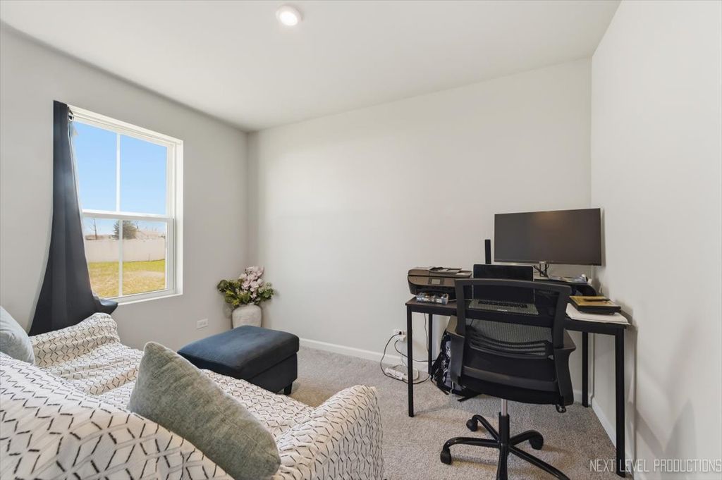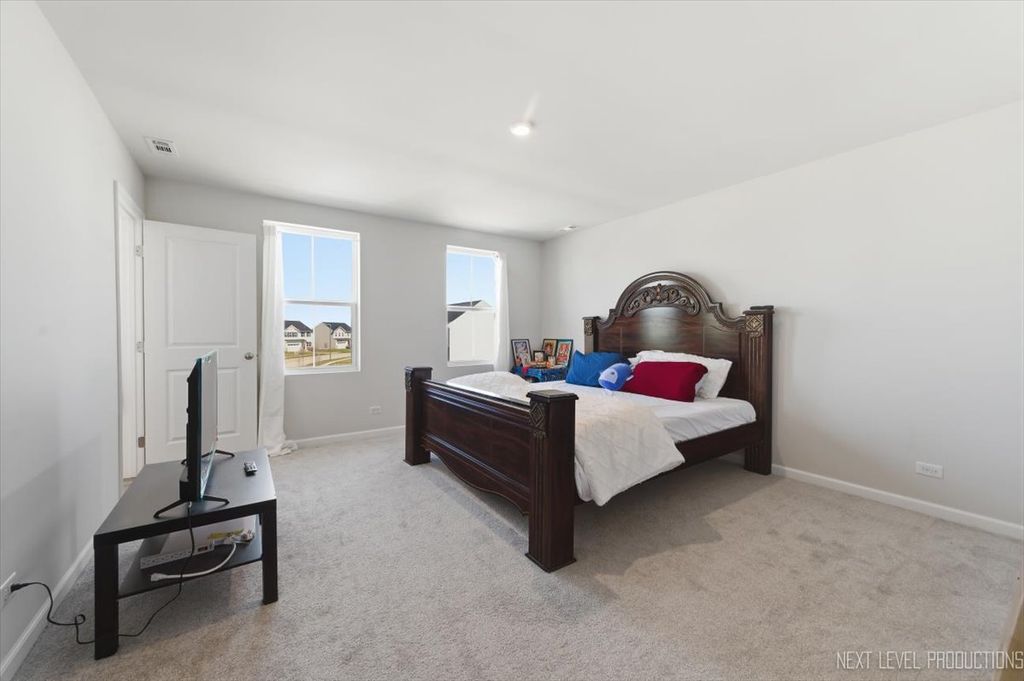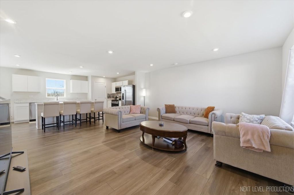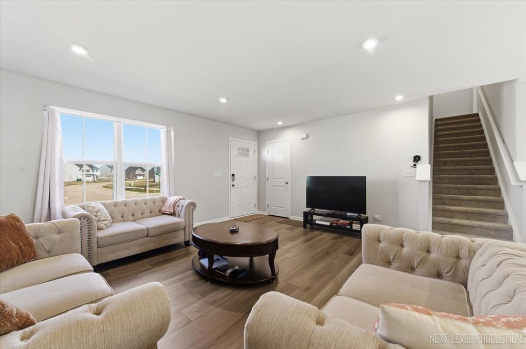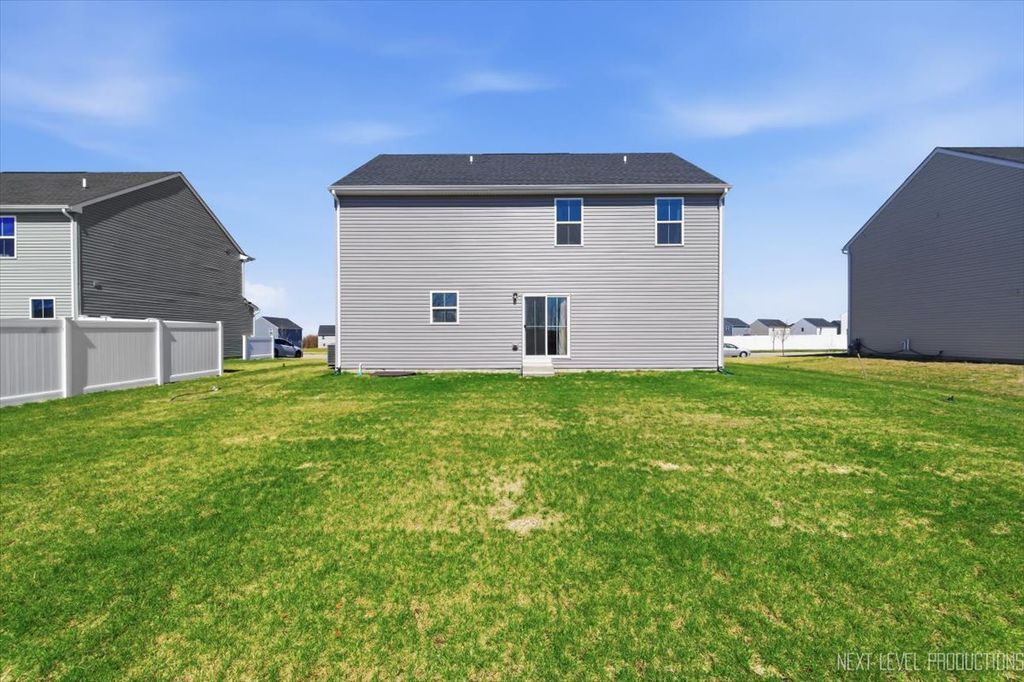 Beautiful like new 5 bedroom, 2.5 bath vinyl and stone two story home built in 2025 in the desirable Deer Crossing neighborhood of Plainfield, offering modern design, space, and everyday convenience. Set on a landscaped lot with a covered front porch and 2 car attached garage, this newer home welcomes you with wood laminate flooring, recessed lighting, neutral decor, and a flowing open floor plan. The spacious family room opens to an eat in kitchen featuring an island, breakfast bar, and stainless steel appliances, with an adjacent dining room that includes a slider to the backyard for easy indoor outdoor living. A first floor home office provides the perfect work from home setup. Upstairs, you'll find five generously sized bedrooms including a primary suite with a private bath and double bowl vanity, along with the convenience of a second floor laundry room. The full unfinished basement offers endless potential for future living space or storage. Additional features include a smart thermostat and a prime location close to schools, shopping, dining, and the expressway.