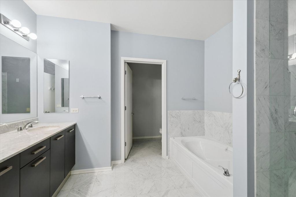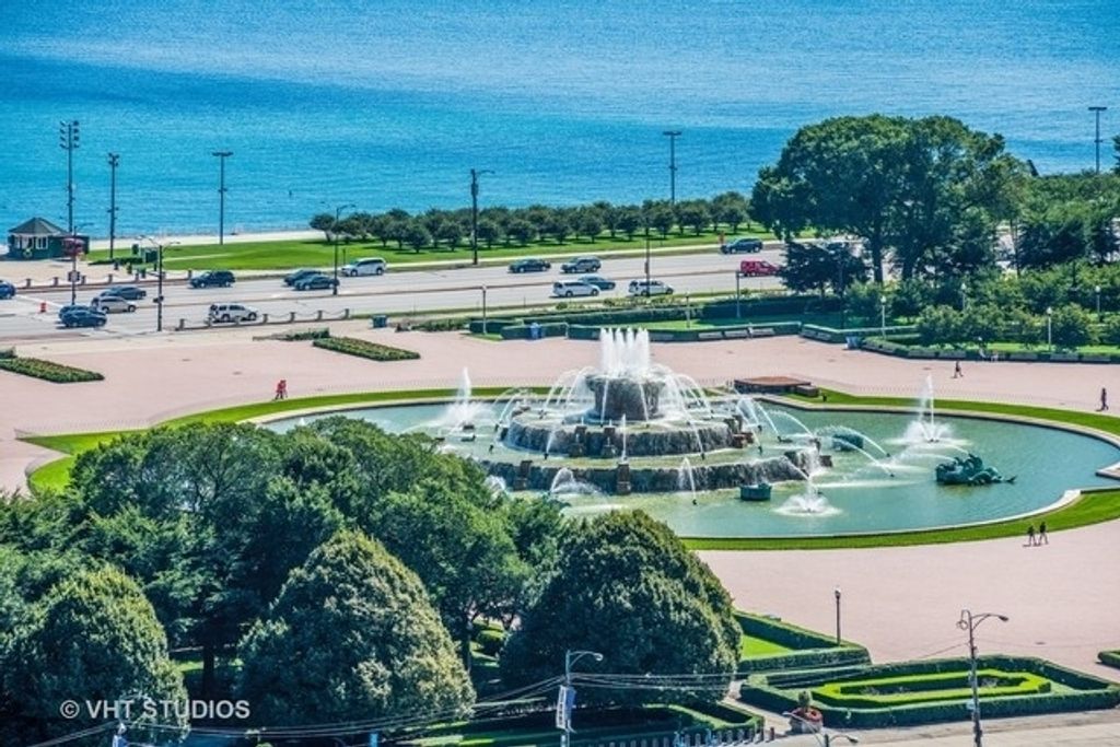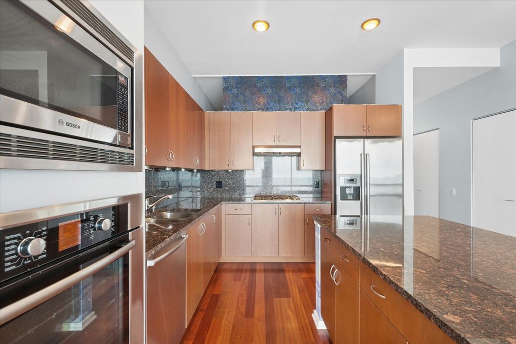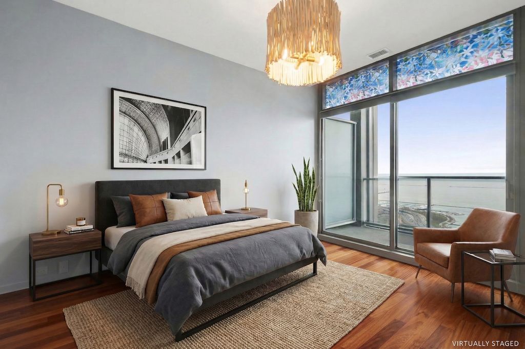 Wide open visions of lake Michigan the minute you walk in the front door, expansive lake, park and city views from walls of glass with 10ft ceilings, dual entry to large covered balcony from living room and bedroom, custom stained wood floors through out, designer Lightology lighting, wide open floor plan makes the large kitchen island the center for gracious entertaining, kitchen features lots of counter space, undercabinet lighting, built in wall oven and microwave plus large double pantry closet, primary bedroom features large walk in closet plus spacious white marble bathroom with oversized vanity, soaking tub, spacious shower and private water closet, secondary bedroom has two double closets and is right across from the guest bath perfect for privacy, full laundry room with side by side washer and dryer, parking can be purchased or rented