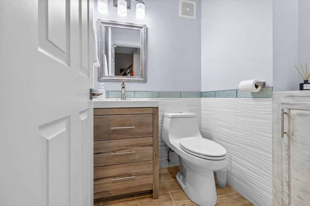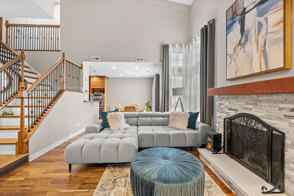 Absolutely beautiful, highly upgraded 3-bedroom, 2.1-bath townhome offering 1,499 sq ft of bright, open living space. Featuring soaring ceilings, hardwood floors throughout, and recessed lighting, this home feels both spacious and inviting. The main level showcases an open kitchen designed for entertaining, granite countertops, stainless steel appliances, and 42" custom cabinetry. An office room on the first floor provides the perfect space for working from home or additional flexibility. The comfortable living room with a fireplace opens to a private patio-ideal for relaxing or hosting guests. Upstairs, the vaulted primary suite includes a walk-in closet and private bath, along with two additional spacious bedrooms and a full bathroom. Hardwood stairs with modern railings add to the home's appeal. Additional features include a 2-car attached garage, heated kitchen floors, and a heated garage, and recent updates: windows (2021), AC (2024), humidifier (2024), washer & dryer (2025). Ideally located near expressways and Metra. Impeccably maintained and move-in ready-Welcome Home!