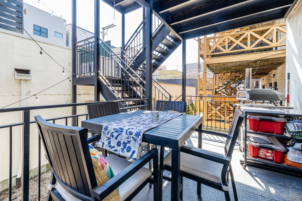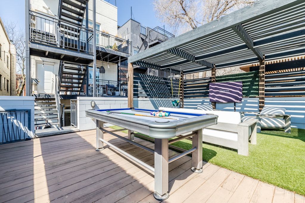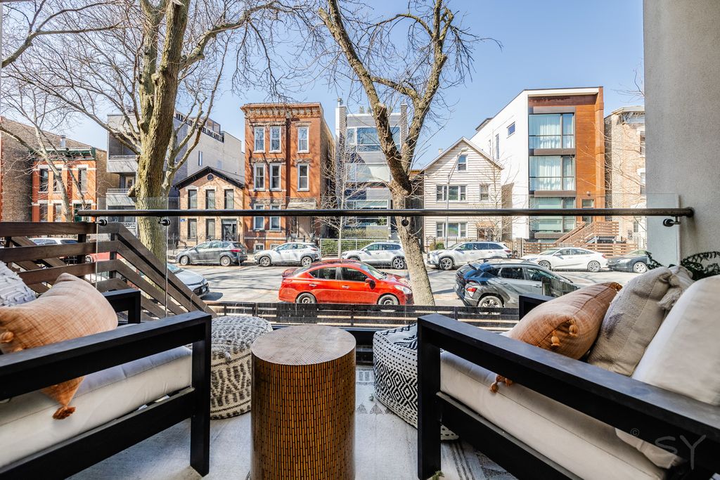 Welcome to this stunning West Town 3-bedroom/2.1-bathroom duplex down that truly lives like a single-family home. Designed with an expansive open-concept layout, the main level flows seamlessly between the living, dining, and oversized kitchen/family room, making it ideal for both everyday living and effortless entertaining. The beautifully appointed kitchen showcases sleek custom cabinetry, quartz countertops, SS appliances, and a large island with seating. The adjoining family room is anchored by a custom built-in wall unit, which provides the perfect combination of storage, workspace, and design. Step outside to one of three private outdoor spaces: a front balcony, a rear deck, and an impressive garage roof deck complete with a pergola and turf, your own private retreat in the city. The lower level offers exceptional ceiling height and a well-designed layout featuring three spacious bedrooms, including a luxurious primary suite with a spa-like bath, double vanity, separate shower, and ample closet space. Two additional bedrooms, a full bath, and in-unit laundry complete the level. Additional highlights include a powder room on the main level, abundant storage throughout, and garage parking included. All of this located on a quiet, tree-lined street just steps from the best of West Town, restaurants, nightlife, shopping, and easy access to public transit.