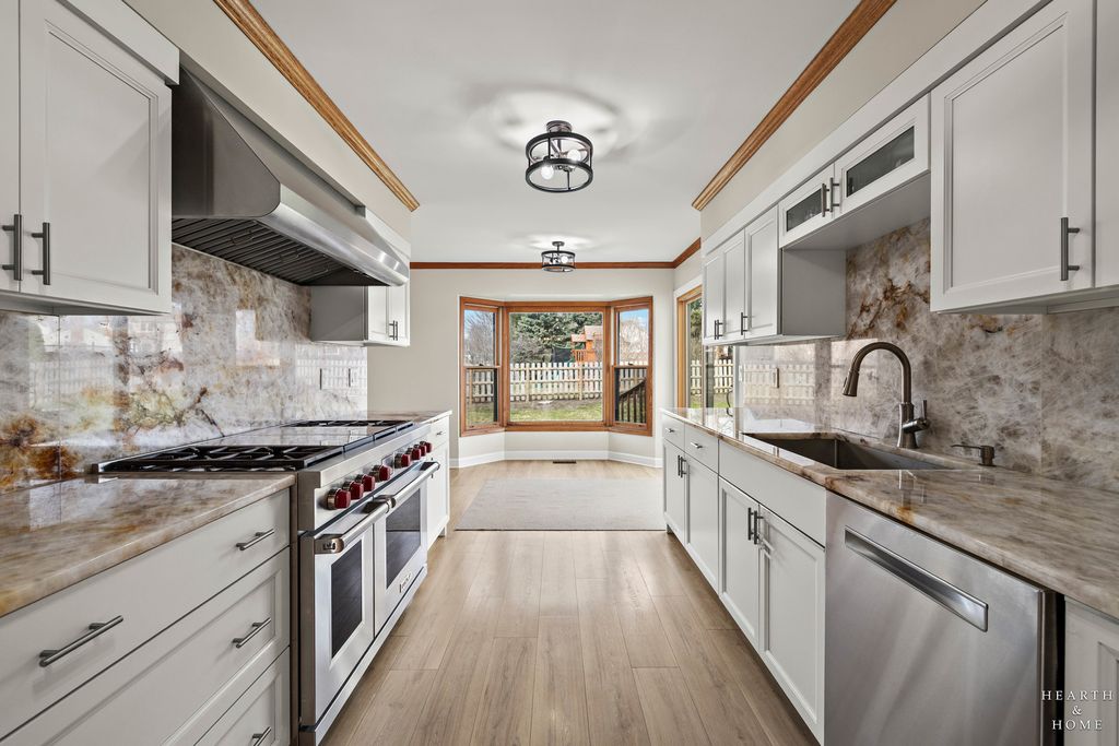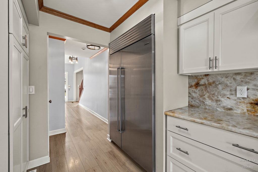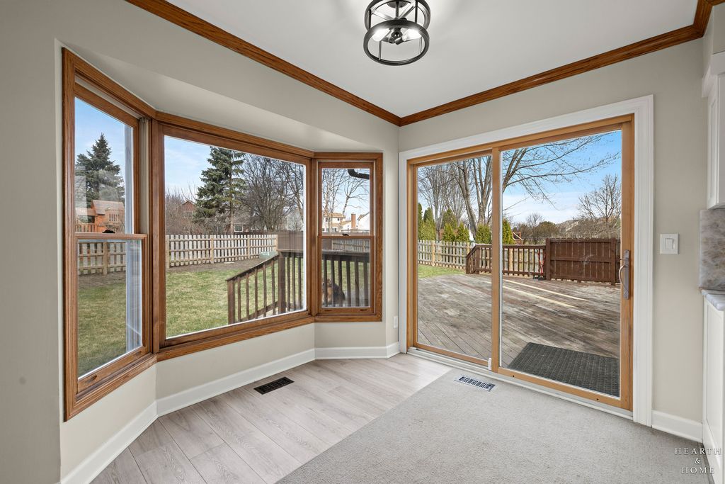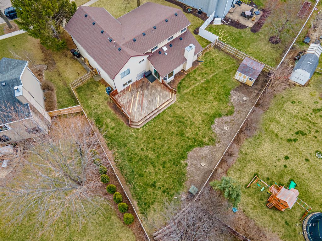 This spacious home offers 5 bedrooms, 3.1 baths, and a 2-car garage with a layout designed for both function and flow. Step inside to high ceilings and a seamless connection between the living and dining areas, creating an open and inviting feel. The kitchen was fully renovated in 2022 and is a true standout, featuring Amish custom cabinetry, Lumix quartzite countertops and backsplash, a Sub-Zero refrigerator, and a 48-inch Wolf range, built for both everyday living and entertaining. The main level also includes a cozy family room with a brick fireplace, a first-floor laundry room, and a versatile office space with built-in cabinets. Upstairs, you'll find a spacious layout with two staircases leading to the second level, adding both convenience and character. The primary suite offers a private retreat with a lit-up vanity, separate shower, drop-in tub, and a large walk-in closet. Recent updates include new LVP flooring and carpet (2021), a new roof (2021), and a new fence (2023). Outside, enjoy a huge fenced backyard with a large deck and shed, perfect for entertaining or relaxing.