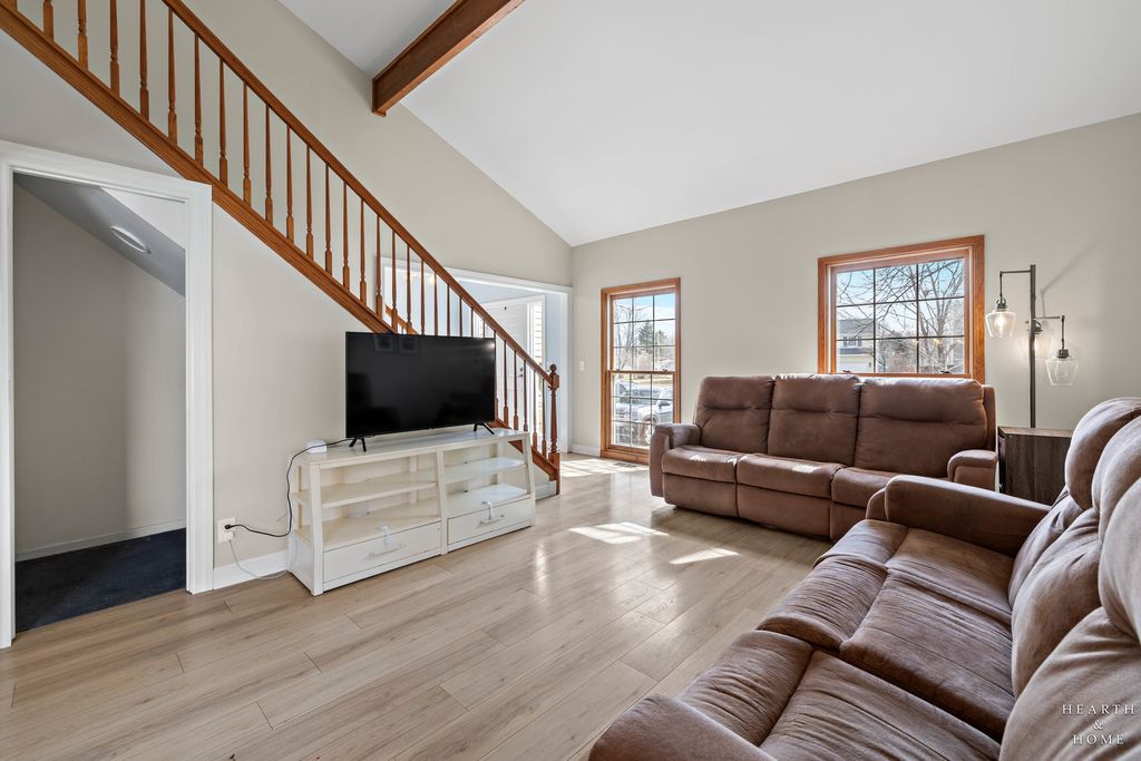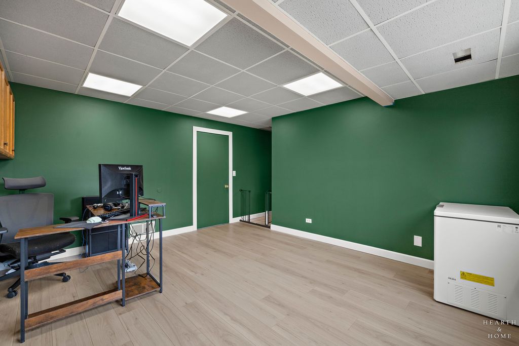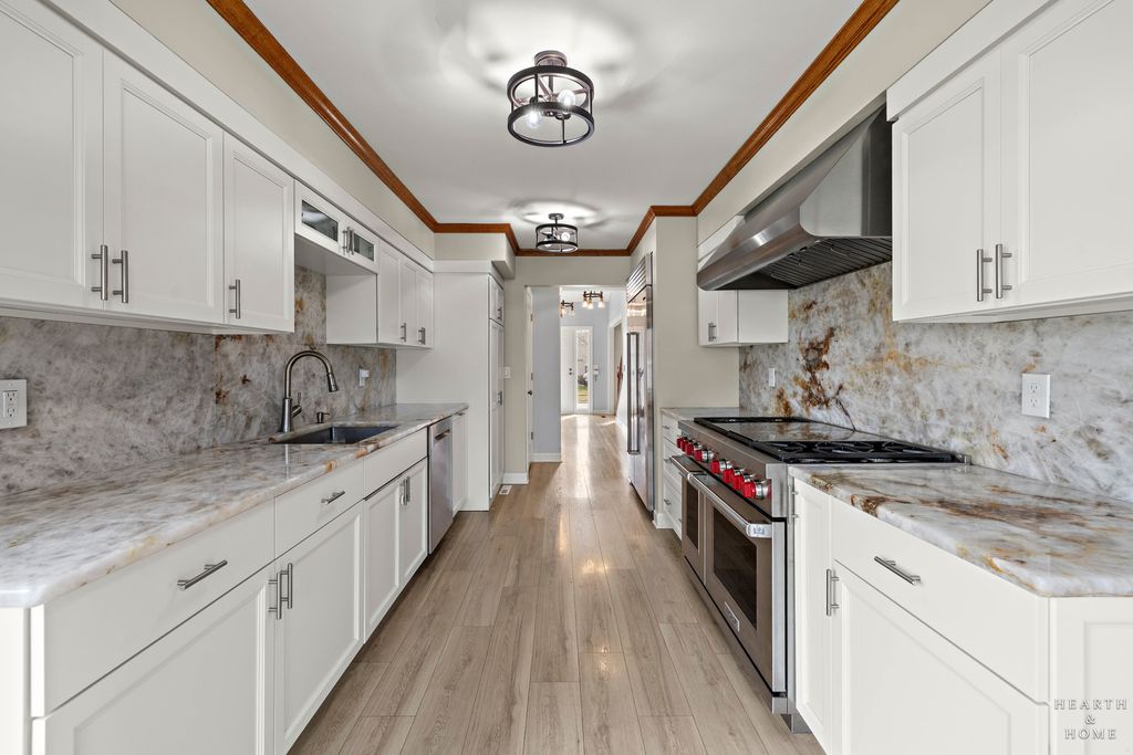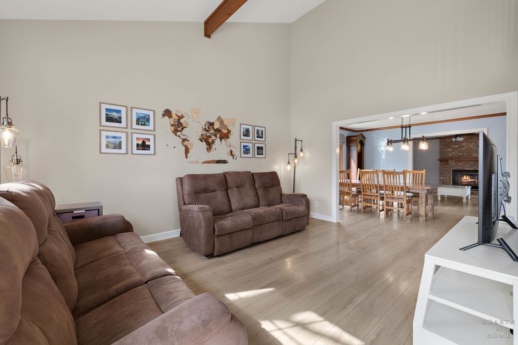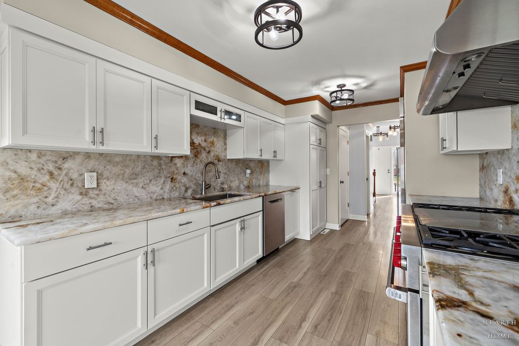 This spacious home offers 5 bedrooms, 3.1 baths, and a 2-car garage with a layout designed for both function and flow. Step inside to high ceilings and a seamless connection between the living and dining areas, creating an open and inviting feel. The kitchen was fully renovated in 2022 and is a true standout, featuring Amish custom cabinetry, Lumix quartzite countertops and backsplash, a Sub-Zero refrigerator, and a 48-inch Wolf range, built for both everyday living and entertaining. The main level also includes a cozy family room with a brick fireplace, a first-floor laundry room, and a versatile office space with built-in cabinets. Upstairs, you'll find a spacious layout with two staircases leading to the second level, adding both convenience and character. The primary suite offers a private retreat with a lit-up vanity, separate shower, drop-in tub, and a large walk-in closet. Recent updates include new LVP flooring and carpet (2021), a new roof (2021), and a new fence (2023). Outside, enjoy a huge fenced backyard with a large deck and shed, perfect for entertaining or relaxing.