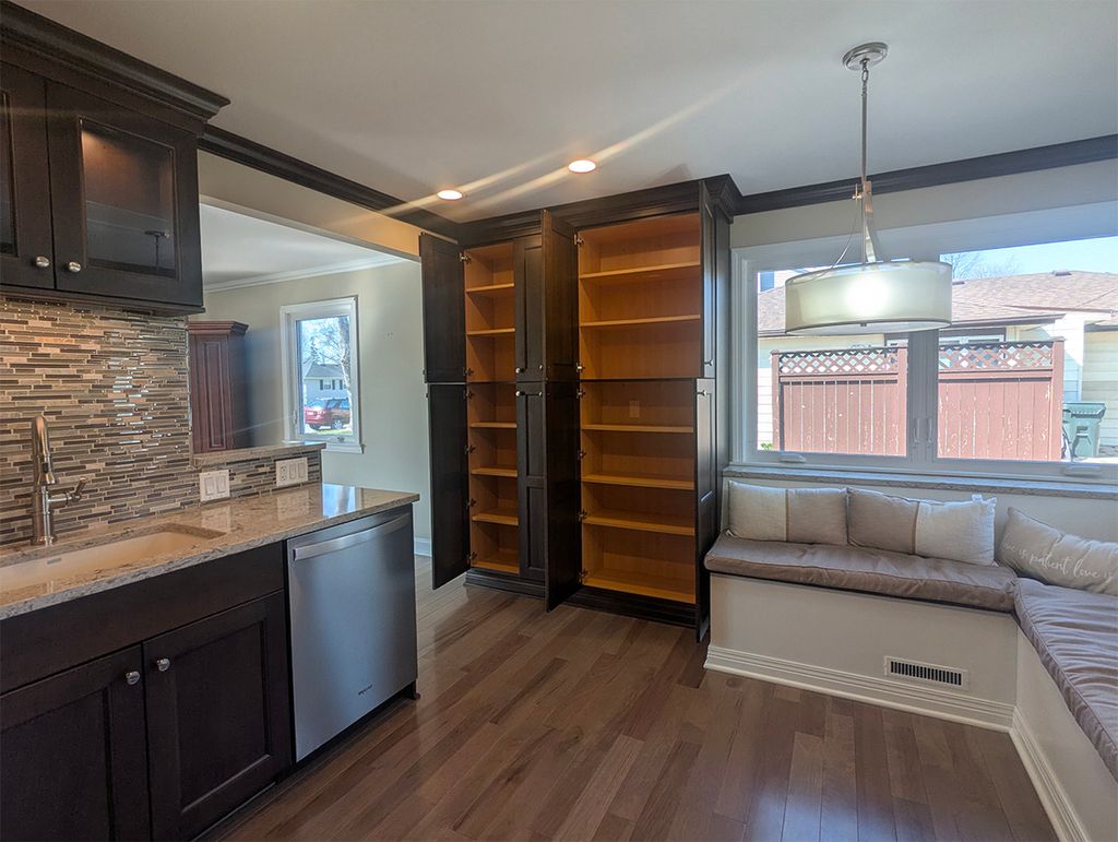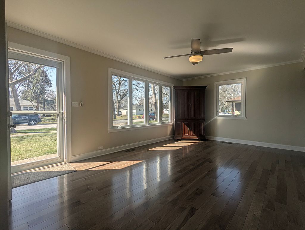 Superior style with high-end expensive updates totaling over $129,000, excellent curb appeal, and a quiet street give this 3 BR 2 BA ranch with a 1-car detached garage on a quiet street a Number One ranking. LR has lots of natural light with south-facing big window, 5/8" thick hickory hardwood floors (5" planks), high baseboards, crown molding, new wood tone ceiling fan with light, and fresh paint. Half wall separates LR to fully remodeled (down to the studs) $62,000 gorgeous, freshly painted and reconfigured kitchen. Features include the same hickory hardwood floors and crown molding, plenty of cherry cabinets, granite counters, glass & stone tile backsplash, large inset sink, under cabinet lighting, recessed ceiling lights, Whirlpool stainless appliances (over $6,000): refrigerator, gas stove, dishwasher, microwave. Note the large floor-to-ceiling cherry built-in pantry and the cushiony custom banquette under the 3 windows. A contemporary barrel-style silver hanging light fixture will showcase the buyer's table by the banquette. Stackable washer/dryer is outside the kitchen. New (3/26) luxury carpet is in the 2 secondary freshly painted bedrooms, and each bedroom has a stylish ceiling fan and 2 windows. Eye dazzling hall bathroom was taken down to the studs and remodeled at a cost of over $20,000...new tub with niche for products, toilet, custom tile work, heavy glass sliding shower doors, cherry vanity with granite top with a mica flake, chrome faucets, silver mirror, rain shower head, beautiful 24x24 diagonal Florentine Carrera floor tile, new light fixtures and exhaust fan. Spacious MBR suite is at the back of the house and has a coffered ceiling, new wood-tone ceiling fan with light, new carpet (3/26), fresh paint and tons of natural light with a window to the west and 3 to the north. MBA was gutted and has a white vanity (single sink) with granite top, brushed nickel fixtures, new toilet, shower with handheld and overhead rain shower fixtures. Rheem 40-gallon hot water heater (2023) with new copper pipes. New roof (complete teardown to rafters), siding, insulation, gutters, downspouts, soffits, shutters. And on garage-- new roof, siding, gutters, downspouts, soffits. All 2017; new side door on garage 2018. Secondary bedrooms each had one of the two windows replaced in 2017 along with the small LR window. 6-panel white doors. Trane furnace. New attic duct work was approx. $1,200. Radon remediation system in place. Crawl space has pea gravel and heavy plastic covering. PVC and copper plumbing upgrade in the crawl (galvanized plumbing replaced) Meticulous house, great location close to schools, shopping, major routes. Polished Perfection! Don't miss out.