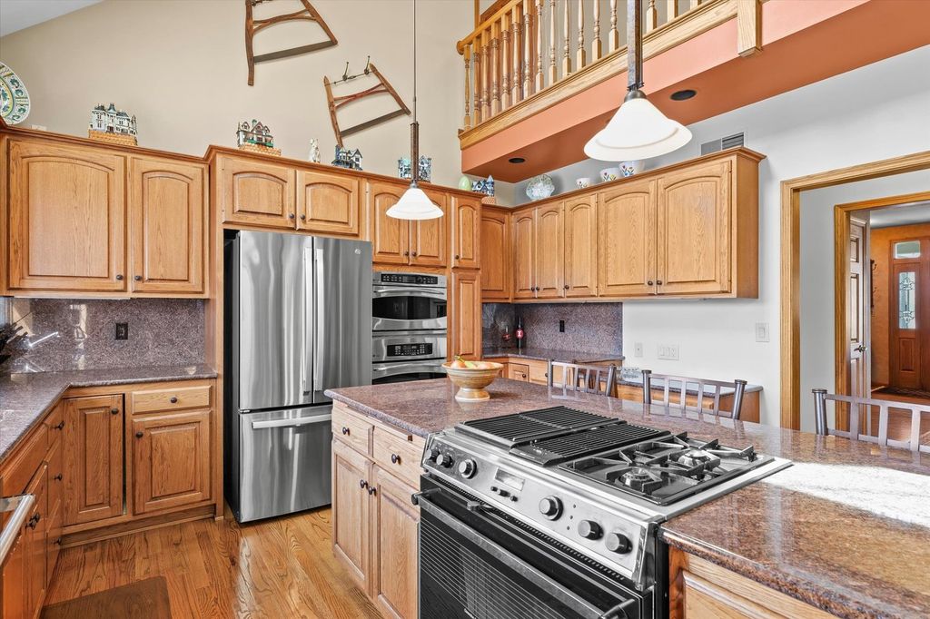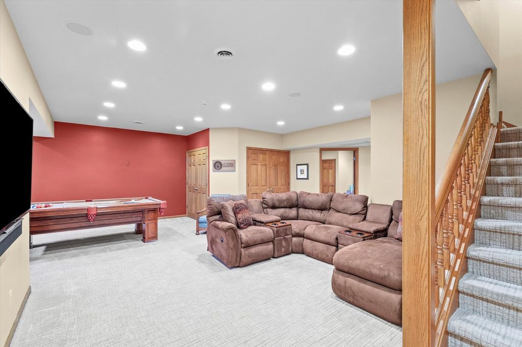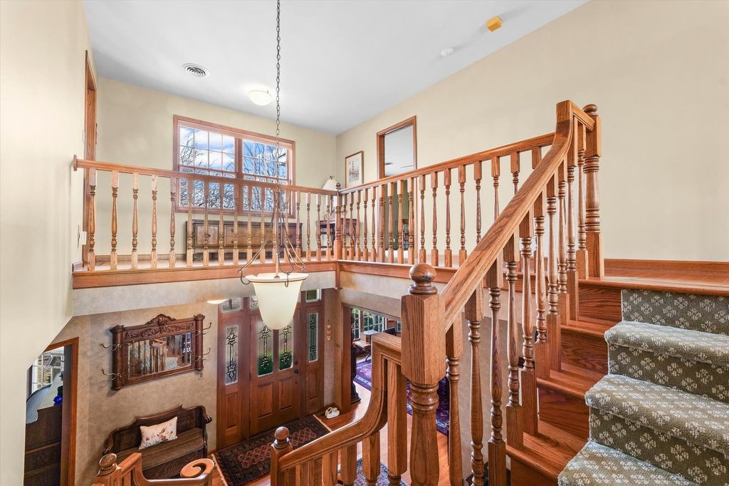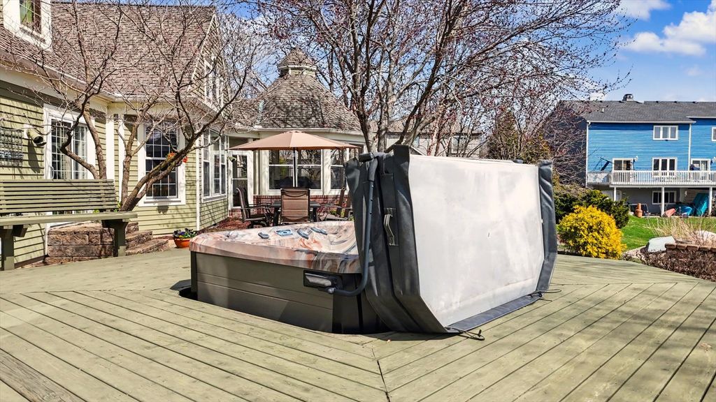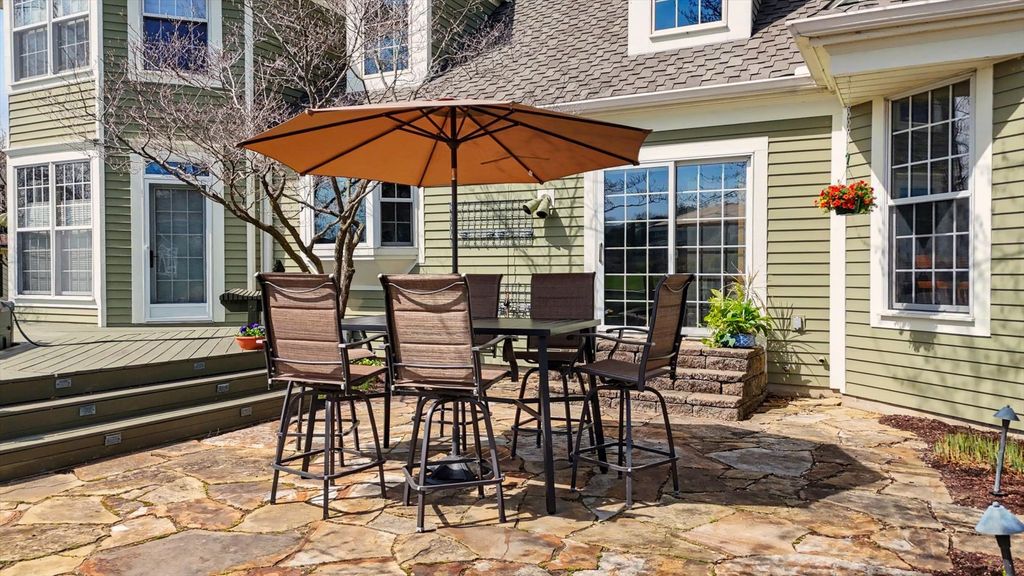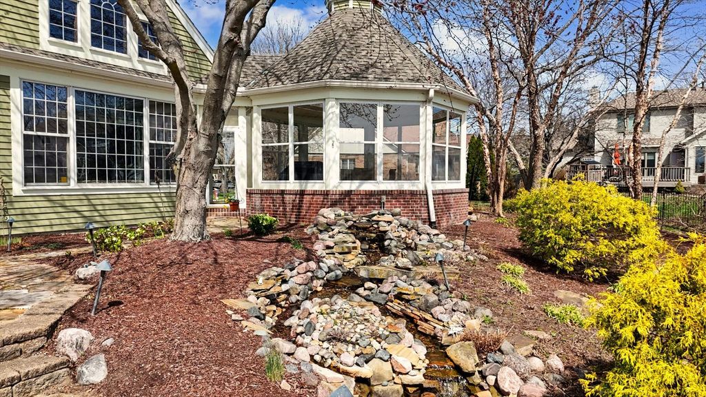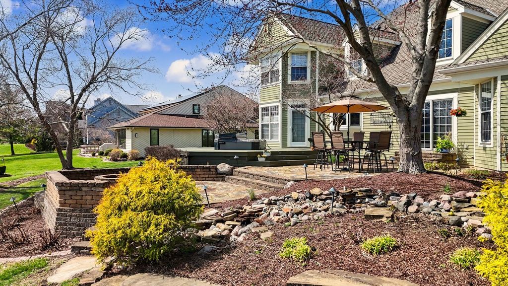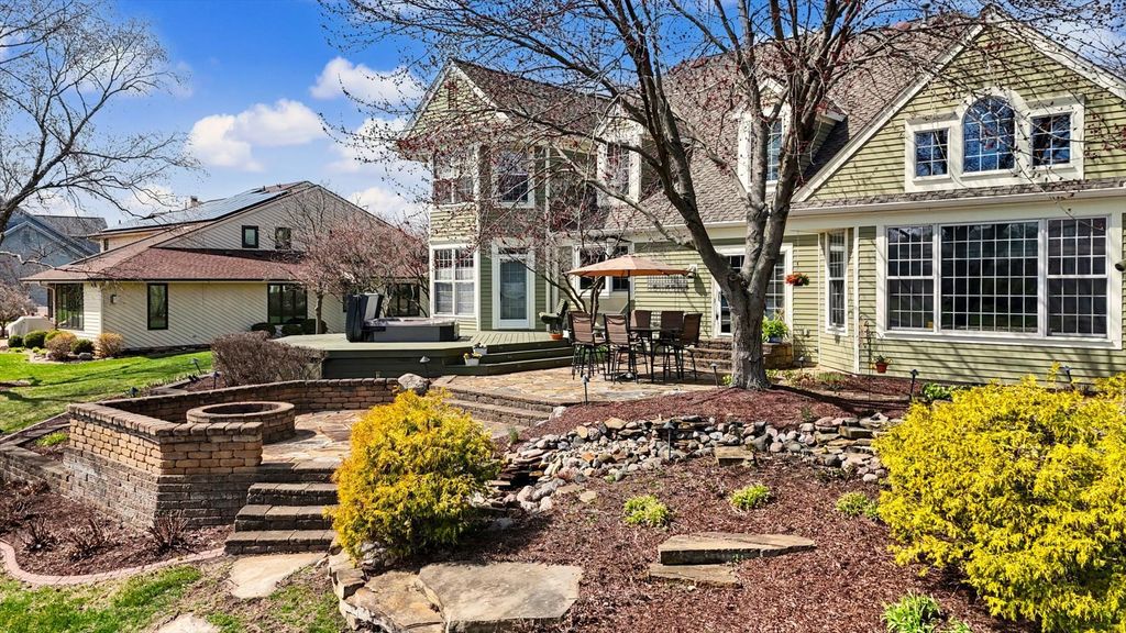 Set along the water on one of the largest lots in Robeson Meadows, this home offers a layout that's designed to give everyone their own space while still bringing people together in all the right places, all within a setting that feels connected to the outdoors and the community around it. A grand entry with rich wood flooring and a sweeping staircase creates a strong first impression and sets the tone for what's to come. At the center of the home, the kitchen features a large island for gathering, surrounded by abundant cabinetry and prep space. Skylights above bring in natural light, keeping the space bright and inviting throughout the day. Just off the kitchen, a separate formal dining room offers a more traditional setting for hosting dinners or special occasions. The family room is where the home really opens up, with soaring cathedral ceilings and warm wood detail that draw your eye upward. Expansive windows line the back wall, framing water views and creating a seamless connection to the outdoors. The overall layout feels open yet intentional, giving you room to spread out while still feeling connected. The primary suite is tucked away and truly lives like its own retreat, complete with water views and direct access to the back patio. The en suite bath features dual vanities, a soaking tub, heated floor, and a full body spray steam shower, creating a space that feels both private and elevated. Upstairs, you'll find three generously sized bedrooms, each with walk-in closets. One bedroom includes its own private bath and is comparable in size to the main level primary suite, offering flexibility for how the home lives day to day, whether that means a second primary option or a setup that works well for multi-generational living. The remaining two bedrooms are connected by a Jack-and-Jill bathroom. The lower level adds even more versatility with a large recreation space, dedicated game area, home gym, and a custom wine cellar that feels like its own destination within the home. Outside is where this property truly stands apart. The backyard has been thoughtfully designed to feel like an extension of the home, offering multiple spaces to relax and gather. Enjoy meals on the stone patio or under the gazebo, unwind around the built-in firepit, or end the day in the hot tub overlooking the water, just steps from the primary suite's exterior access. With the lake right in your backyard, you can spend your days kayaking, fishing, or even ice skating in the winter. Beyond the home itself, Robeson Meadows offers walking trails, two parks, pollinator gardens, and a strong sense of community with neighborhood events throughout the year, making this not just a home but a lifestyle. Additional updates include a new refrigerator in 2024, main AC and furnace replaced in 2021, hot water heater replaced in 2022, roof replaced in 2018, and a new wine cellar cooling unit installed in 2023. The home has also been pre-inspected for added peace of mind.
