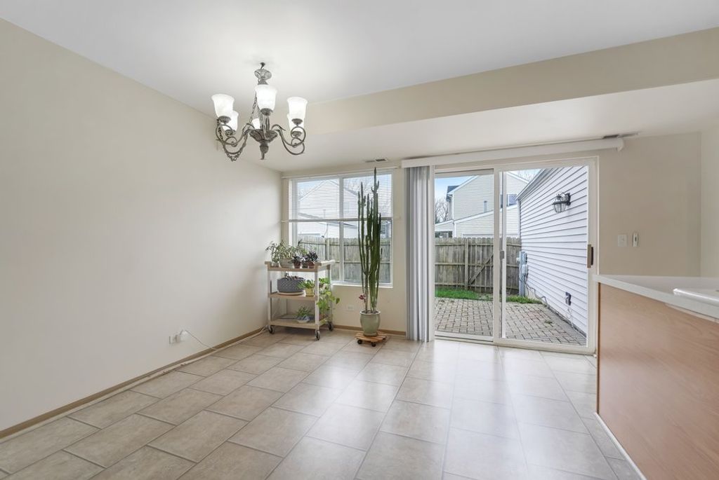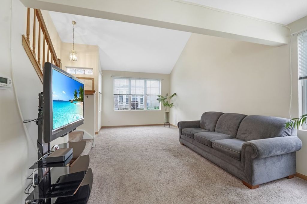 Rarely available Station model offering a spacious and functional layout with a dramatic first impression-the high vaulted ceiling in the living room creates an open, airy feel the moment you step inside. The first-floor primary suite offers convenience and privacy, complete with a walk-in closet and an en-suite bath with a dual vanity. Upstairs, you'll find two additional bedrooms along with a generous loft space perfect for a home office, play area, or second living space. The kitchen includes a separate eating area and a pass-through view into the living room, keeping the space connected and practical for everyday living or entertaining. Step outside to a privacy fenced backyard with a large paver patio - perfect for relaxing. Enjoy a low-maintenance lifestyle with an HOA that covers lawn care, snow removal, roof, and siding. Additional highlights include an attached two-car garage and a prime location just blocks from the neighborhood elementary school. Roof was replaced in 2024, hot water heater 2026. Refrigerator, washer and dryer new within the last 6 years.
