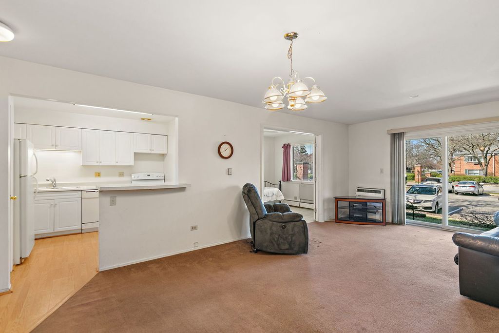 With a few cosmetic updates, this 2-bedroom, 1-bath first-floor unit offers great potential to make it your own. The spacious kitchen features white cabinetry, ample counter space, and a breakfast bar that overlooks the dining and living areas, creating an open floor plan ideal for everyday living and entertaining. The second bedroom, located on the opposite side of the unit from the primary bedroom, features double doors and works well as a den, office, or guest room. The primary bedroom is generously sized at 16' x 11'. Laundry hookup is available in the unit, though the current owners utilize the convenient laundry and storage located directly across the hall. Enjoy the subdivision amenities, including walking paths, a pond, and a pool. Conveniently located near Route 53 and I-90 for easy commuting.