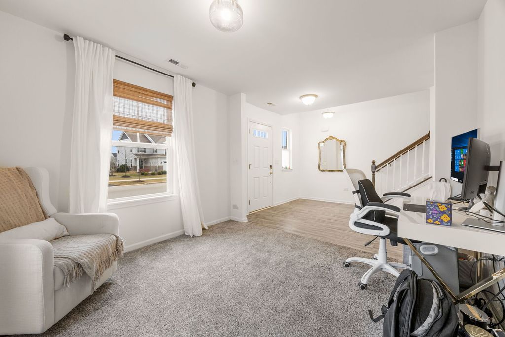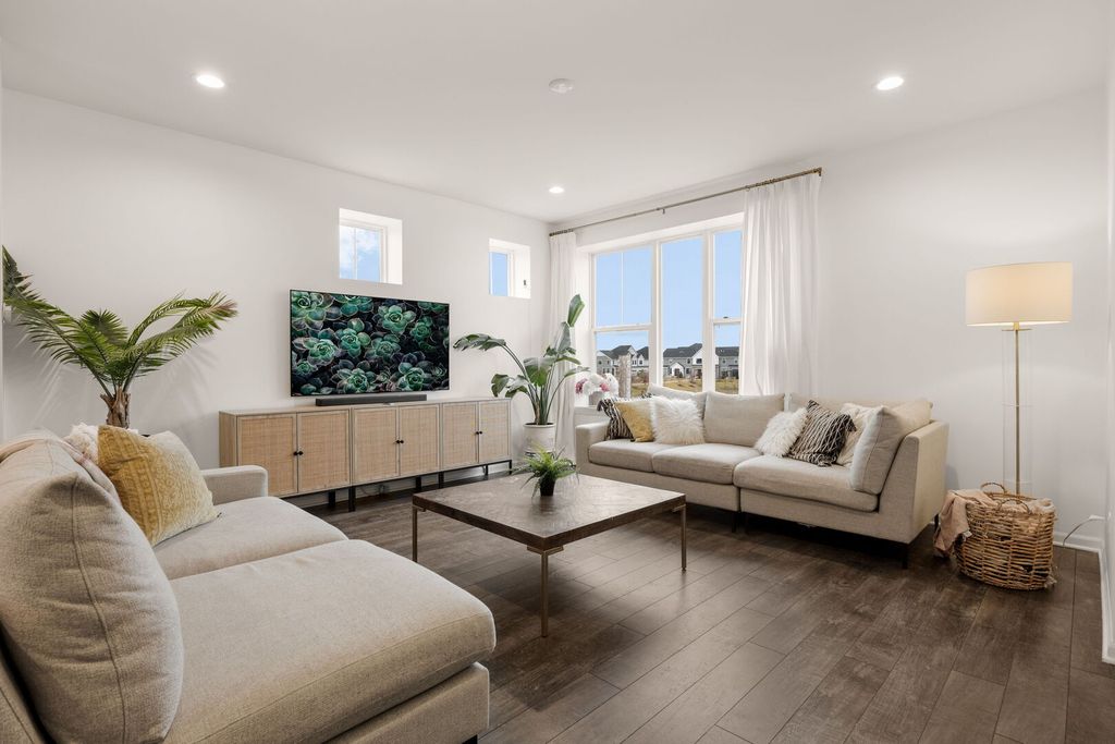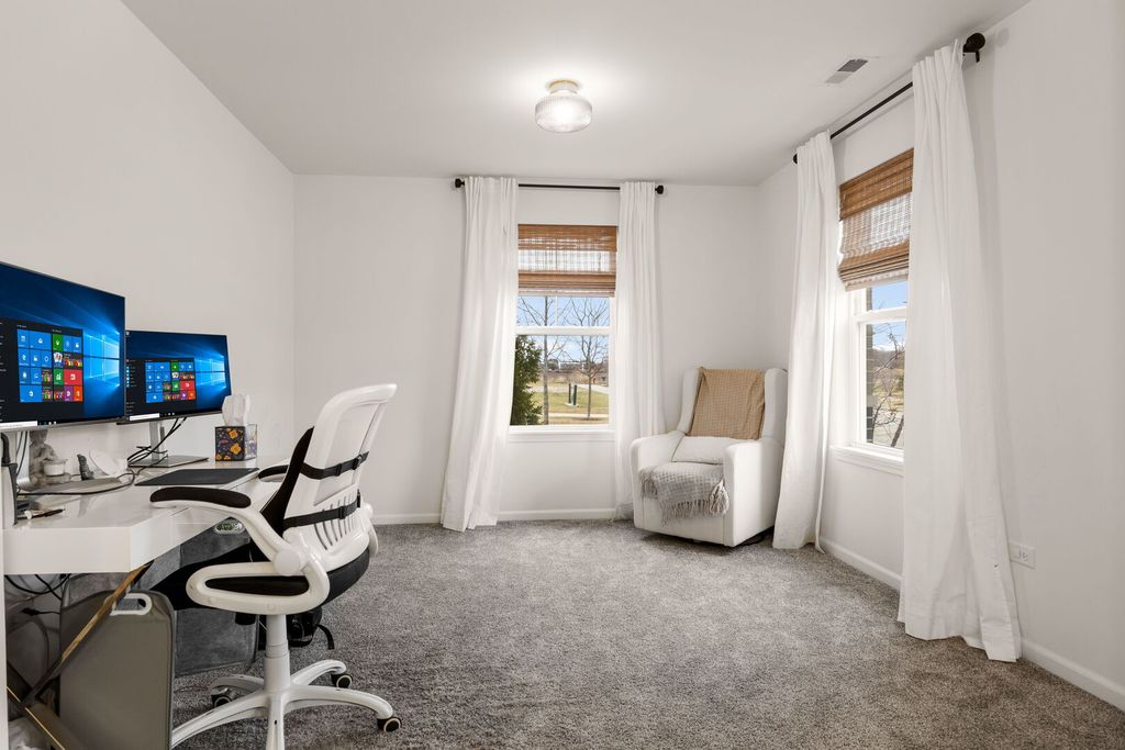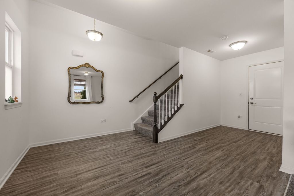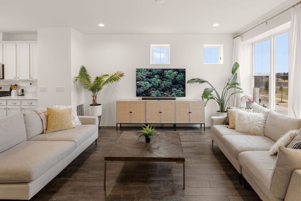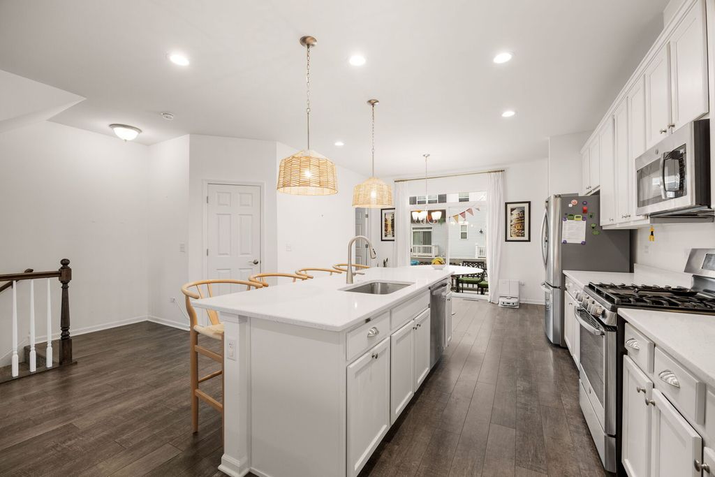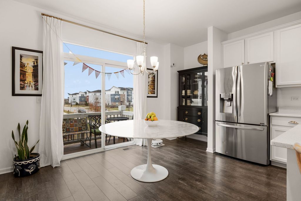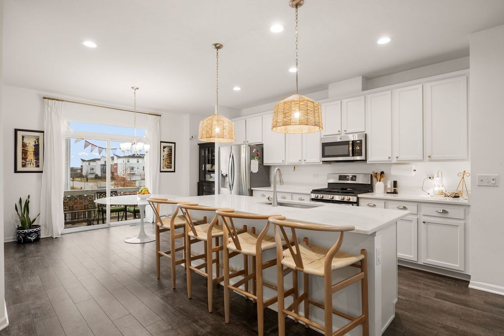 Experience the perfect blend of modern design and tranquil surroundings in this stunning, newer-built townhouse. As a coveted corner unit situated directly next to a lush park and open green space, this home offers a level of privacy and views rarely found in townhome living. The south-facing entrance ensures the interior is bathed in natural light throughout the day, highlighting the airy, contemporary layout. The home features 3 generous bedrooms and 2.5 modern bathrooms, designed with the modern family in mind. The spacious foyer is adjacent to a large entertaining space, with oversized corner windows bringing the outside in. The rich oak rails with white spindles add a touch of elegance to this entryway. Once on the main floor, you land in the center of the open-concept kitchen and family area everybody is after. To the front of the home is the large family room, the middle holds the bright and airy kitchen, and to the rear is a dining room. The wide-planked grey wood laminate floors offer an ideal complement to the 42" contemporary Alpine White cabinets and stunning white and grey quartz countertops. The huge walk-in pantry and over 8' center island are a rare find in a townhome kitchen and sure to please the chef. The spacious eating area is large enough to accommodate a 6-person table and opens up to a beautiful deck where you can overlook the neighborhood while drinking your morning coffee. Tucked in the rear corner of the home is your laundry room, as well as a powder room for your guests. As you make your way to the upper level, you'll find three bedrooms and two full bathrooms. The master suite is the perfect size! You can comfortably fit your king-size furniture set in here and will even have room for some extra furniture and decor. Beyond the convenience of the 2-car garage, you are positioned in a serene neighborhood within the award-winning Naperville School District 204. Enjoy the peace of a quiet community while staying minutes away from the Route 59 corridor, I-88, and premium shopping and dining.