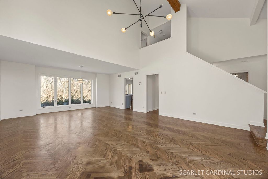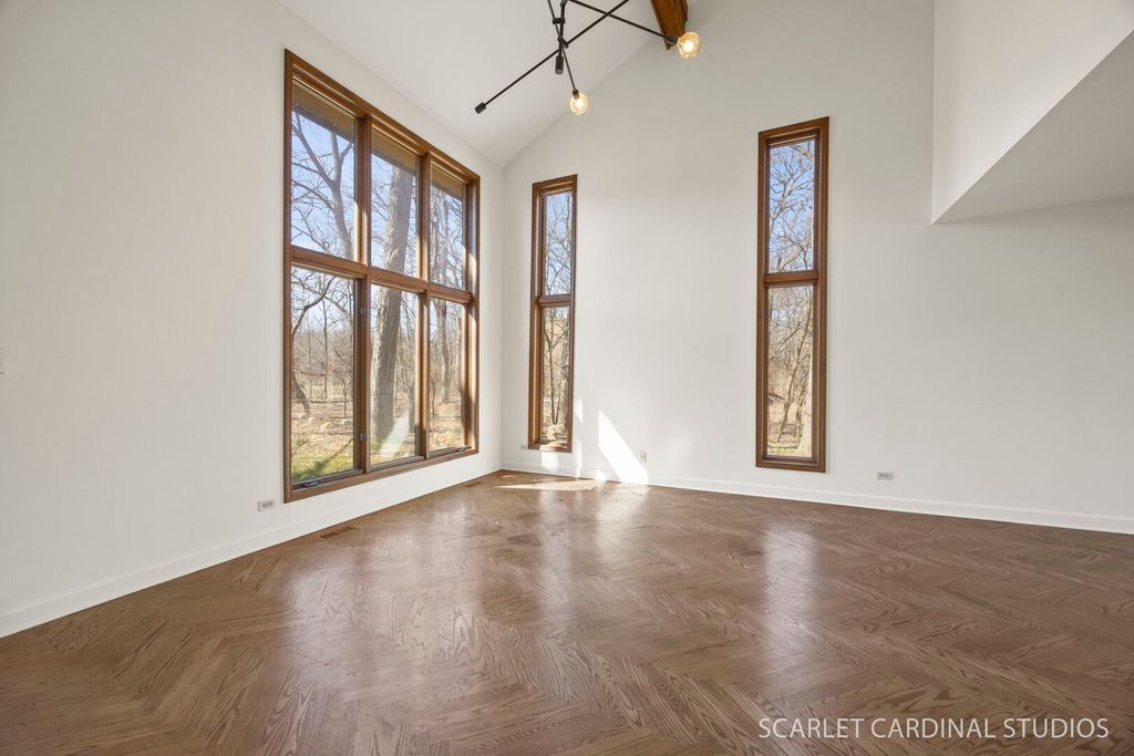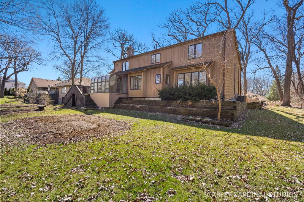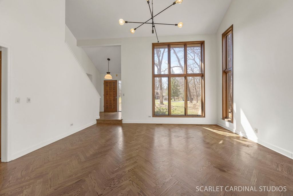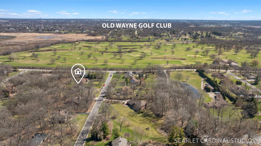 This custom 5 bedroom Airhart home sits on a wooded one acre lot across from the West Branch Forest Preserve and Old Wayne Golf Course, offering a serene, private retreat surrounded by lush landscaping and woods. Expansive windows throughout the home fill the space with natural light and showcase the peaceful setting from nearly every room. The freshly painted contemporary interior features new herringbone-patterned solid oak hardwood floors throughout the main level, creating a warm and sophisticated feel. The soaring two-story living room flows seamlessly into the formal dining room, while the spacious kitchen offers a secondary eating area and opens to the family room with a brick fireplace, heated sunroom and separate greenhouse area. A main floor bedroom can serve as a den/office. Upstairs, the vaulted primary suite is complete with an updated luxury bathroom featuring a standalone tub and walk-in shower. 3 other spacious bedrooms and full hall bath wrapped up the second level. The finished basement expands your living space with a large recreation room, wet bar, and half bath. Additional highlights include an updated powder room, skylights, abundant storage, and a three-car garage. Step outside to enjoy the wraparound deck and tranquil natural surroundings-ideal for relaxing or entertaining. Located within highly rated District 25 schools and just minutes from Wheaton Academy, this home offers the perfect blend of privacy, comfort, and convenience.