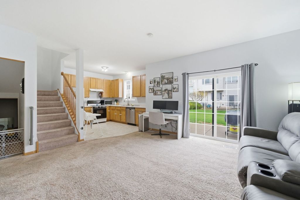 Welcome to this bright and inviting Prairie Ridge townhome, where comfort meets functionality. The open concept main level features 9 foot ceilings and abundant natural light, creating a warm and airy feel from the moment you walk in. The spacious living room flows effortlessly into the kitchen with 42 inch cabinets, a cozy breakfast area, and access to your private patio and yard, perfect for morning coffee or relaxing evenings. Upstairs, you will find three generously sized bedrooms plus a versatile loft, ideal for a home office, second living space, or gaming area. The primary suite offers a walk in closet and a comfortable retreat at the end of the day. This home is truly move-in ready, with major updates already taken care of, including a newer water heater in 2021, washer and dryer in 2023, and refrigerator and dishwasher in 2020. A two car attached insulated and drywalled garage adds even more convenience. If you have been looking for space, natural light, and a layout that just makes sense, this is one you will not want to miss.