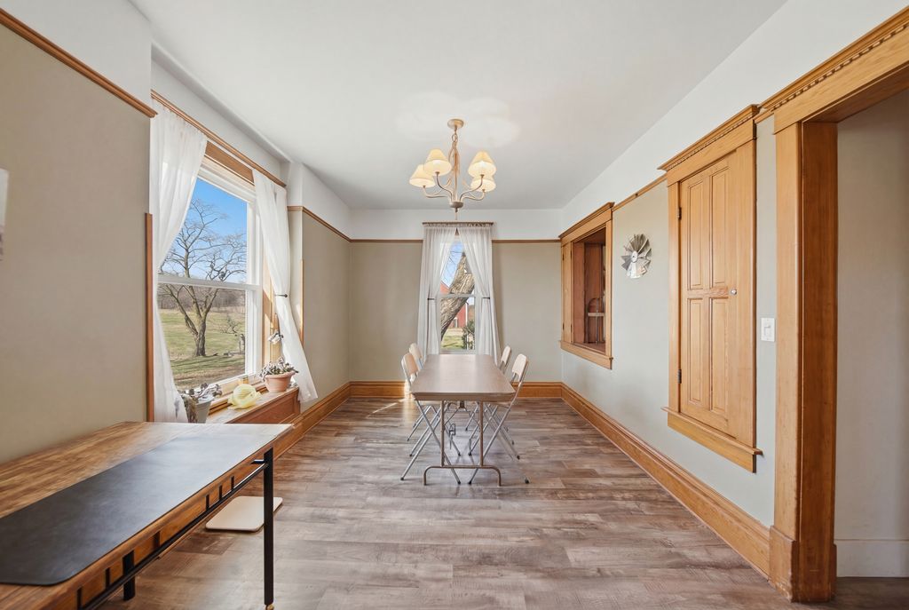 Escape to the peace and privacy of country living with this spacious 5-bedroom, 2-bath home set on 26.89 acres. Whether you're dreaming of a hobby farm, room to roam, or simply a quiet place to call home, this property delivers. A 1-car attached garage and impressive 4-car detached garage provide plenty of space for vehicles, equipment, and toys, while the classic corn crib with chicken coop adds true rural charm. Step inside and feel right at home with newer flooring throughout the main level, a large 16x16 mud/laundry room perfect for country life, and a finished attic featuring beautiful barn wood that brings warmth and character. Built-in cabinetry, pocket doors, and thoughtful details throughout give this home a timeless farmhouse feel. Appliances, including washer and dryer, are all included, making your move much easier. Enjoy wide open spaces, fresh air, and the simple lifestyle that comes with it-this is the kind of property you don't come across often. A true must see for anyone looking to embrace country living.