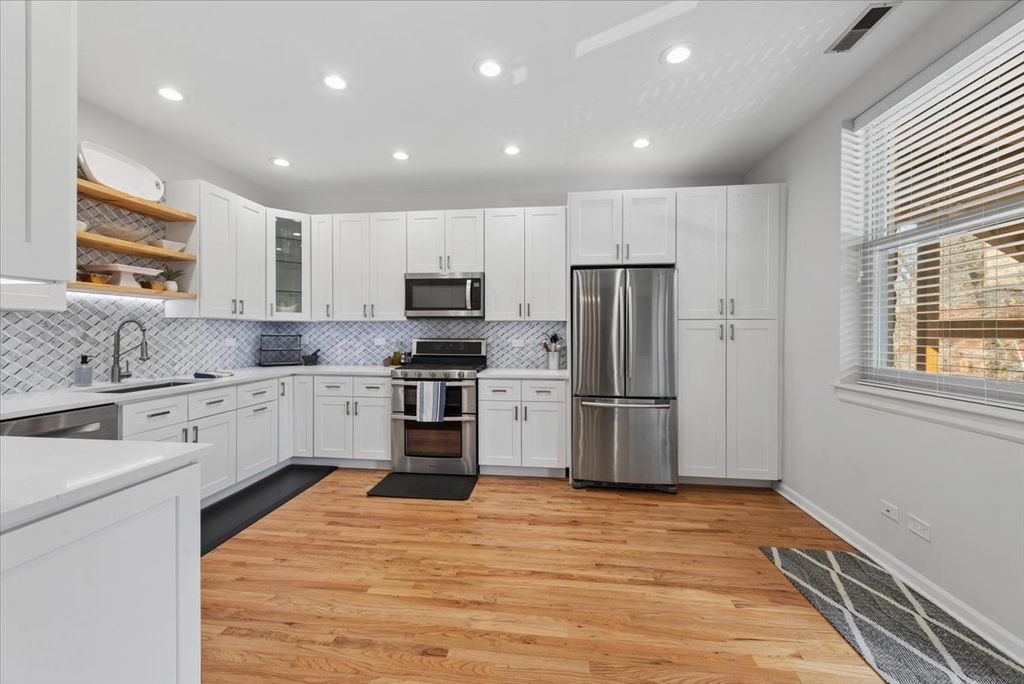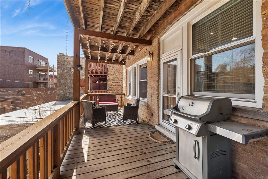 Wow this place is incredible! Located on prime Dover Street in the Dover Landmark District in Sheridan Park, this home will far surpass your expectations. The room sizes throughout are larger than most homes, while offering fully updated finishes, 2 outdoor spaces, and parking! This is truly a home. The large living room is highlighted by the wood-burning fireplace with custom wood mantel and built-in cabinetry and shelving. Cozy up on the largest sectional couch you can find in this room while enjoying your access to your front terrace. In the back of the home is a stunning massive kitchen with white cabinetry, quartz counters, marble backsplash tiles and stainless-steel appliances. The character-filled dining room flows perfectly from the kitchen and includes original wood-beamed ceilings. Your primary suite is as large as you would find in any suburban home (seriously check the measurements) with an updated primary bath with marble topped vanity and subway tiled shower. The second bedroom can also easily fit a king-size bed with room to spare, while the third bedroom/den space provides that optional flex area for a home office or possibly nursery. (No closet in this room.) As with the rest of the home, the hall bathroom has also been fully updated. Refinished hardwood floors run throughout the home, while in-unit laundry and your own furnace and central air offer conveniences. Off the back kitchen and dining room areas is a large private deck that overlooks the common yard below. Complimenting the tremendous closet space within the home is an additional storage closet in the basement as well. Parking included. All of this in the amazing Sheridan Park community on the most beautiful street in the neighborhood with public transportation, nightlife, restaurants (including right along Wilson and Clark Streets) and everything else you could want within easy walking distance.