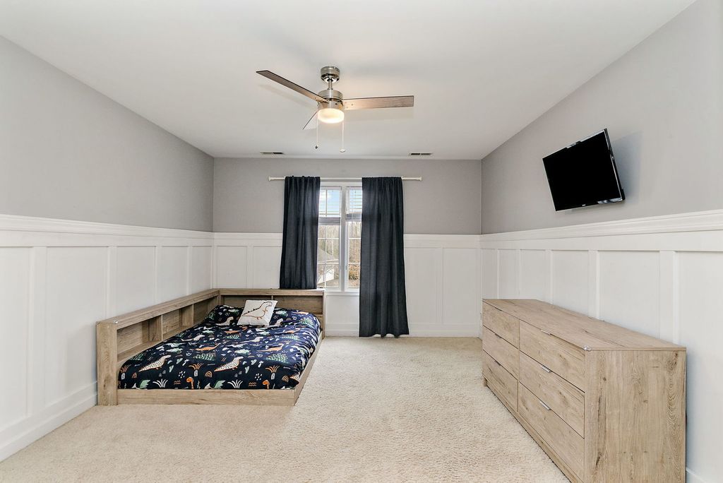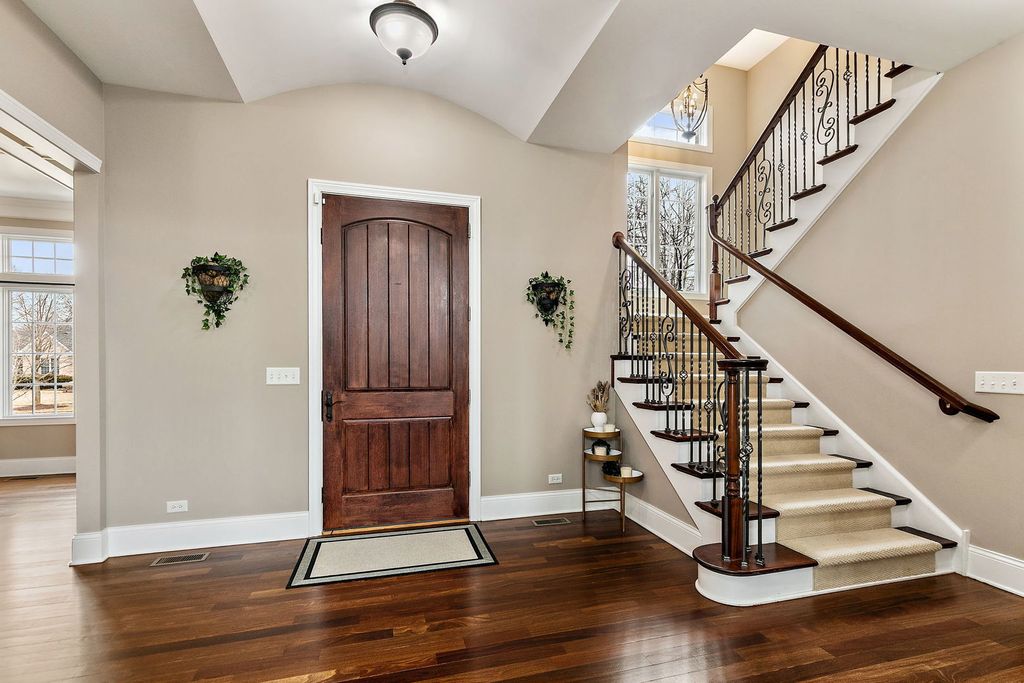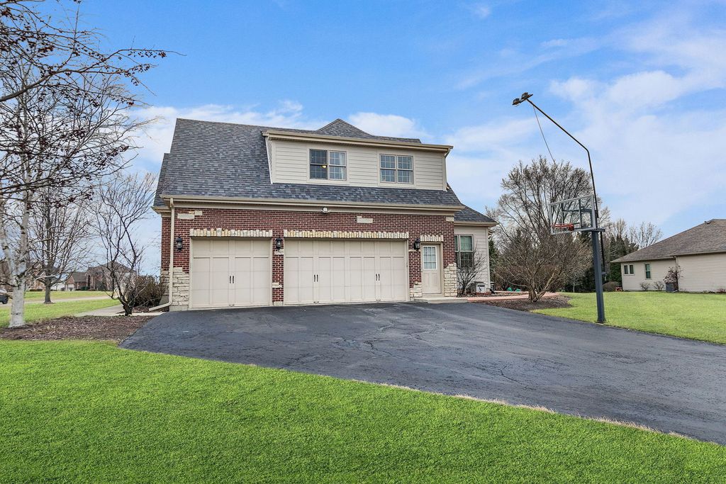 Luxurious 4-bedroom home with nearly 5,000 square feet of living space, beautifully situated on a half-acre corner lot in sought-after Hampshire Hills. The inviting entryway opens to a formal dining room highlighted by stunning coffered ceilings, setting the tone for the elegant details found throughout. The living room features soaring cathedral ceilings, a dramatic floor-to-ceiling stone fireplace, and an abundance of natural light that fills the space. The chef's kitchen offers both style and function with stainless steel appliances including double ovens and a separate gas cooktop, a large extra deep island with breakfast bar, prep sink and built-in microwave, 42-inch cabinetry with crown molding, granite countertops, and a spacious eating area-perfect for everyday living and entertaining. A convenient first-floor laundry room includes cabinets, countertop space, and a sink. French doors lead to a versatile flex room ideal for a private office or den, with a secondary staircase that provides direct access to the theater room upstairs. The desirable main-level primary suite offers a relaxing retreat with a sitting area, walk-in closet, and spa-inspired bath featuring dual vanities, a whirlpool tub, and a large walk-in shower. Upstairs, all bedrooms are generously sized, including a second primary suite with a walk-in closet and private en-suite bath. Two additional spacious bedrooms, a hall bath, and a versatile loft currently used as an office provide plenty of room for family or guests, along with a large family room/game room and an impressive theater room complete with projector and screen. The unfinished English basement offers the potential for over 2,300 square feet of additional living space and already includes a fireplace and rough-in for a future bath. Outside, relax on the patio overlooking the professionally landscaped yard. Ideally located near schools, parks, restaurants, and with easy access to major highways, this exceptional home offers the perfect blend of luxury, space, and comfort.