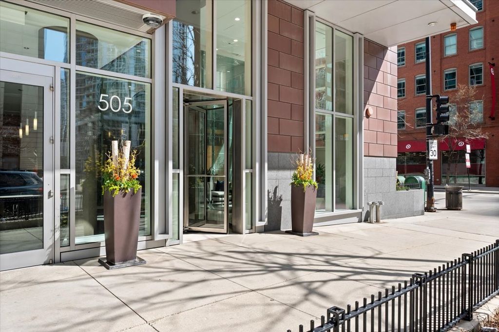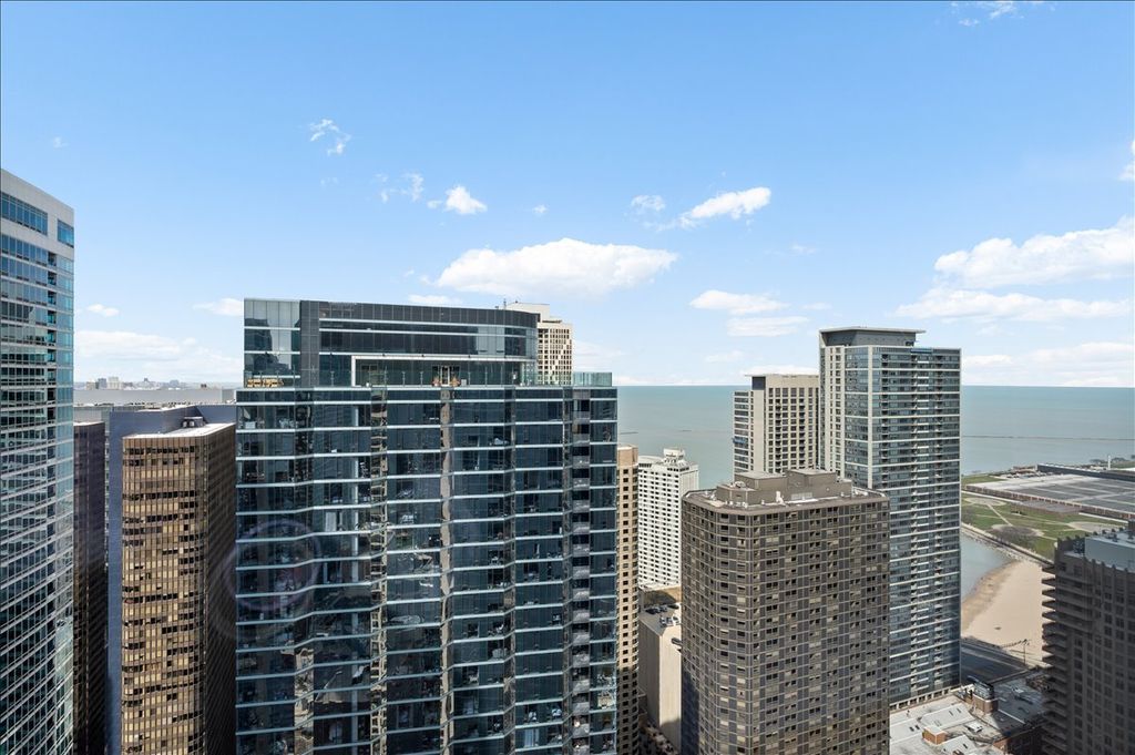 High-floor one-bedroom at Parkview Condominiums offering 1,053 sq ft in a desirable corner layout with north, east, and south exposures showcasing stunning skyline, lake, and river views. Floor-to-ceiling windows spanning over 42 feet, flood the home with natural light and truly bring the outdoors in. The expansive living and dining area features 9-foot ceilings and easily accommodates both comfortable seating and a full dining setup-perfect for everyday living and entertaining. The open kitchen is beautifully appointed with full-height white cabinetry, quartz countertops, a breakfast bar, and KitchenAid stainless steel appliances. The spacious primary suite boasts a wall of windows and a professionally built-out walk-in closet. The adjacent bath is designed for relaxation with a double vanity, upgraded lighting and mirrors, a Jacuzzi tub, and a separate walk-in shower with glass enclosure. Step out onto the south-facing balcony-ideal for summer evenings or enjoying views of Centennial Fountain. Additional highlights include a full-size stackable washer and dryer and window shades throughout. This professionally managed, full-amenity building offers 24-hour door staff, a fitness center, outdoor pool with hot tub and sundeck, hospitality suite, and conference room. Rental parking available.