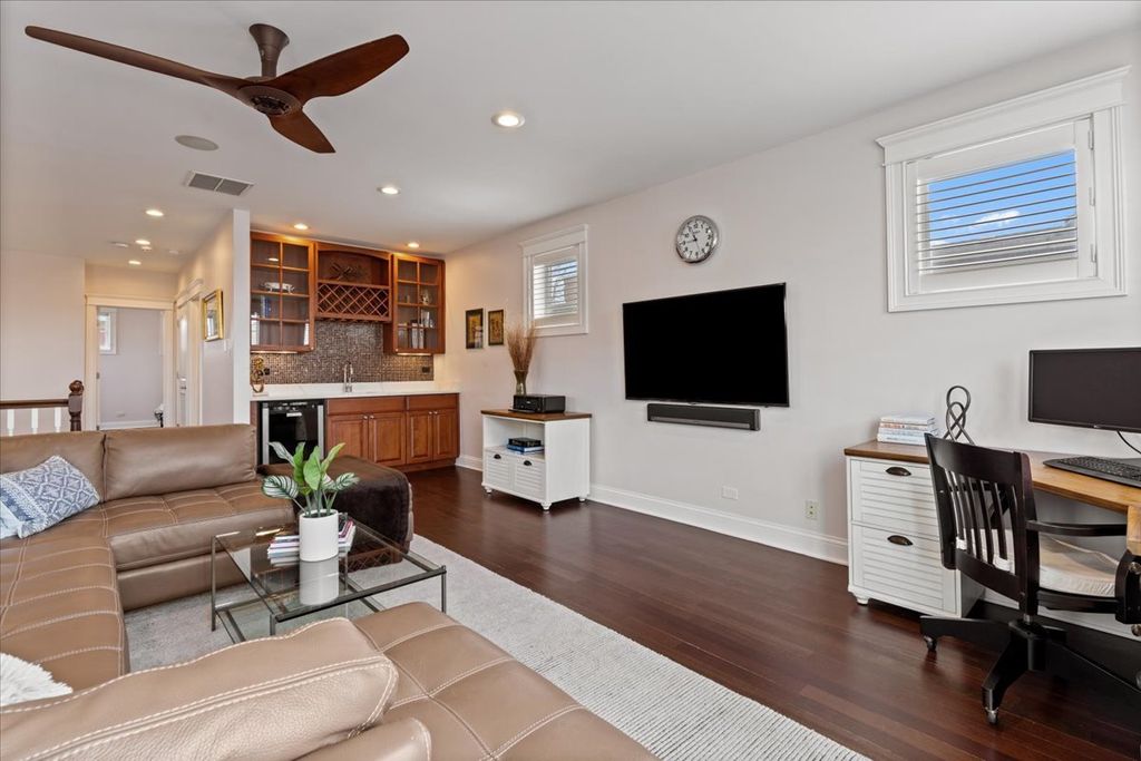 Nestled on a premier block within the coveted Blaine School District, this light-filled five-bedroom residence masterfully blends grand proportions with intimate warmth. From the soaring ceilings to the thoughtful, seamless floor plan, every inch of this home was designed for both entertaining and effortless daily life. The main level invites you in with expansive living and dining areas that flow naturally toward the back of the home. At its center, a chef's kitchen serves as the ultimate gathering spot, featuring top-tier appliances, a breakfast nook, pantry, desk, and a butler's pantry complete with a sink, cabinetry, and beverage center. Adjacent, the cozy family room anchored by a fireplace leads to a true Chicago essential: a large, custom-organized mudroom designed to keep a busy household running smoothly. The primary suite is a true sanctuary featuring a private fireplace, a recently renovated spa-caliber bath, and an enviable suite of custom closets. Two additional bedrooms, a full bath, and a dedicated laundry room round out this level. The penthouse level is a rare third-floor retreat offering a secondary family room, bedroom, full bathroom, and direct access to a sprawling roof deck. The lower level is Perfect for guests or movie nights, featuring dual recreation spaces, a fifth bedroom, a full bath with a PRIVATE SAUNA, and a temperature-controlled 300-BOTTLE WINE CELLAR. Elevate your summer hosting on the spectacular garage roof deck. Outfitted with TimberTech decking, this OUTDOOR OASIS is fully equipped with a kitchen, gas grill, and a pergola with a retractable canopy. Integrated heaters, custom lighting, and irrigation ensure you can enjoy this space through every Chicago season. Enjoy immediate access to the shops and restaurants of Southport, the Brown Line, neighborhood parks, and the iconic energy of Wrigley Field. The best of Lakeview at your doorstep!