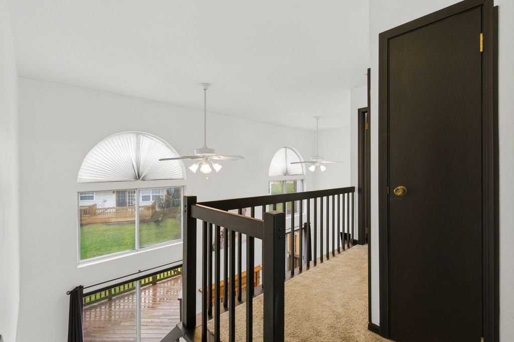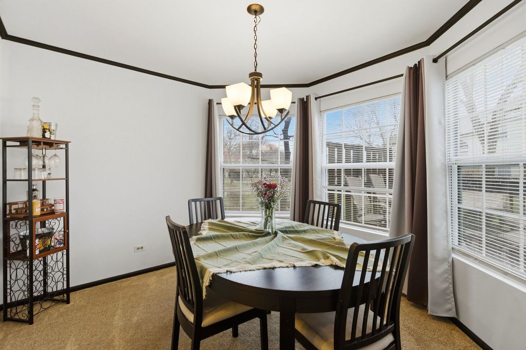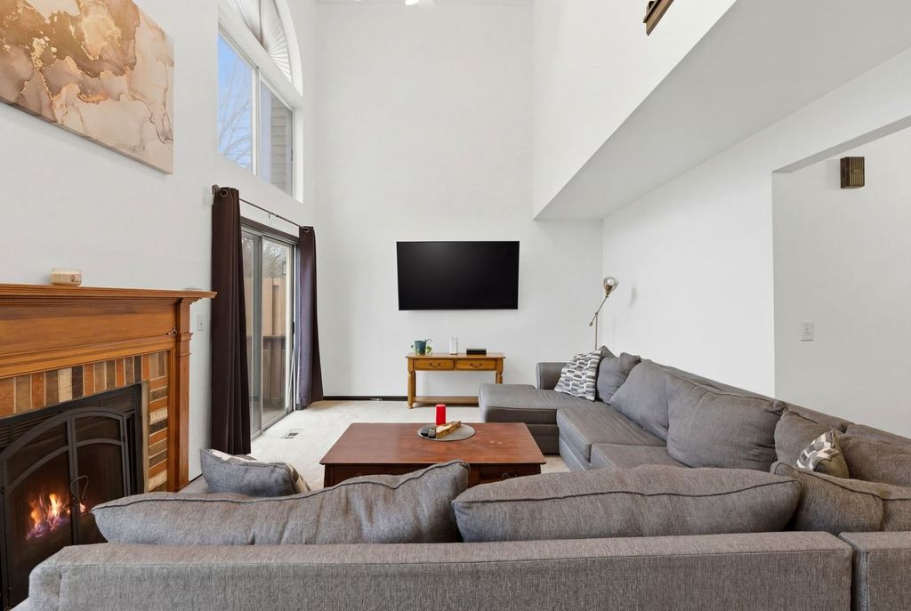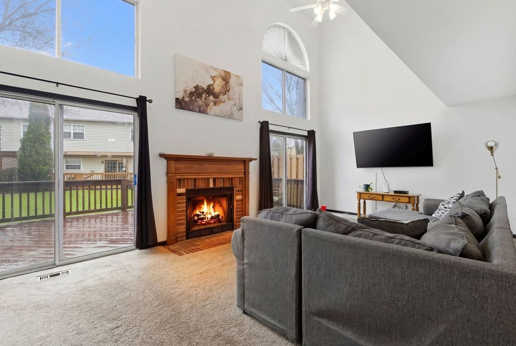 Welcome to this spacious and beautifully updated end-unit townhome, ideally located on the desirable west end of town. Just minutes from Rt. 59 and I-90 for easy commuting! Nestled in a charming community with a mix of townhomes and single-family residences, and conveniently located near a park and scenic pond. Offering approximately 1,940 sq ft of living space, this home features 3 generously sized bedrooms plus a first-floor office, perfect for today's work from home lifestyle. The dramatic two-story living room is filled with natural light and showcases a cozy fireplace, dual ceiling fans, cathedral ceilings and expansive windows with two patio doors that open to a spacious 30-foot deck overlooking the yard. Newer washer and dryer are also included for added convenience. The primary suite offers a private retreat with a full bath, double bowl vanity, and a walk-in closet. Additional highlights include an attached 2-car garage with direct access, and a brand new roof (2024) providing added value and peace of mind. This home truly checks all the boxes schedule your tour today and see why it stands out from the rest!