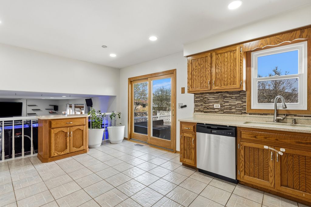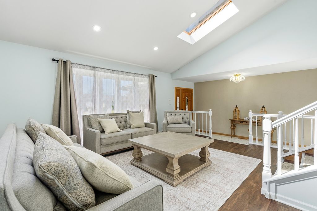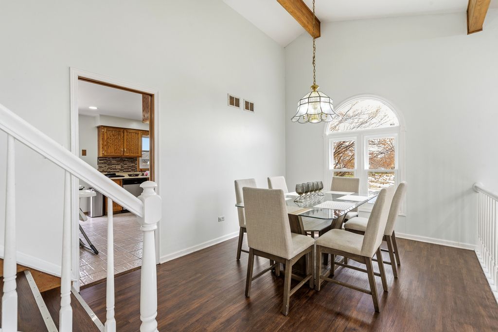 Welcome home to this lavish and beautifully updated Forrester set in a highly desirable location, offering space, style, and an exceptional indoor-outdoor lifestyle. From the moment you step inside, you'll be impressed by the open and airy floor plan highlighted by a dramatic vaulted and beamed living room with two skylights that flood the space with natural light. The vaulted and beamed formal dining room provides the perfect setting for entertaining and special occasions. The stunning kitchen is a true showstopper, featuring a custom backsplash, Corian counters, abundant cabinetry, and a spacious breakfast area with a door leading to the composite deck overlooking the private, fenced backyard. Enjoy your own outdoor retreat complete with pool, hot tub, concrete patio, and storage shed - ideal for relaxing or hosting summer gatherings. The large family room offers gleaming hardwood floors, a cozy fireplace, recessed lighting, and direct access to the concrete patio, creating seamless indoor-outdoor living. A convenient laundry room with sink and service door to the exterior adds everyday functionality. The attached garage is finished with a durable epoxy floor. Upstairs, the spacious primary bedroom features double closets and a private bath with a double raised vanity and separate shower, along with two additional generously sized bedrooms. The finished basement expands your living space with a recreation room featuring luxury vinyl plank flooring and abundant natural light. This home also offers peace of mind with numerous updates including newer windows, soffits, and gutters with lifetime transferable warranty (all about 2 years old), furnace and air conditioner approximately 6 years old, and roof and siding replaced in 2012. A rare opportunity to own a beautifully maintained Forrester with luxury touches, functional living space, and an incredible backyard oasis.