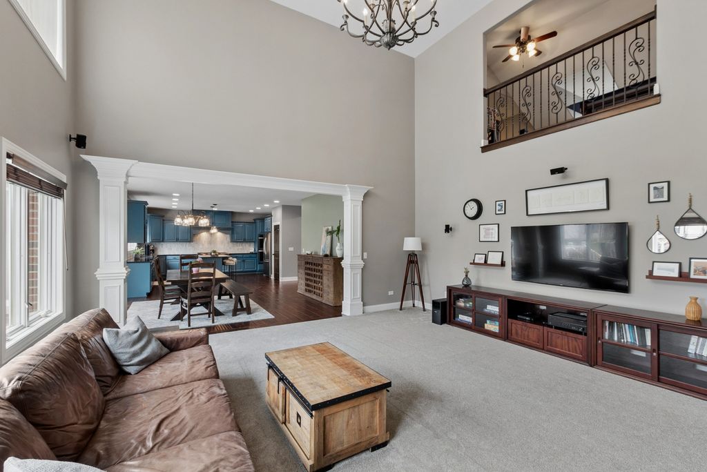 Welcome home to this beautifully updated 4-bedroom, 2.5-bath residence built by O'Malley Builders, offering quality craftsmanship and custom upgrades throughout. The main level features tastefully painted rooms accented with wainscoting and custom molding, a convenient first-floor office, and a functional 1st floor laundry room with mudroom access to the attached 3-car garage. The custom kitchen with an island opens to a bright eating area and sliding glass doors leading to the deck-perfect for indoor/outdoor living. The fenced backyard includes a custom brick patio with a fire pit, ideal for entertaining. A dramatic two-story family room showcases a two-way fireplace connecting to a versatile livings space suitable for a fifth bedroom, office, or playroom. Upstairs, a unique open loft area with a bar provides additional flexible living space for entertaining or recreation. The upper level includes four generously sized bedrooms, including a spacious primary suite. The full basement offers excellent potential and includes rough-in plumbing for a future bathroom. Located in a quiet neighborhood close to shopping, dining, parks, and highly regarded schools, with convenient access to I-80.