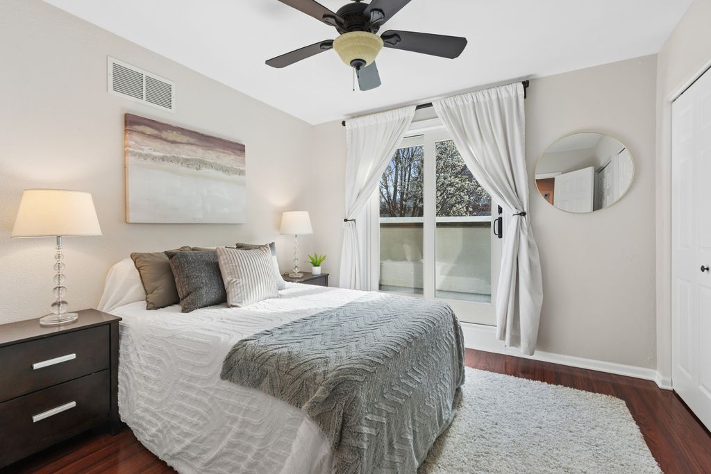 Come home to this Prairie District gem at an incredible value! This spacious 2-bedroom/2-bathroom unit is situated in the heart of Harbor Square off the street in a quiet, tree-lined, gated community between Indiana Ave. and Prairie Ave. The large elevated main level is fully open with a living/dining room combo and a huge kitchen with custom cabinetry, a built in desk, granite countertops and backsplash, a double oven, and all stainless steel appliances. The large balcony off the kitchen overlooks the beautifully landscaped courtyard. The third floor has a master bedroom suite with a double vanity sink in the bathroom, as well as a large second bedroom and a second bathroom. The unit also features hardwood floors throughout, large windows, lots of light, a fireplace in the living room, ample closet space, in-unit laundry facilities with storage, and central HVAC. Attached 1-car garage and foyer on the ground floor. Conveniently and centrally located near the Lake, parks, museums, shopping, restaurants, and much more.