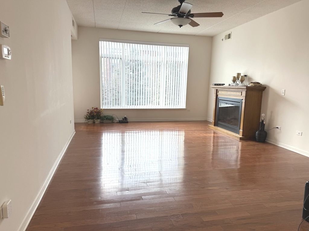 Welcome to Fountain Square in Lombard-where comfort, style, and convenience come together in this beautifully maintained 2-bedroom, 2-bath condominium. Hardwood flooring flows seamlessly throughout the main living areas and both bedrooms, creating a warm and cohesive feel. The spacious living room is highlighted by a charming wood mantel fireplace and filled with natural light from expansive windows. Sliding glass doors lead to your own private balcony-perfect for relaxing or enjoying your morning coffee. The primary suite offers a walk-in closet and a private full bath, providing a comfortable and functional retreat. The eat-in kitchen features ample oak cabinetry, Corian countertops, and stainless steel appliances, including a newer stove and microwave (2023). Additional highlights include in-unit laundry, a heated garage parking space, and a large private storage room. With thoughtful updates and a desirable location, this home offers easy, low-maintenance living in a well-kept community.