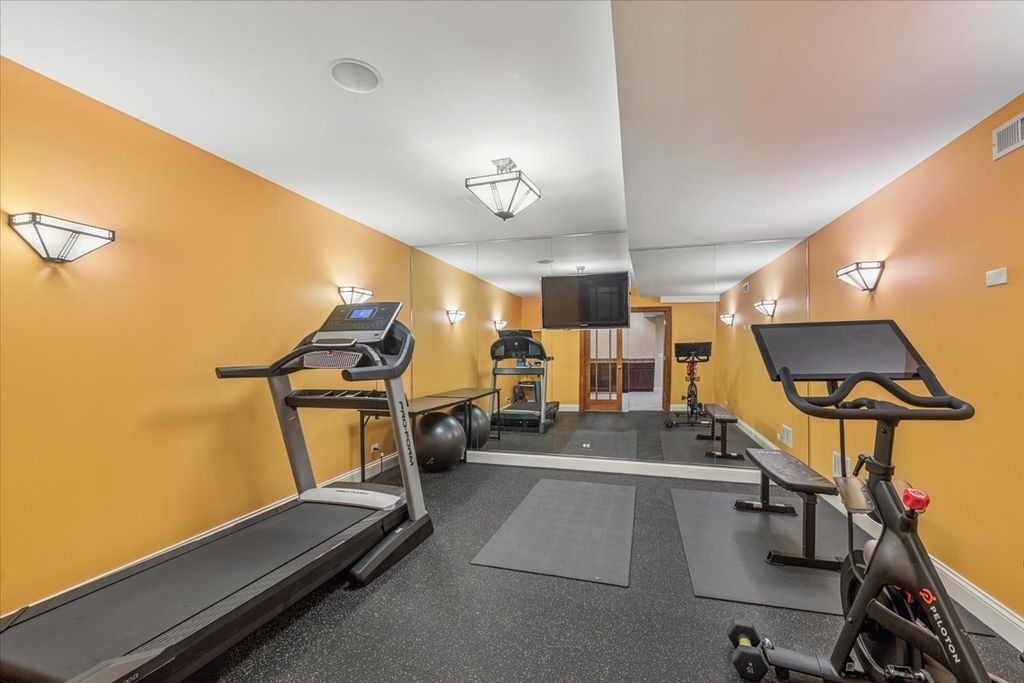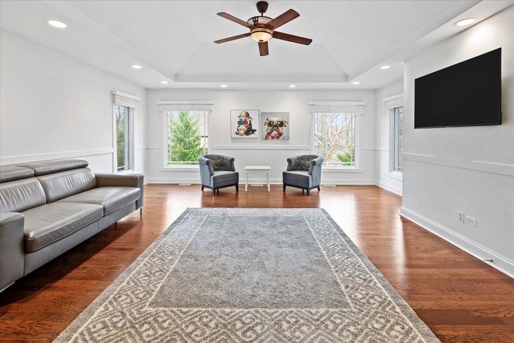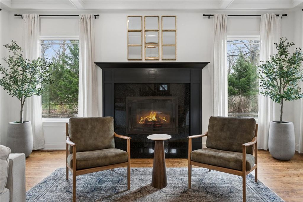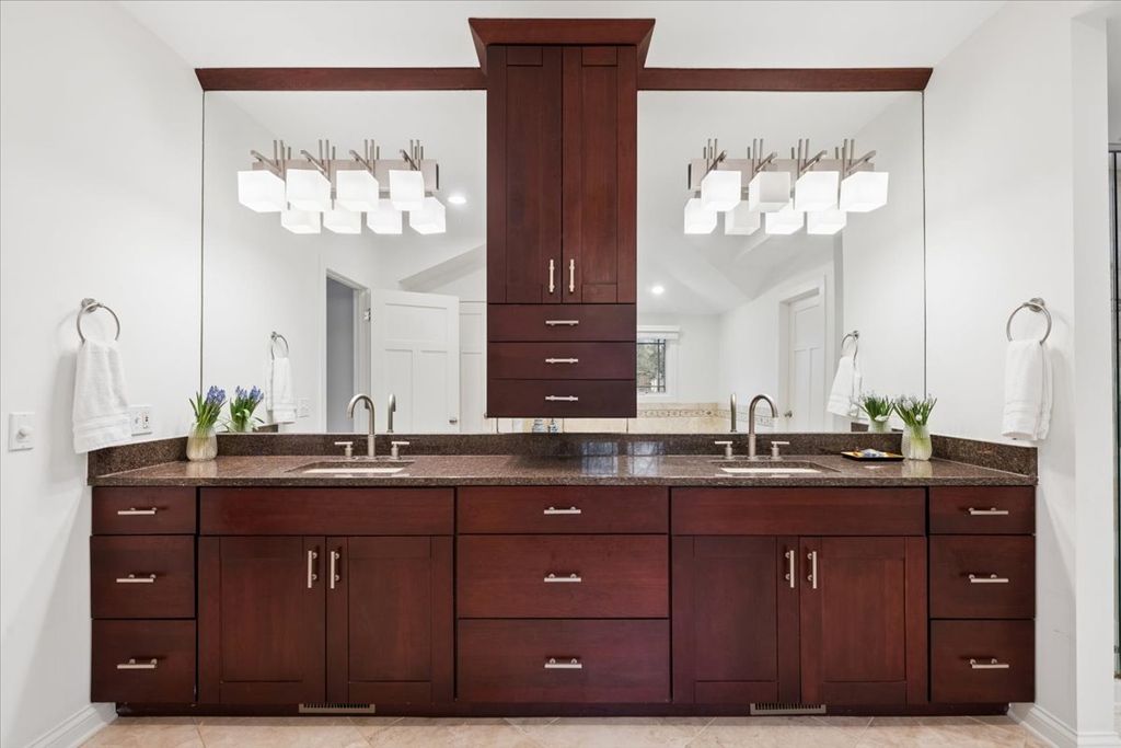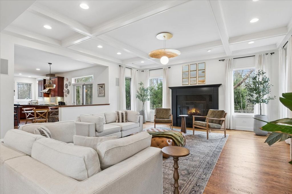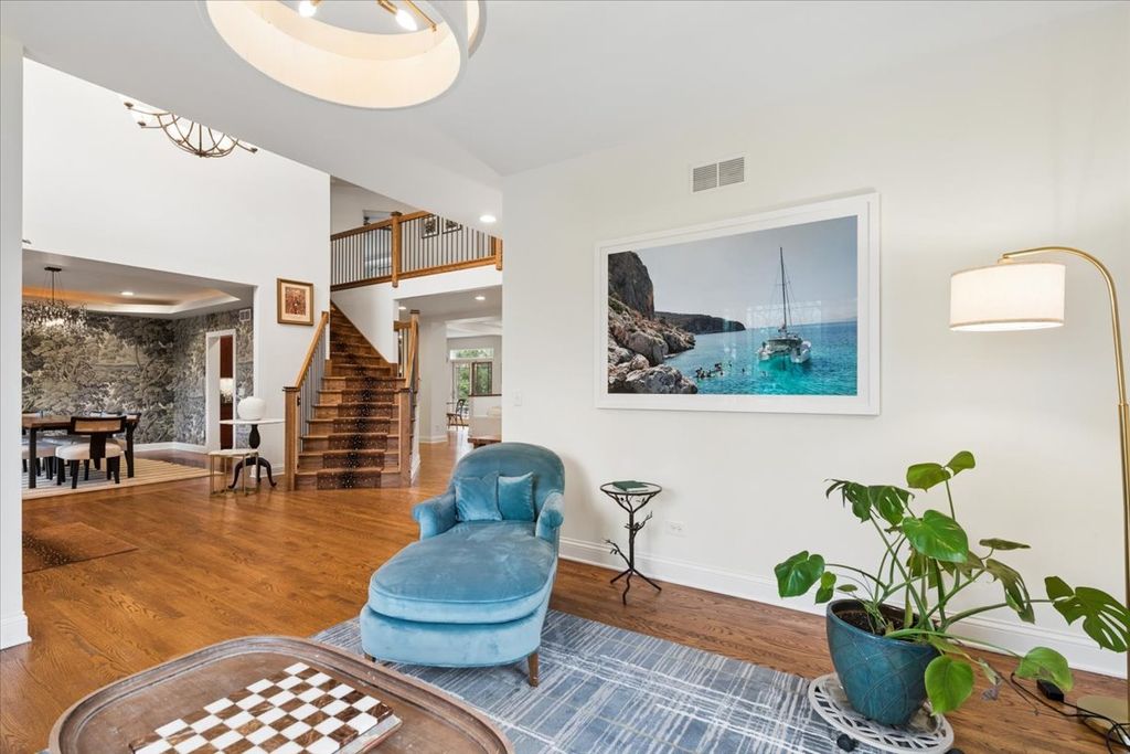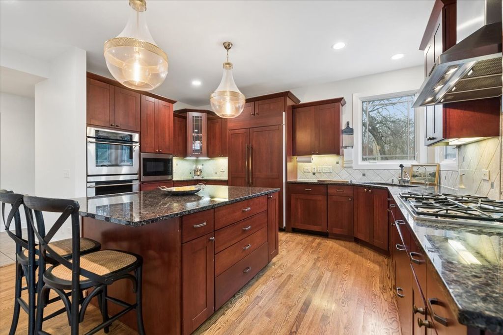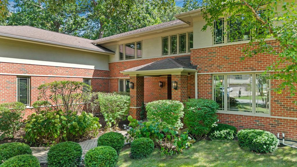 A quietly commanding presence rooted in architectural intention, this custom residence channels a refined Prairie aesthetic while delivering the scale, flow, and modern livability today's market demands. Set on an expansive half-acre, the home unfolds with a sense of openness and symmetry, where a dramatic two-story foyer introduces richly finished hardwood floors, curated lighting, and thoughtfully layered millwork that continues throughout. Formal living and dining spaces are elevated yet inviting, with sculptural fixtures and ceiling detail that add a subtle sense of drama without excess. At the heart of the home, the kitchen is both functional and beautifully composed-anchored by a generous island with seating, framed by granite surfaces, custom cabinetry, a walk-in pantry, and a full suite of premium appliances-seamlessly connecting to a sunlit breakfast room with direct access to the patio for effortless indoor-outdoor entertaining. The adjoining family room offers warmth and architectural depth with its coffered ceiling and ambient lighting, creating a natural gathering space. A versatile main-level office or fifth bedroom with ensuite bath provides flexibility for guests or work-from-home living, complemented by a well-appointed mudroom and powder room. Upstairs, the primary suite is designed as a private retreat, featuring vaulted ceilings and an adjoining sitting room with custom built-ins and beverage station, while the spa-caliber bath is finished with heated flooring, dual vanities, soaking tub, and an oversized shower with rainfall fixture. Additional bedrooms are generously proportioned, including an ensuite and thoughtfully designed closets, while a dedicated laundry room enhances everyday ease. The lower level extends the home's livability with a fully finished recreation space, complete with a wet bar, fitness room, additional bedroom, and a luxe bath featuring a steam shower-ideal for both entertaining and extended stays. Outdoors, a newly expanded brick paver patio offers a serene setting for gatherings, framed by mature landscaping and a fully fenced yard. A rare four-car heated garage, whole-house generator, and extensive mechanical updates-including newer HVAC systems, lighting, and finishes-underscore the home's turnkey appeal. This is a residence that balances architectural pedigree with modern comfort, offering a lifestyle defined by space, privacy, and effortless sophistication.