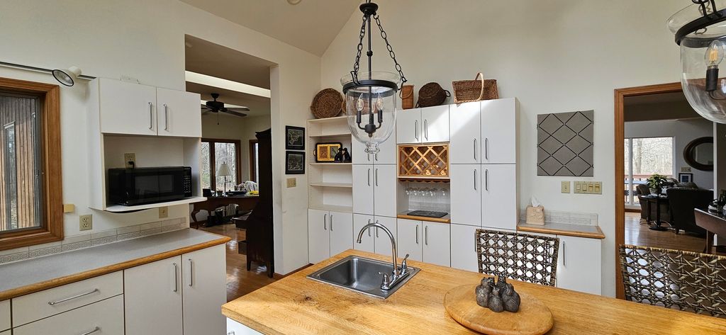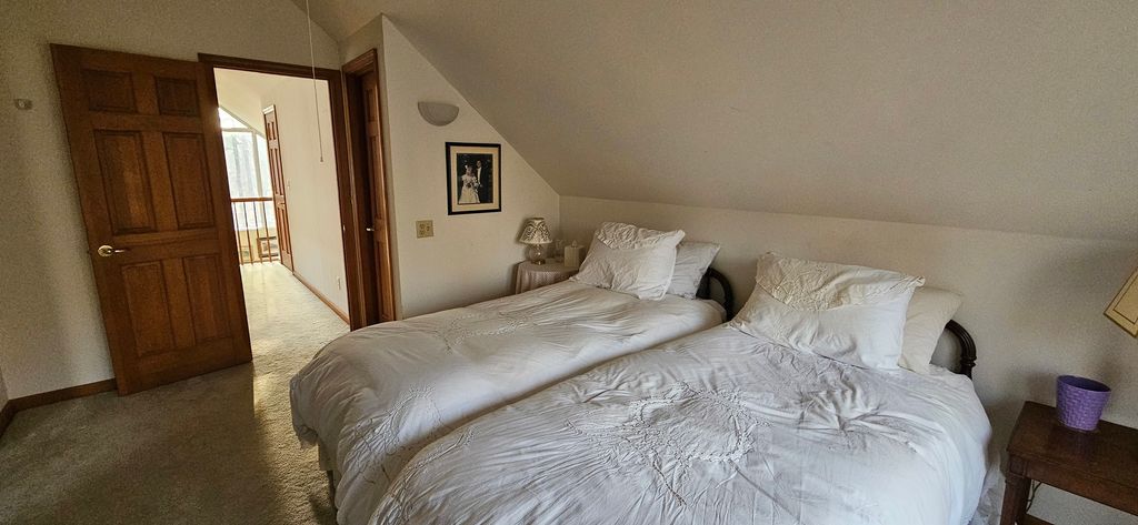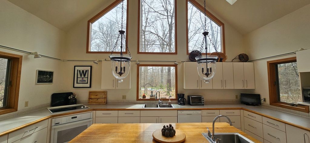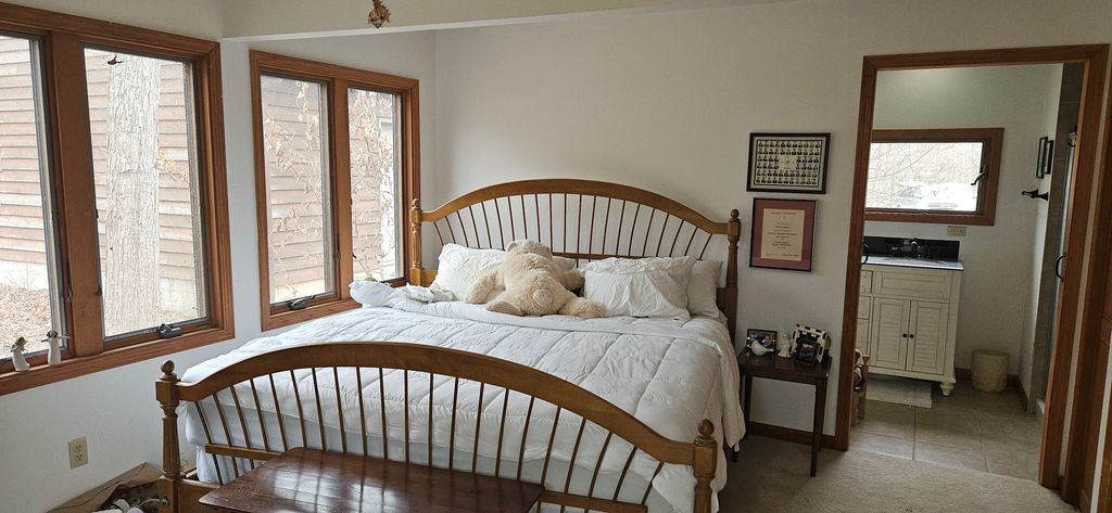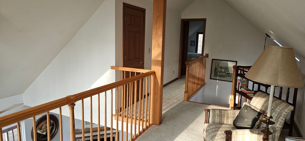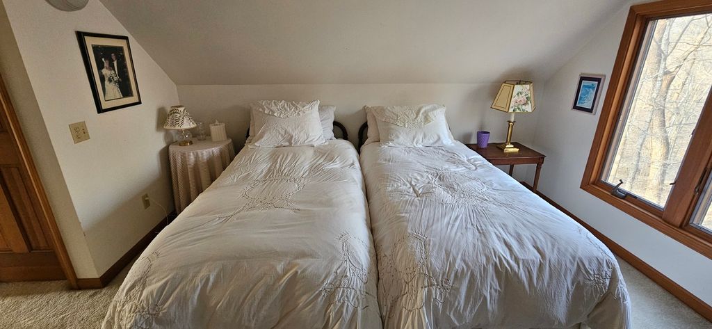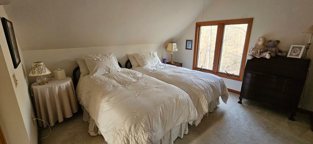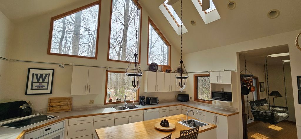 This charming 3 bed, 3 bath "tree house" is adorned with walls of windows overlooking a spacious elevated back deck and wooded one-acre ravine. The 2,400 sf home in Union Hills features vaulted ceilings, skylights, French and sliding glass doors to allow in natural light throughout. The large airy kitchen centers around a full island perfect for entertaining with easy access to the "formal" dining room (currently being used as an office/study). The main floor living room has beautiful hardwood floors and a woodburning fireplace. The primary bedroom and bath were redesigned and now located on the first floor. Upstairs the cozy loft leads into a bed and private bath combo. Downstairs the basement provides an additional 675 sf of furnished living space with another bedroom and open family/rec room. The large utility room (former laundry room) could easily be turned into a fourth bath. Situated in a quiet community in Unity Point School District, this one-of-a-kind home is a tranquil retreat. The seller maintained an annual service contract with Terminix and Jacobs Heating & Air and will be providing a 1-year home warranty with American Home Shield. Some of the remaining furniture is also available for purchase.