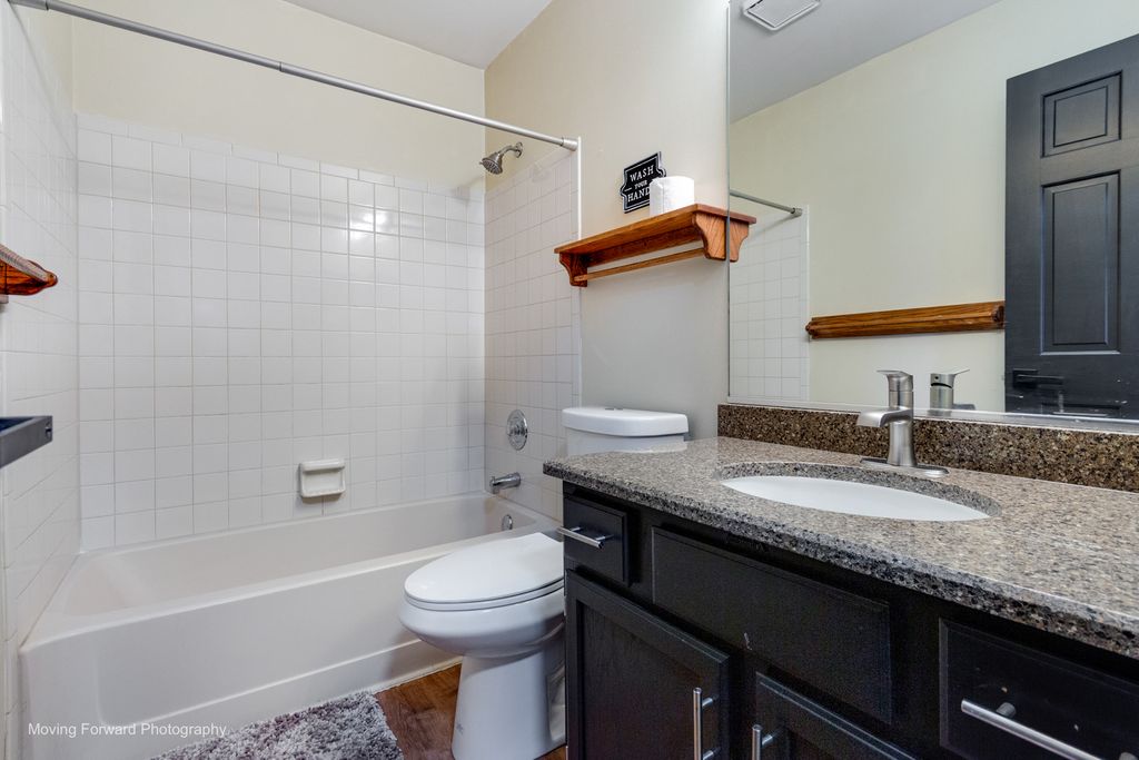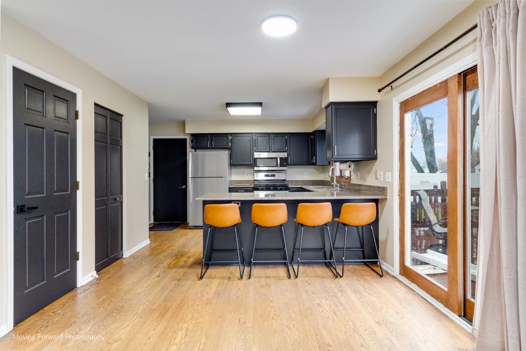 Beautiful 4-bedroom, 2.5-bath home in the desirable Indian Trail West subdivision-opportunities here are hard to find! Move-in ready and full of charm, this home features beautiful hardwood flooring and newer carpet throughout the main level. The formal living and dining rooms offer great space for everyday living and entertaining. The updated kitchen showcases modern black cabinetry, granite countertops, stainless steel appliances, a spacious pantry, breakfast bar, and an eating area with sliding door access to the deck. The family room opens seamlessly and features a bay window and a stunning brick fireplace with accent lighting, creating a warm and inviting space. Upstairs, the primary suite includes dual closets and a private bath with double vanity, whirlpool tub, and separate shower. Three additional bedrooms offer generous closet space and share a full hall bath. The finished basement adds valuable living space with a large recreation room and bar area-perfect for entertaining or relaxing. Enjoy the fully fenced backyard complete with a deck, built-in firepit, and storage shed. Conveniently located near I-88, shopping, dining, and parks. Welcome home!