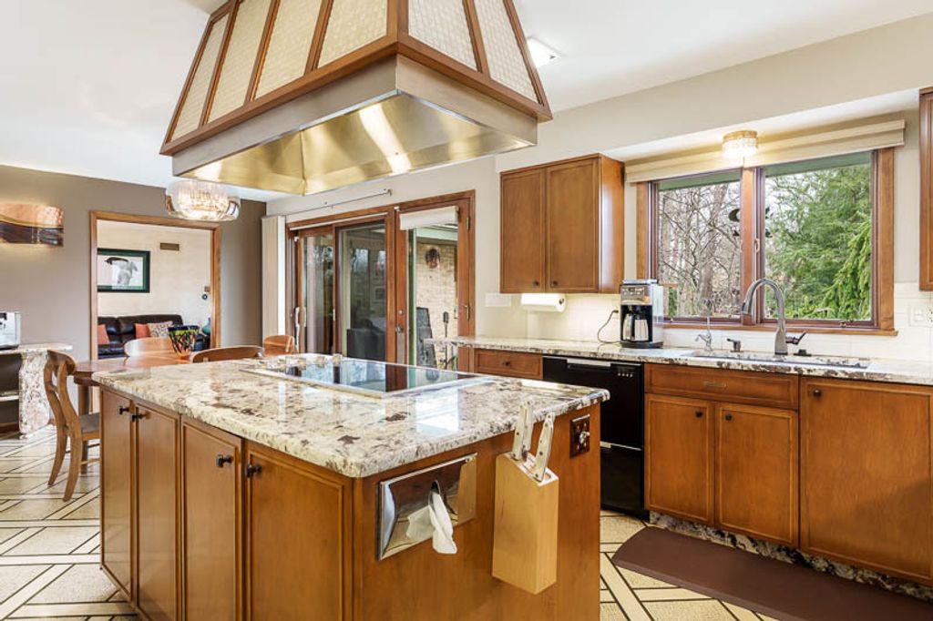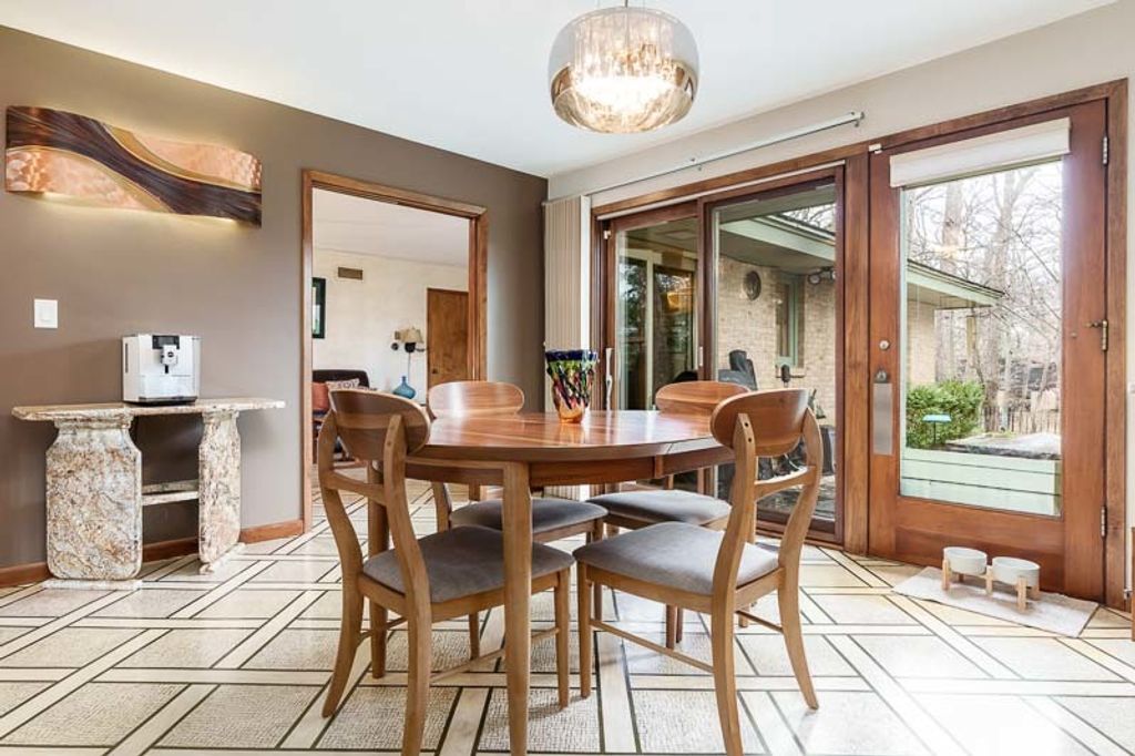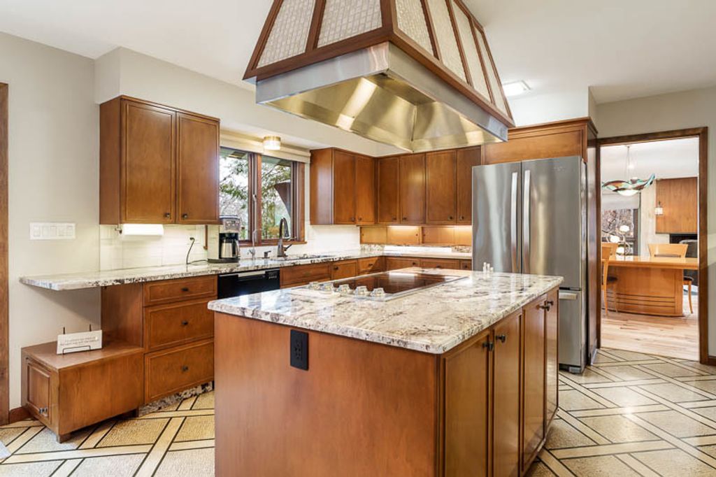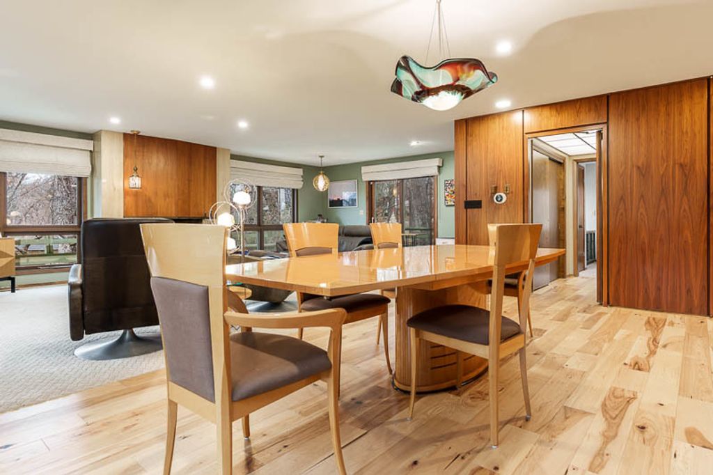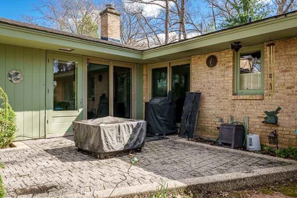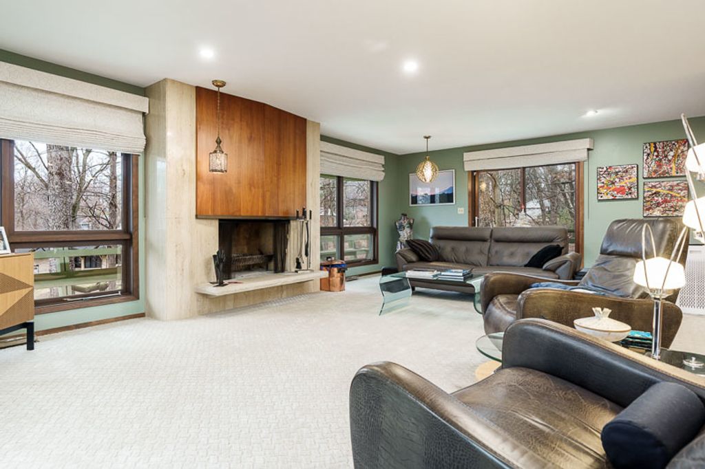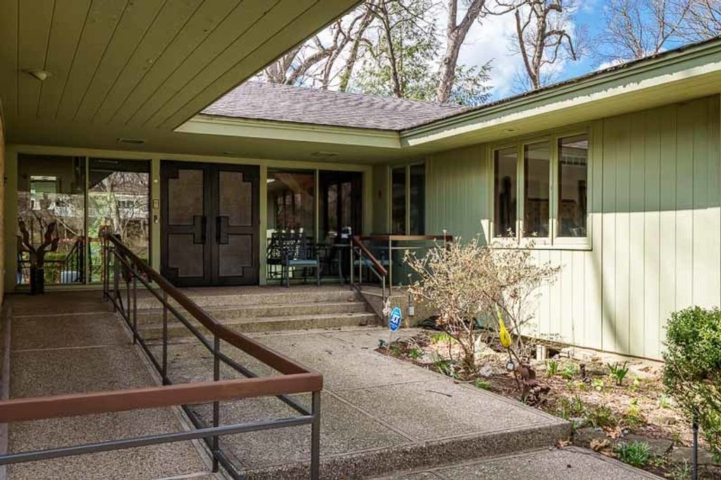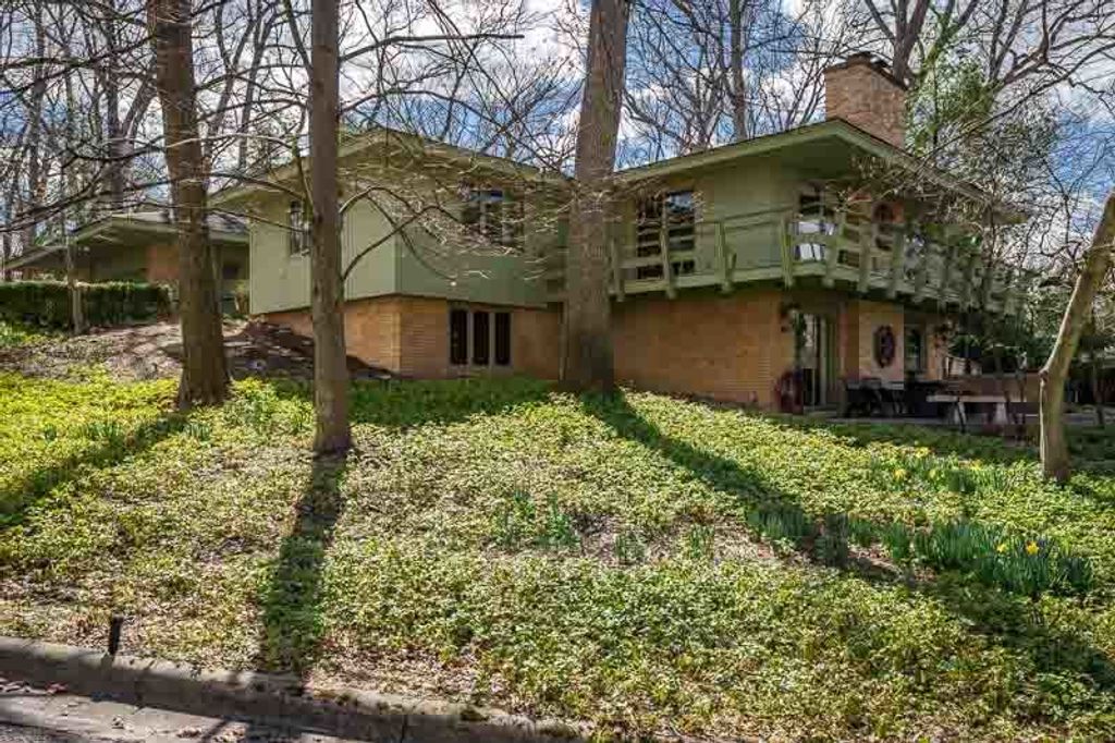 Custom-designed by architect and master craftsman Ed Ware, this exceptional mid-century modern ranch offers timeless design and functional living on a private, wooded cul-de-sac. Featuring 5 bedrooms, 4.5 bathrooms, and a 2+ car garage, this home blends architectural character with thoughtful updates. The spacious eat-in kitchen is equipped with newer appliances, a center island, and sleek granite countertops-perfect for everyday living and entertaining. The great room is a true centerpiece, showcasing new flooring, a striking walnut storage wall, and expansive windows that bring in natural light and serene outdoor views. The primary suite is ideally situated off the main hallway and great room for convenience and privacy. Near the garage entry, you'll find an oversized laundry room, powder room, and abundant storage space. A separate wing includes three bedrooms and a den, connected by two Jack-and-Jill bathrooms featuring beautifully preserved original vintage tile. The fully finished walkout basement expands the living space with a large great room, wet bar, second kitchen, an additional bedroom with ensuite bath, and a substantial bomb shelter-offering both versatility and peace of mind. Additional highlights include a whole-home Generac generator and a setting that perfectly complements the home's architectural charm. This is a rare opportunity to own a distinctive mid-century modern home with space, character, and privacy.