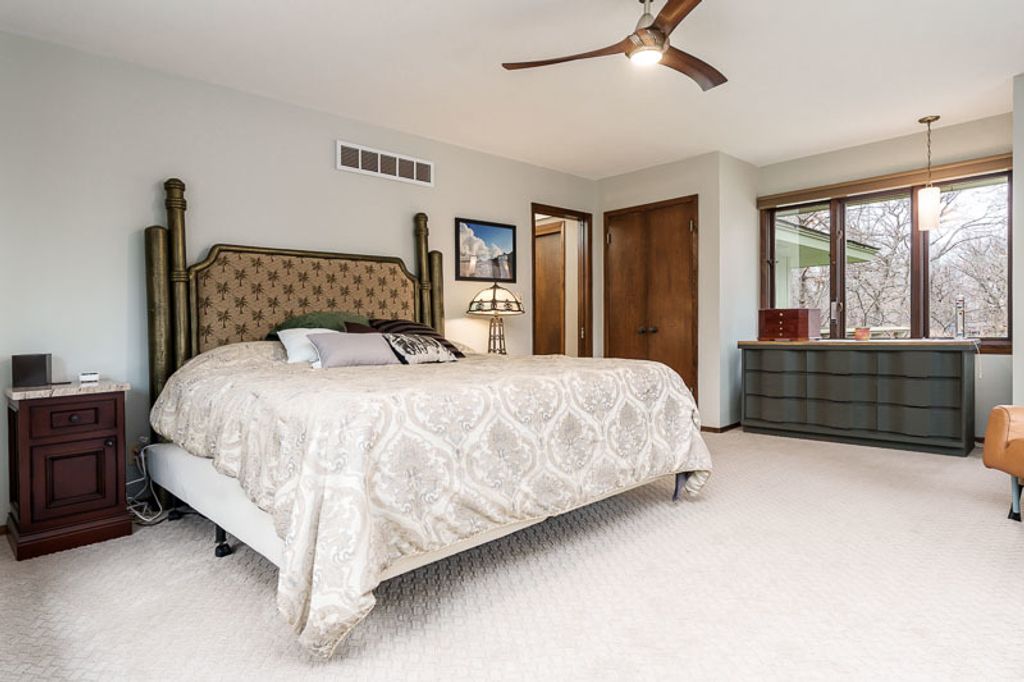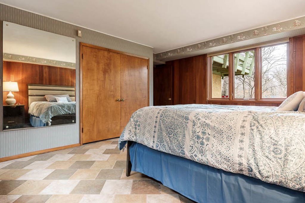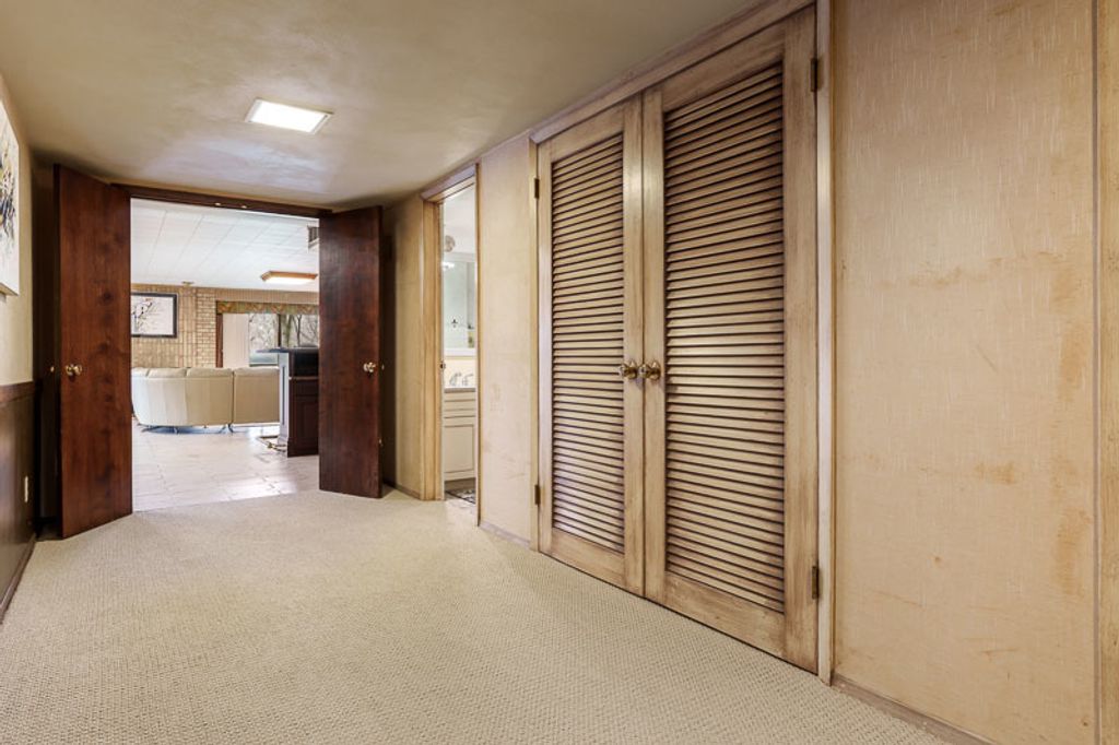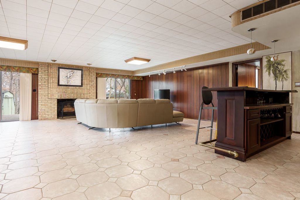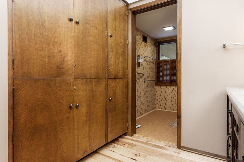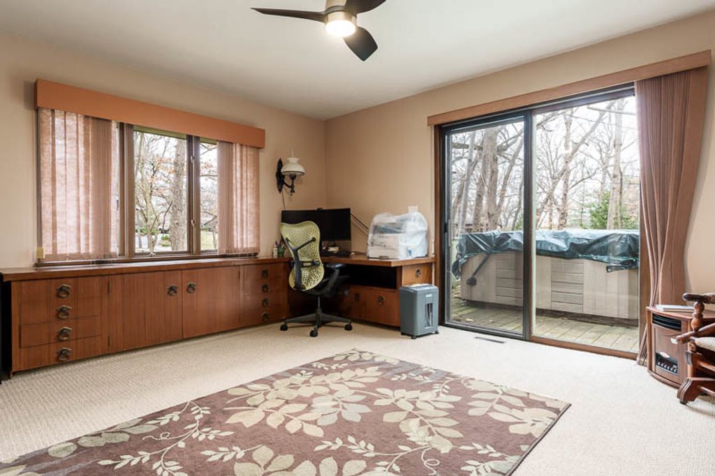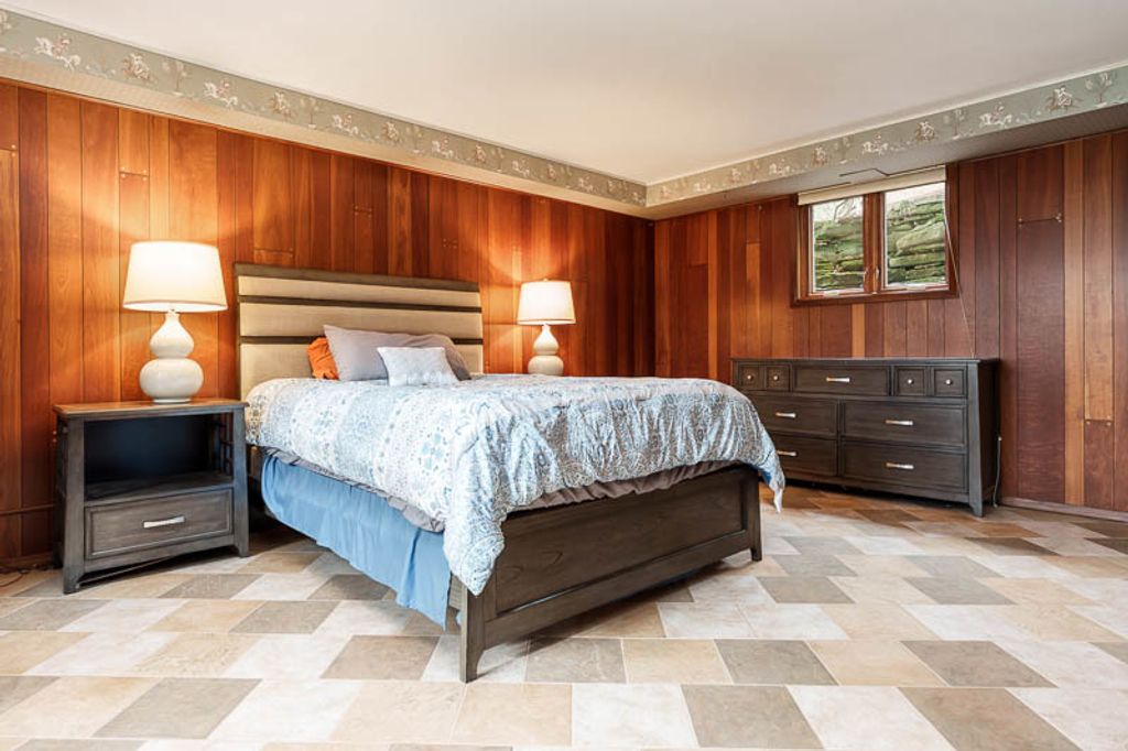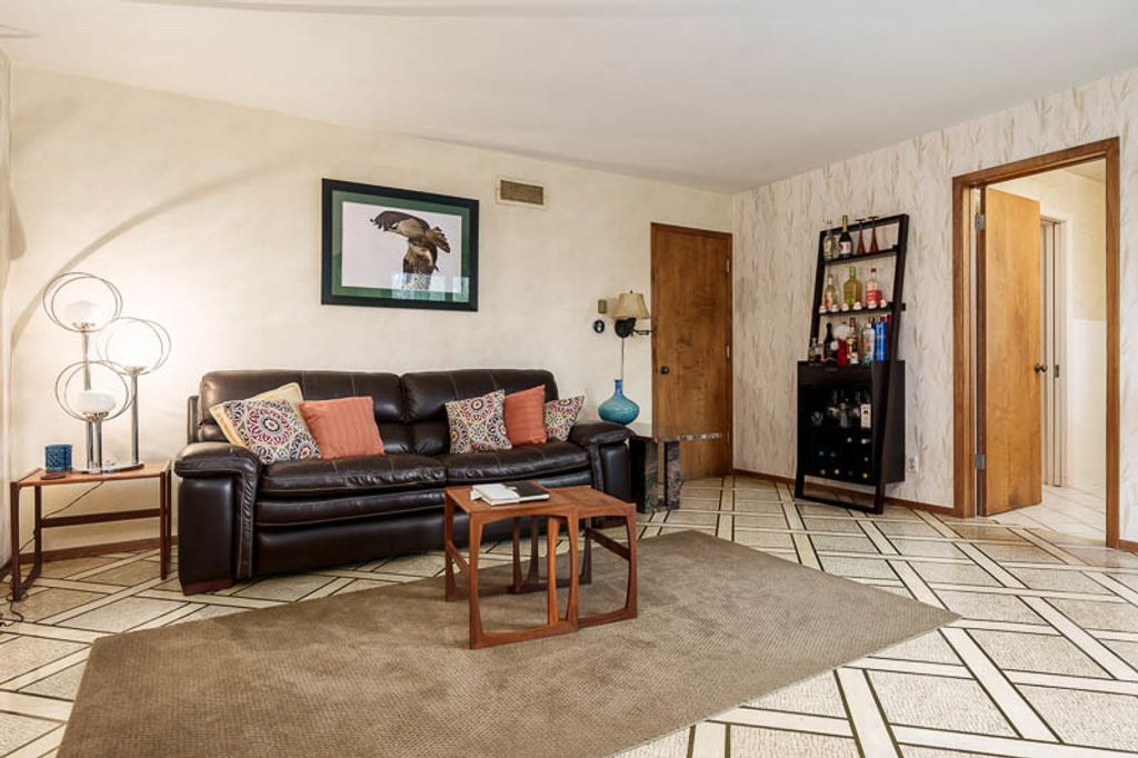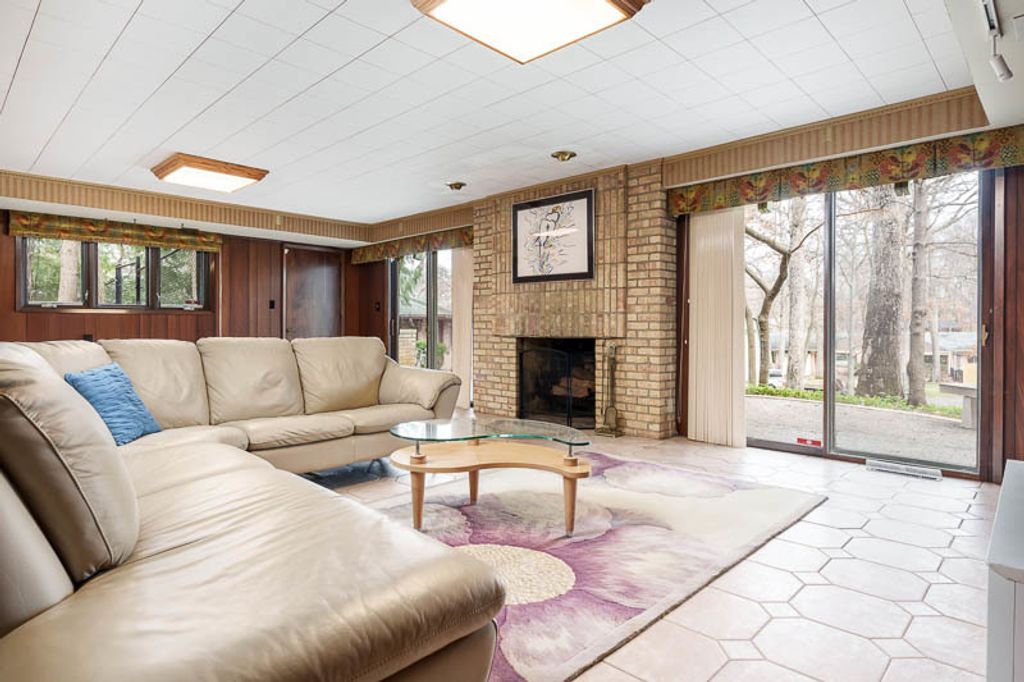 Custom-designed by architect and master craftsman Ed Ware, this exceptional mid-century modern ranch offers timeless design and functional living on a private, wooded cul-de-sac. Featuring 5 bedrooms, 4.5 bathrooms, and a 2+ car garage, this home blends architectural character with thoughtful updates. The spacious eat-in kitchen is equipped with newer appliances, a center island, and sleek granite countertops-perfect for everyday living and entertaining. The great room is a true centerpiece, showcasing new flooring, a striking walnut storage wall, and expansive windows that bring in natural light and serene outdoor views. The primary suite is ideally situated off the main hallway and great room for convenience and privacy. Near the garage entry, you'll find an oversized laundry room, powder room, and abundant storage space. A separate wing includes three bedrooms and a den, connected by two Jack-and-Jill bathrooms featuring beautifully preserved original vintage tile. The fully finished walkout basement expands the living space with a large great room, wet bar, second kitchen, an additional bedroom with ensuite bath, and a substantial bomb shelter-offering both versatility and peace of mind. Additional highlights include a whole-home Generac generator and a setting that perfectly complements the home's architectural charm. This is a rare opportunity to own a distinctive mid-century modern home with space, character, and privacy.