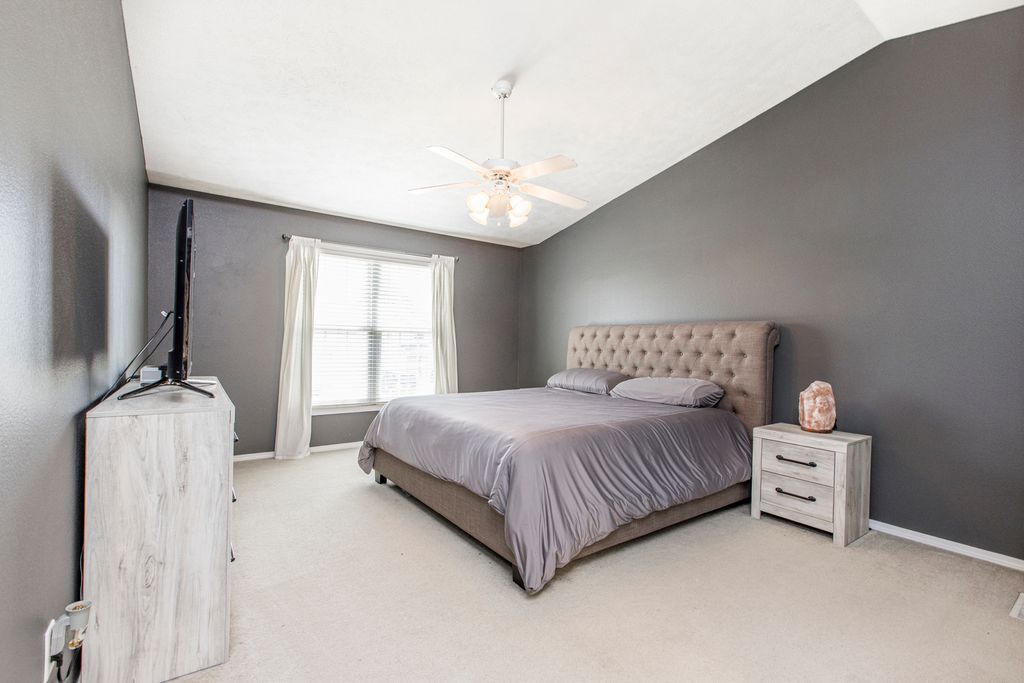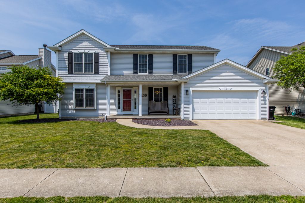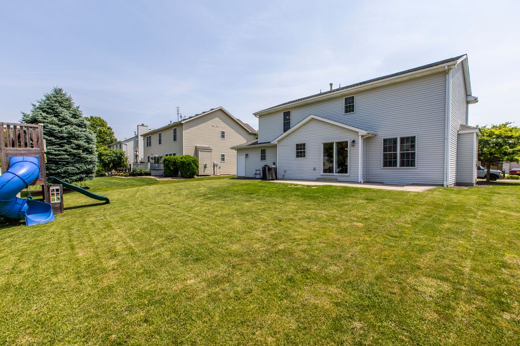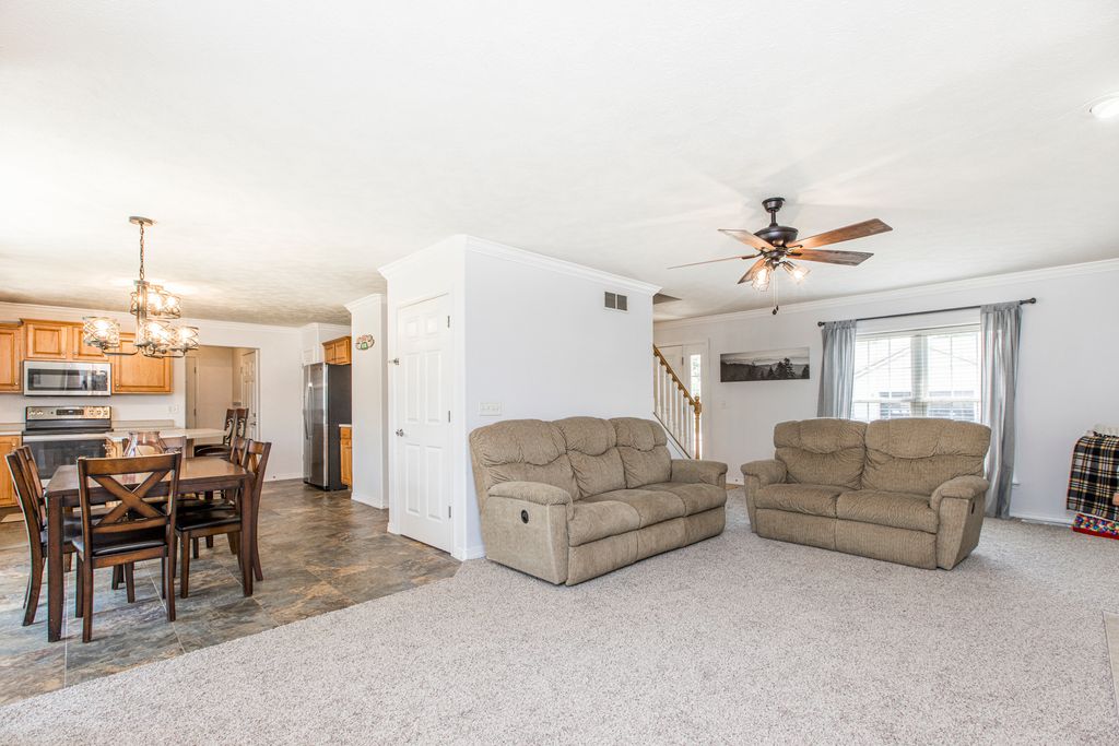 Welcome home to this 4 bedroom 2.5 bath home in Eagles Landing! This updated home offers hardwood flooring and wainscoting in the front dining/flex room, brand new carpet in the family room with gas fireplace and crown molding. The open, bright kitchen includes all stainless appliances (2020) Dishwasher 2025. 4 bedrooms upstairs including the primary suite with walk in closet, vaulted ceiling and ensuite bath. 3 additional bedrooms upstairs and full bathroom. The partially finished basement provides a large family room and tons of additional storage. Out back the yard offers an extended patio to provide room for everyone! HVAC new in 2023, updated light fixtures throughout much of the home, and more!