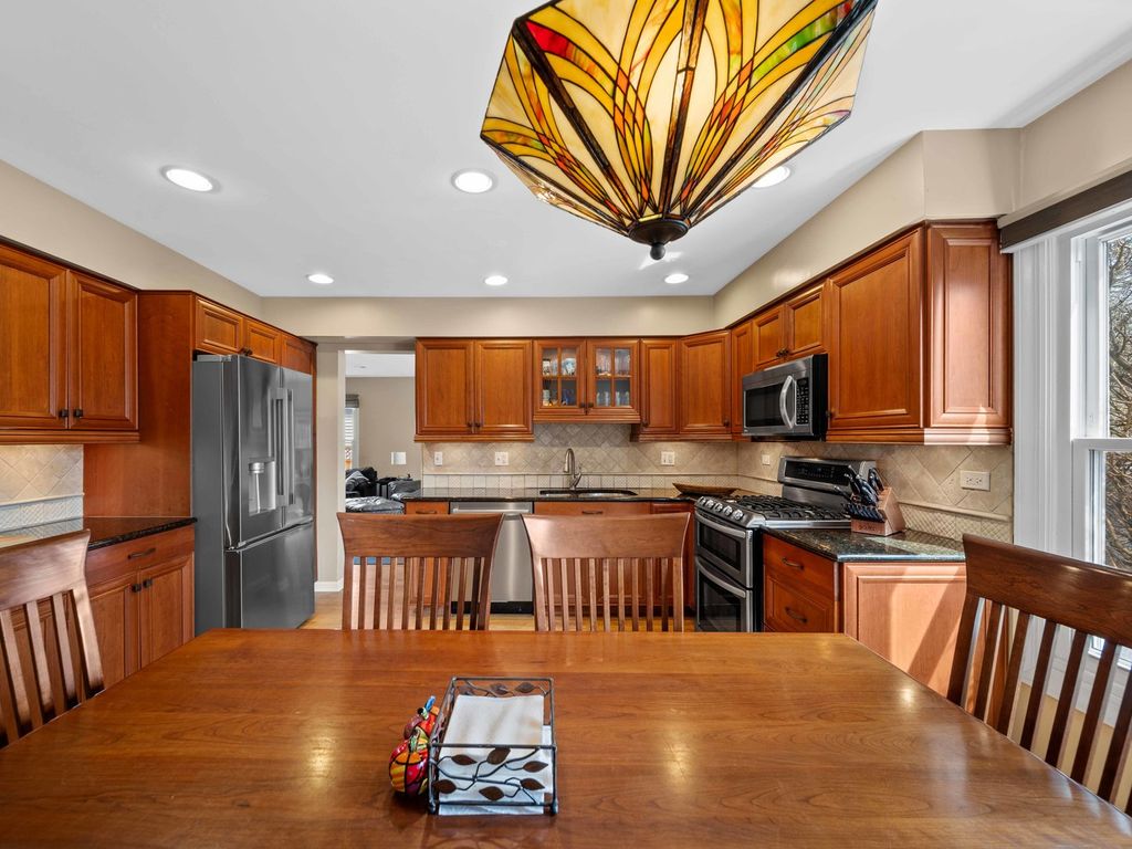 Set within the sought-after Green Knolls subdivision, this beautifully maintained two-story residence offers a thoughtful blend of comfort, function, and elevated everyday living, all within a neighborhood prized for its top-rated schools and enduring sense of community. A welcoming foyer with hardwood flooring introduces the main level, where sunlit living and dining spaces unfold with an easy, timeless flow-ideal for both daily living and effortless entertaining. The kitchen is designed as the heart of the home, appointed with granite countertops, a suite of stainless steel appliances including an LG refrigerator, KitchenAid double oven with five-burner cooktop and griddle, Bosch dishwasher, and LG microwave, all complemented by a double sink with brushed nickel fixtures. An adjacent eating area creates a warm, casual gathering space, seamlessly opening to the inviting family room featuring hardwood floors, recessed lighting, built-in speakers, and French doors that lead to a concrete patio, perfect for indoor-outdoor living. A powder room and a functional laundry/mud room complete the main level. Upstairs, the expansive primary suite is enhanced by a thoughtfully designed 2013 addition and serves as a private retreat with two walk-in closets and a spa inspired bath finished in tumbled marble, offering dual vanities, a soaking tub with mosaic surround, a separate shower with body sprays, bench seating, and a private commode room. A secondary ensuite bedroom is perfect for guests or family members, while two additional bedrooms share a well appointed hall bath. The finished basement extends the living space with a versatile recreation area and ample storage. Notable updates include newer windows, dual HVAC systems, a tankless water heater and refrigerator, reflecting a home that has been carefully maintained and thoughtfully improved over time. With a concrete driveway, patio, and a location that blends suburban tranquility with exceptional convenience, this is a home that delivers both lifestyle and long-term value in one of Buffalo Grove's most desirable neighborhoods.