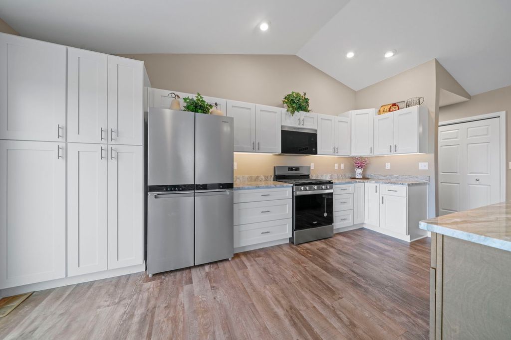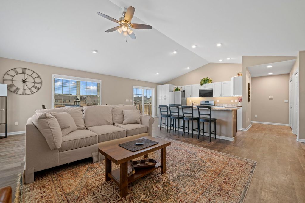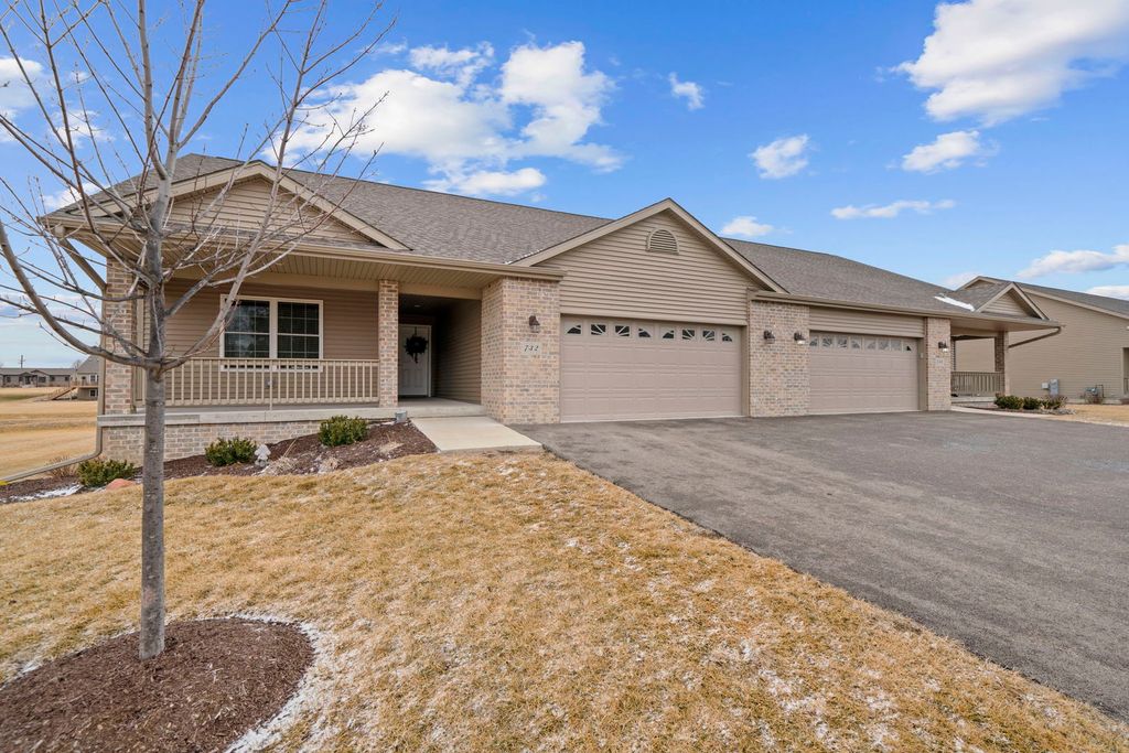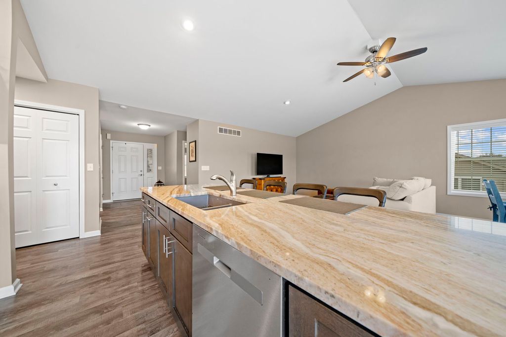Welcome to Summerwood Gardens, a sought-after townhome community within Country Club Estates in Dixon. Built in 2023, this 2-bedroom, 2-bath condo blends modern style with thoughtful design and enhanced accessibility, including wider doorways, wider closets, and a ramp in the garage. The open floor plan showcases vaulted and tray ceilings with ceiling fans, light dimmers, and abundant natural light. The kitchen is beautifully appointed with upgraded granite countertops, an upgraded sink, center island, pantry cabinetry, soft-close doors and drawers, and new stainless appliances. Main-floor laundry adds everyday convenience. The primary suite features a walk-in shower, double sinks, and a spacious, deep walk-in closet. The full unfinished English basement offers 9-foot ceilings, an egress window, and rough-in plumbing for a future bathroom-ideal for expansion. Additional highlights include upgraded flooring, composite deck, central humidifier, owned water softener, new garage flooring, garage spigot, and a 2-car attached garage. Enjoy low-maintenance living with lawn care, snow removal, and access to a community walking path included.