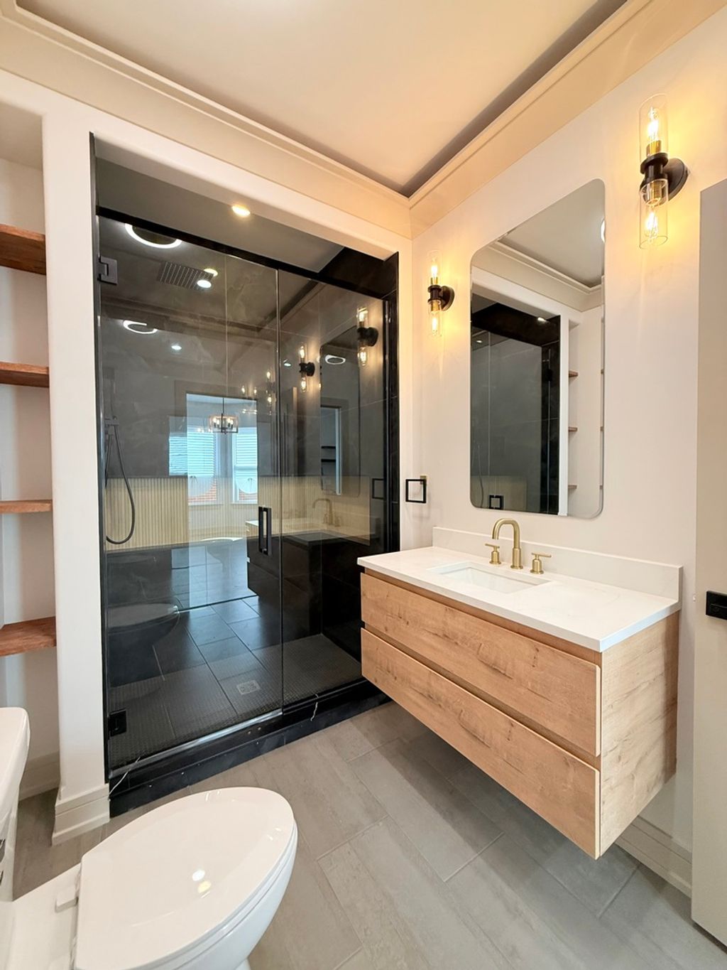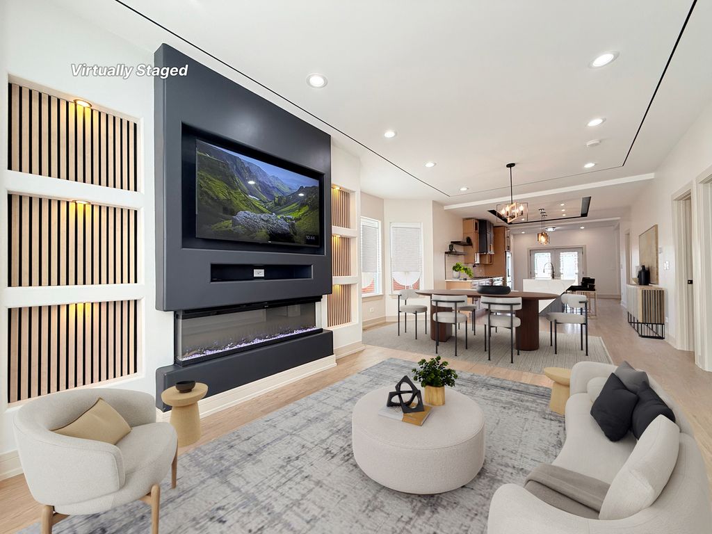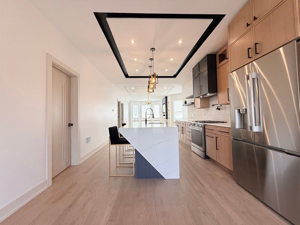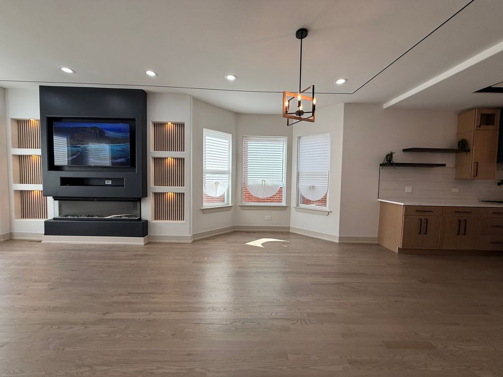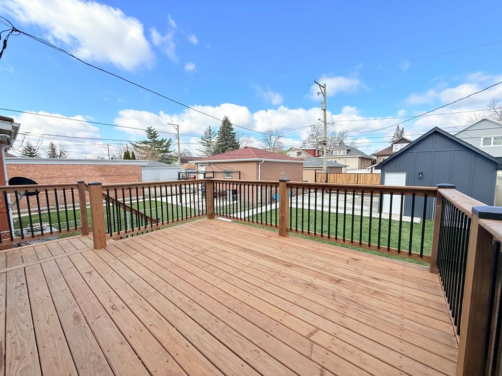 Absolutely stunning fully rehabbed and rebuilt 6-bedroom, 3-bathroom home in sought-after Berwyn, showcasing high-end design, quality craftsmanship, and modern functionality throughout. Step into a bright open-concept main level featuring wide-plank hardwood floors, custom floating ceilings with recessed lighting, and a striking built-in fireplace feature wall with integrated TV and ambient lighting. The designer kitchen is the centerpiece of the home, complete with custom soft-close cabinetry, stainless steel appliances, and a dramatic waterfall island with seating and built-in microwave, sink, and dishwasher. Just off the kitchen, enjoy a cedar deck-perfect for outdoor gatherings and entertaining. The main level also offers 2 bedrooms and a full bath, ideal for guests, office space, or flexible living. Upstairs, you'll find 3 spacious bedrooms and a full bathroom, including a large primary bedroom with shared bath access. The fully finished walkout basement expands your living space with a large family room, 6th bedroom, and full bathroom-perfect for entertaining, in-law arrangement, or extended living. This home has been rehabbed and rebuilt with plans and permits, featuring : Dual-zoned HVAC All new plumbing, electrical, and HVAC systems New windows & energy-efficient foam insulation New foundation Flood control system (drain tile, overhead sewer, sump pump) New copper water main line Additional highlights include a 1-car garage plus extra concrete parking for 2 additional vehicles. Located just minutes from I-290 and I-55 with an easy commute to downtown Chicago.