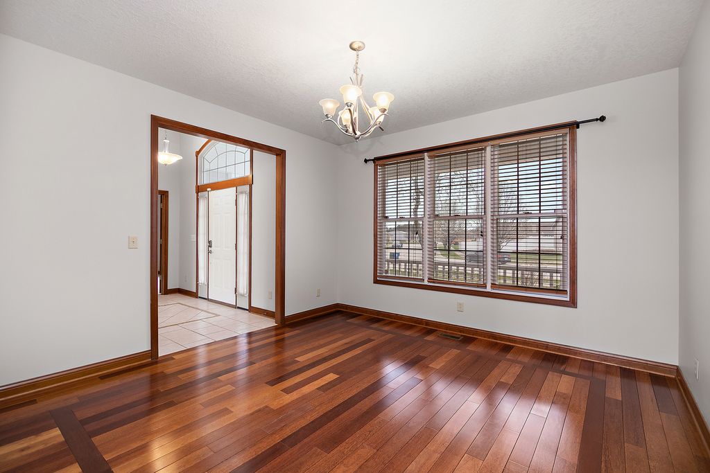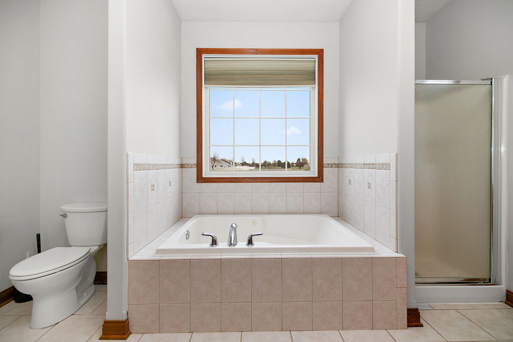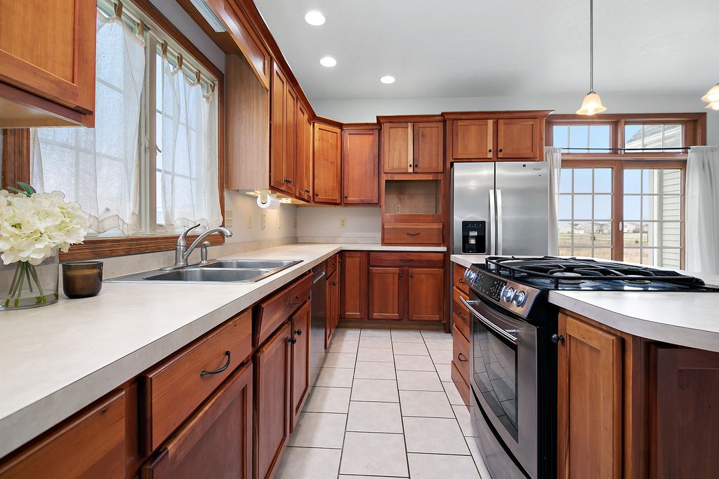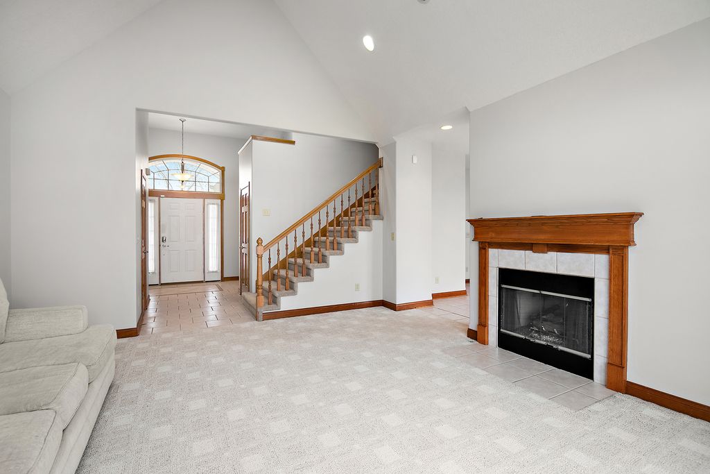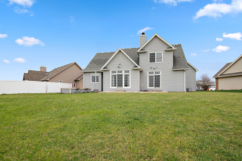Step into a bright, open layout featuring a VAULTER living room with gas fireplace that flows right into a spacious kitchen with maple cabinets, stainless appliances, and center island. {Bonus: two sets of sliding doors lead out to a huge patio overlooking a peaceful retention area} The main level primary suite offers TWO WALK-IN closets, double vanity, whirlpool tub, and separate shower, plus the convenience of first floor laundry. Flexible spaces include a formal dining room with hardwood floors or office off the foyer, along with a bonus room that can easily serve as a 4th bedroom, playroom, or workspace. Full basement with bathroom rough-in gives you room to expand. Freshly painted with neutral tones, 6-panel doors throughout, and garden boxes included. Move-in ready with space, layout, and versatility.