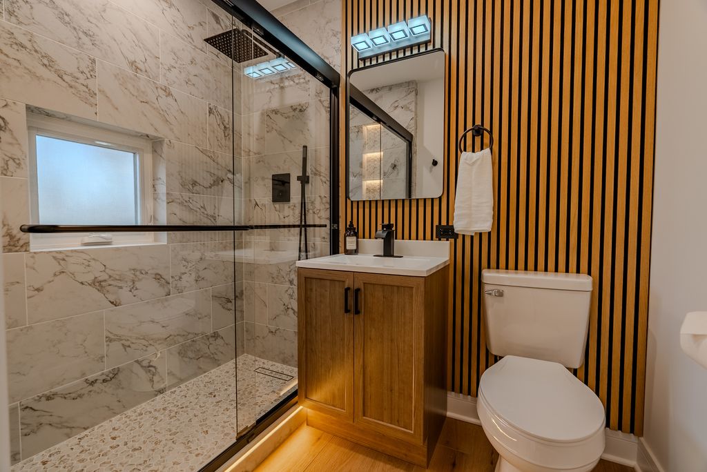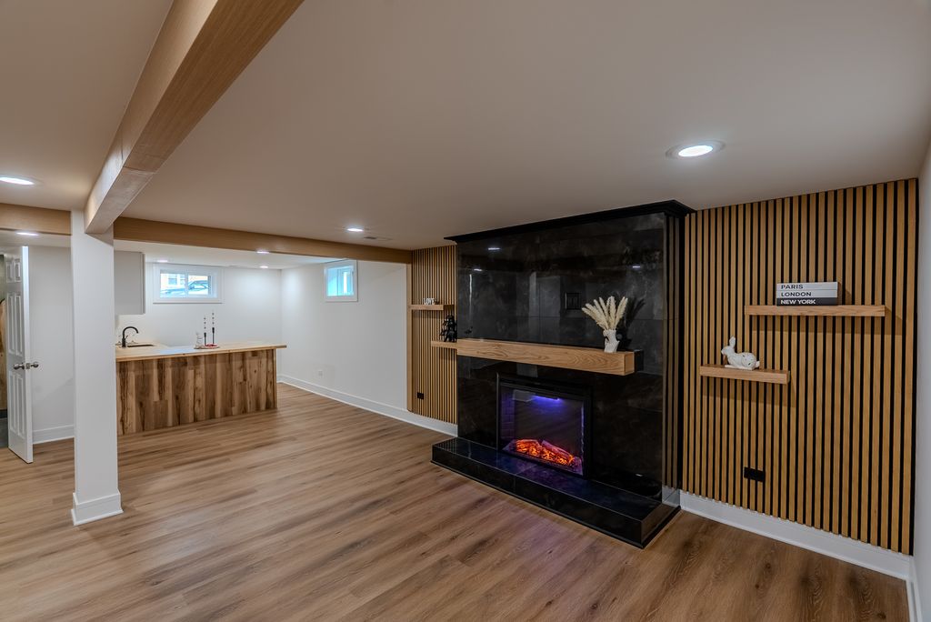 Welcome to this beautifully renovated all-brick home, where modern updates meet timeless charm. This property has been completely rehabbed from top to bottom, offering exceptional quality and thoughtful design throughout. The main level features a spacious layout with three bedrooms and two full bathrooms. A stunning wood-burning fireplace serves as the focal point of the living space, enhanced by elegant lighting and gorgeous hardwood floors that flow throughout the bedrooms and living room. The cozy kitchen is equipped with LG smart stainless steel appliances, controllable from your phone, along with Corian countertops and a comfortable seating area-perfect for everyday living and entertaining. The fully finished basement expands your living space with two additional rooms, a beautiful family room with a second fireplace, and a stylish wet bar/kitchenette complete with a wine cooler, sink, and dishwasher-ideal for hosting guests or creating a private retreat. This home also features: New electrical and copper plumbing New windows and interior doors Brand new HVAC system 50-gallon water heater The finished garage includes a large storage/attic area above, providing excellent additional space. Step outside to enjoy a cozy, fenced side yard with fresh sod and a dedicated barbecue area-perfect for relaxing or entertaining. Conveniently located near shopping, dining, and transportation, this home offers both comfort and accessibility. A true move-in-ready gem with custom millwork and high-end tile finishes throughout-don't miss this opportunity!