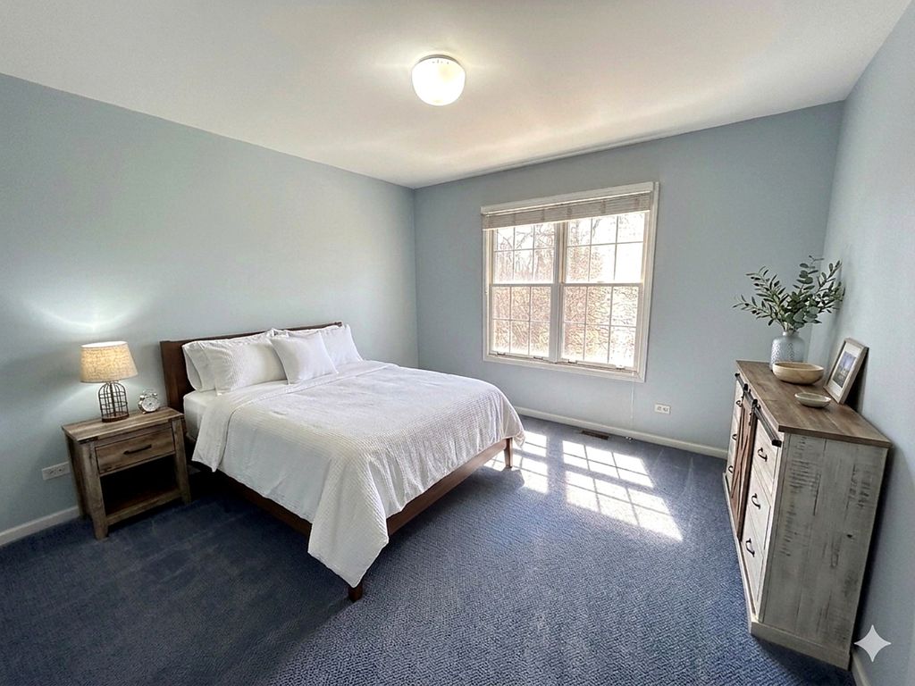 Nestled in the heart of Gurnee's highly sought-after Providence Village, this charming Douglas model colonial offers over 2,500 square feet of thoughtfully designed living space that perfectly blends traditional New England influence with modern comforts. The main level welcomes you with gleaming hardwood floors, crisp white colonist trim, and classic six-panel doors that flow seamlessly from the center entry to the flanking formal dining and living rooms. Shiplap accents update the Federal mantle surround of our masonry brick fireplace, providing an ideal spot to curl up and read a good book on a chilly day. At the heart of the home, a cozy family room features a wall of windows that floods the space with natural light and a sophisticated batten board accent wall. The efficiently designed kitchen serves as a culinary retreat, boasting white cabinetry capped with newer quartz countertops and a full suite of stainless steel appliances, including a French-door refrigerator and a four-burner gas range with griddle, dishwasher and built-in microwave, all less than three years old. An atrium door leads from the eating area to a private backyard oasis that backs to a serene wooded preserve, offering peaceful views with no rear neighbors. Upstairs, the expansive primary ensuite serves as a pleasant respite at the end of a busy day, complete with a walk-in closet and a spa-inspired bath featuring a dual-sink vanity, relaxing soaking tub and a double shower. Three additional generously sized secondary bedrooms are equipped with overhead lighting and blinds, including a unique fourth bedroom highlighted by maple flooring and classic dormered window. Downstairs is a full basement waiting for your finishing ideas, a laundry area where the washer and dryer remain, and an HVAC system that is less than two years old. This home is perfectly positioned within a vibrant community featuring sidewalks, nature trails, and neighborhood King's Park just down the street. Residents enjoy easy access to major commuter routes including I-94 and Routes 45 and 41, and are less than ten minutes from the premier shopping, dining, and entertainment at Gurnee Mills and the Grand-Hunt corridor. This property offers a wonderful opportunity to enjoy a beautiful home in a neighborhood known for its welcoming atmosphere and seasonal community events.