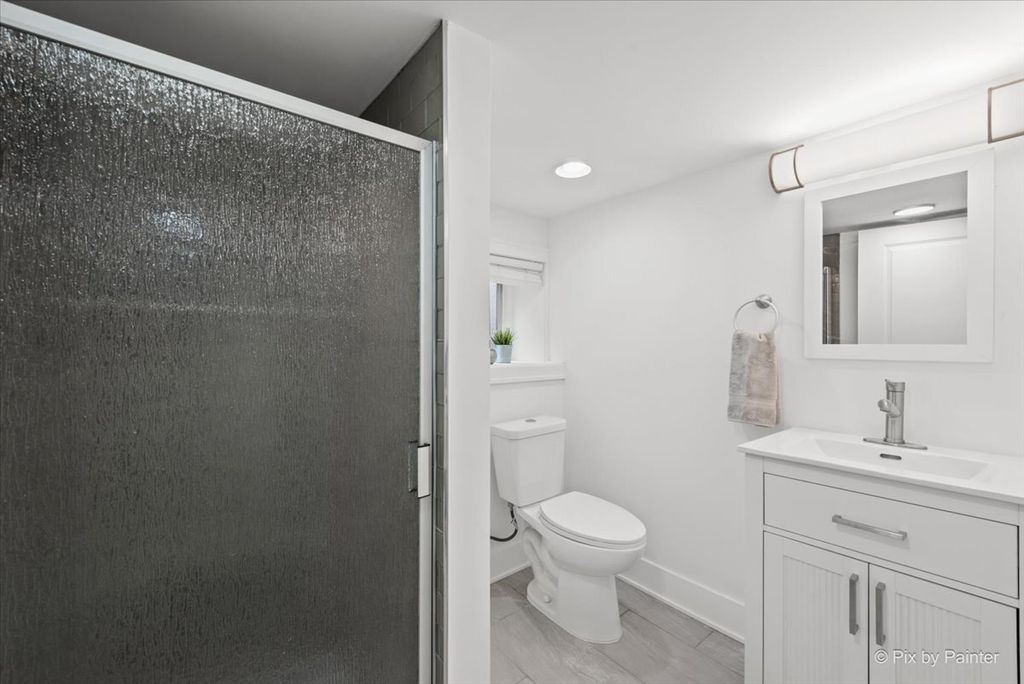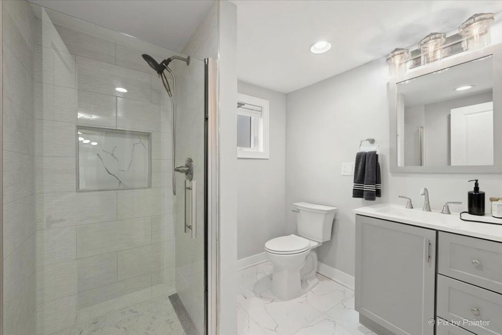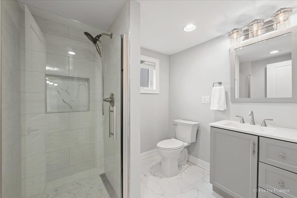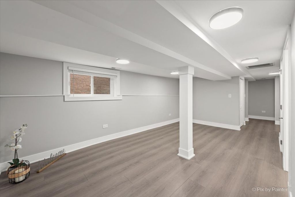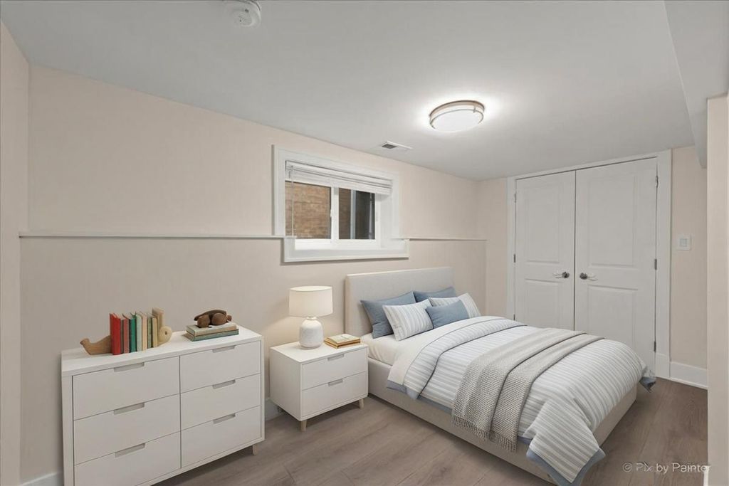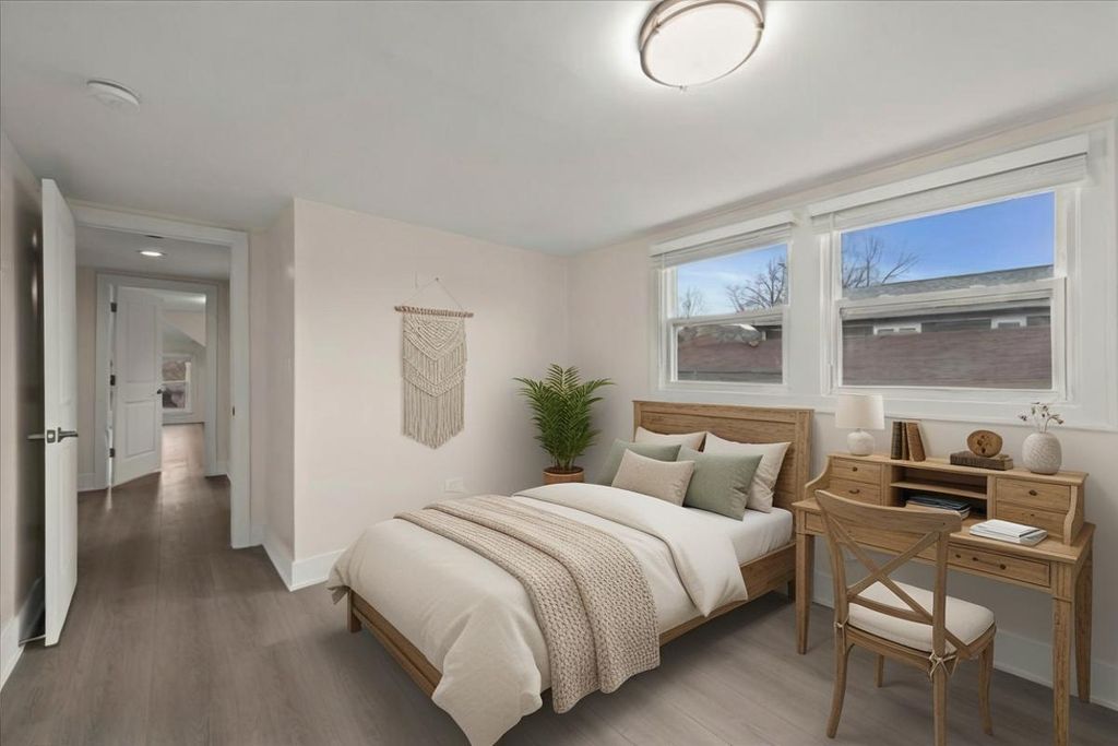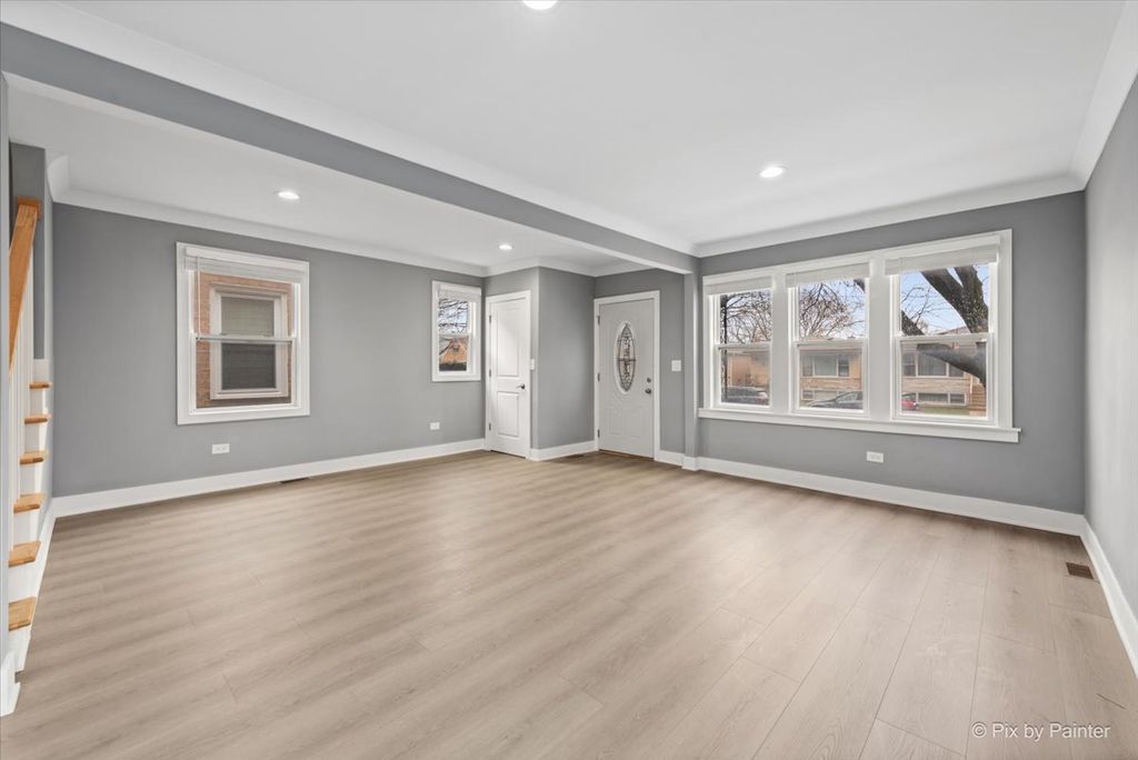 Luxuriously renovated 1.5-story single-family home situated on an oversized 30x125 lot. This spacious and functional home is thoughtfully designed to accommodate a variety of lifestyle needs while maintaining a warm and inviting atmosphere. The home features 6 bedrooms and 3 full bathrooms, well distributed across three levels. A welcoming front entrance leads into a bright, open-concept main level. The living room, dining area, and kitchen flow seamlessly together, offering both comfort and style. The kitchen has been beautifully updated with white, ceiling-height cabinetry, quartz countertops, and high-end appliances-creating a modern and highly functional space. Just off the kitchen, a sun-filled den opens to a new deck and backyard, perfect for relaxing or entertaining. Wide-plank wood laminate flooring runs throughout all levels. Each bathroom has been tastefully updated with porcelain tiles, a glass-enclosed shower or a tub, and modern fixtures. The main floor includes a versatile bedroom, ideal for a private home office. The second floor offers three well-appointed bedrooms, including a spacious primary bedroom with multiple closets. Each bedroom features elegant French paneled double doors. The fully finished lower level provides a large family room and two additional bedrooms, offering flexible living space. Extensive updates throughout the home create the feel of new construction. The property also features all new woodwork and updated mechanical systems. Located on a quiet, low-traffic street with convenient access to I-90, Metra, the Blue Line, and O'Hare International Airport. Welcome home.