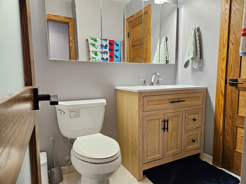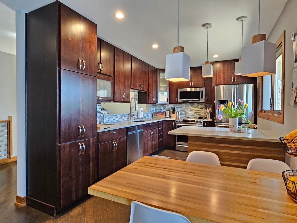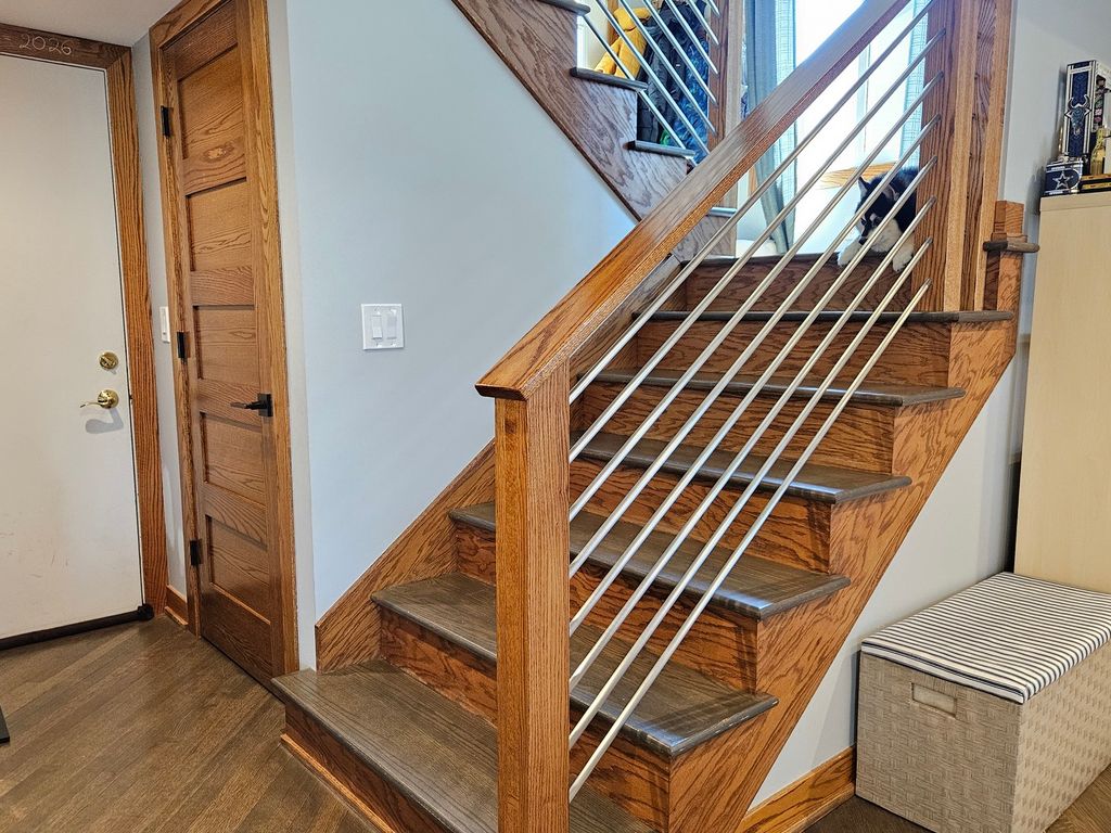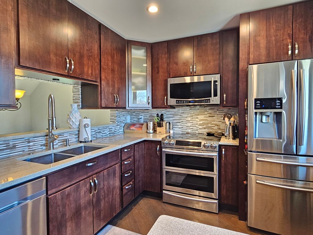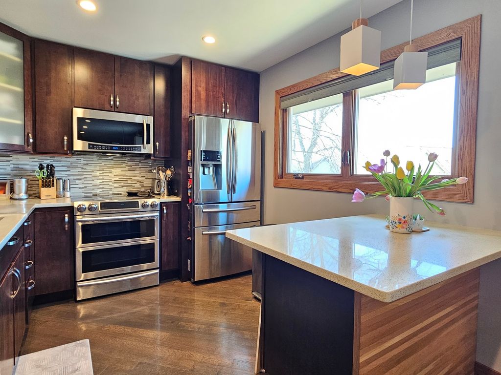 Gorgeous updated 3 bed 2 bath home. Remodeled within last few years: beautiful stylish kitchen cabinets, quartz countertops, ss appliances, refinished hardwood floors, windows, roof, siding ( LP SmartSide Lap Siding- top rated engineered wood siding offering superior durability against rot , pests and impacts) , both bathrooms, all woodwork / doors, trims, a/c, furnace. Spacious family room in the lower level with the decorative fireplace and entertainment center wall, office space and heated floor. Lower-level bathroom completely redone with heated floor. A lot of closet space. Huge upper-level deck overlooks nice private fenced yard. Patio on the ground level. Nice backyard with room for a garden. Move in ready but sold as is condition.