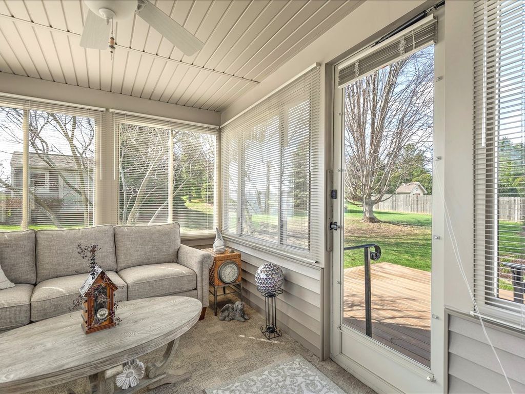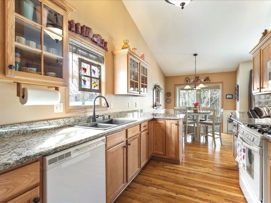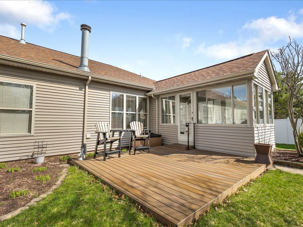 GORGEOUS RANCH WITH VAULTED CEILINGS AND HARDWOOD FLOORS. Shows light & bright! This home is in EXCELLENT condition.Hardwood floors, all trimwork in pristine condition. Kitchen has beautiful granite counters, up lights on cabinets, white appliances. Vaulted main living roomwith gas fireplace and beefy wood mantle. Primary bedroom also has vaulted ceilings, large walk-in closet and shower unit. Second bedroom convenientlylocated right next to 2nd full bath. Lovely 3 season room off kitchen which has two heat vents. Lower level is finished with large rec room (pool table doesn't stay) and plenty of unfinished storage. Very private yard with no maintenance deck and nice garden shed for storage. Roof replaced in 2023 and has gutter guards. Central air and furnace approximately 7 years old. Newer water softener (replaced 2025). Newer washer and dryer (stay). Garage floor has epoxy coating. No Condo HOA (HOA was dissolved). Quail Run subdivision HOA is $100 per year. Seller has paid through April 2027.Realtor CONDO ASSOCIATION WAS DISSOLVED. Owner split mowing/ snow removal costs with attached condo. Cost was $40 per unit for each side.