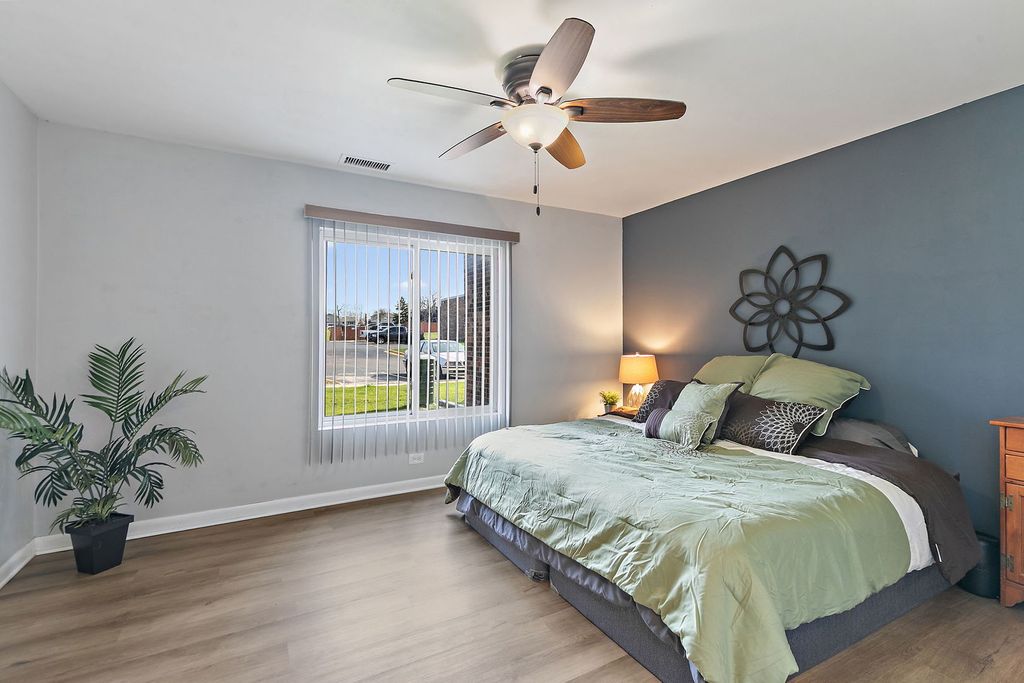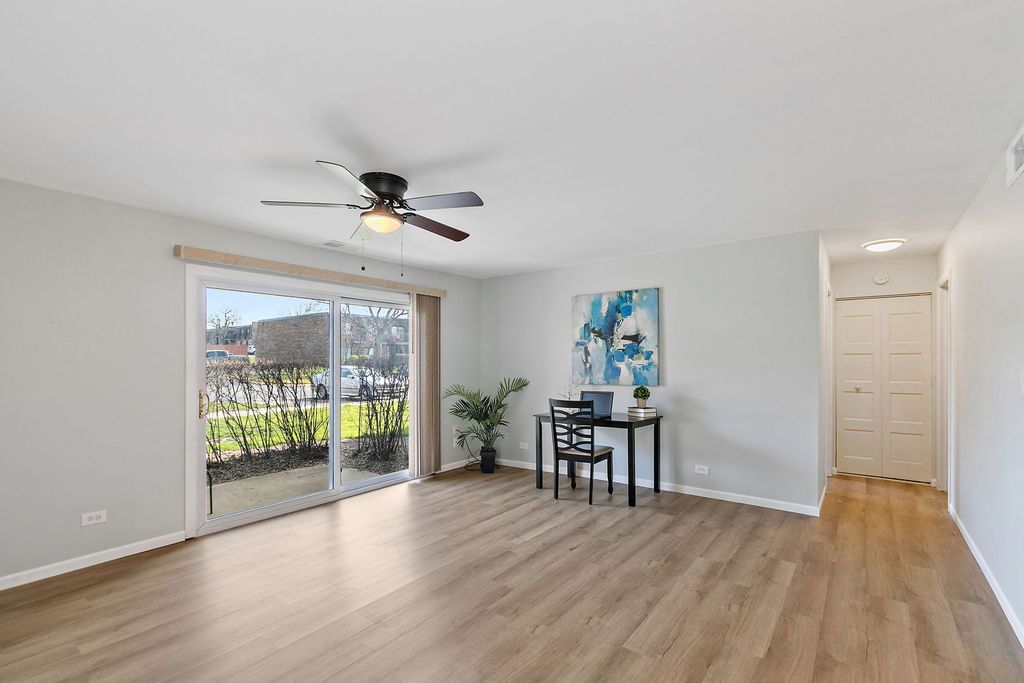 Move-in ready and rarely available first-floor condo in desirable Lakewood! This spacious 1 bedroom, 1 bath home features brand new luxury vinyl plank flooring throughout (2026) offering both style and durability. Enjoy the large living room with sliding glass doors leading to your private concrete patio. Plus, you'll appreciate the added convenience of using the patio door as a private entrance, making everyday tasks like bringing in groceries quick and easy. The eat-in kitchen is generously sized and thoughtfully updated with modern cabinetry, tiled backsplash, cultured marble countertops, and a functional peninsula layout, providing great space for both cooking and entertaining. The spacious bedroom features an oversized walk-in closet with built-in shelving and plenty of potential to customize into your dream closet! The full bathroom has been refreshed with a new medicine cabinet and vanity light fixture (2026), along with updated lighting throughout the home. Additional highlights include laundry and a bike room in the building, and an assigned parking space. Located in the highly rated Schaumburg school districts 54/211. Enjoy a prime location with easy access to major highways, shopping, and dining. Take advantage of community amenities including a pool, clubhouse, and park. HOA dues cover heat, water, gas, garbage, and access to amenities which allows for truly low-maintenance living. Low taxes add even more value - the 2024 taxes do not even reflect any homeowner exemptions! A perfect opportunity for easy, affordable living, make it yours before it's gone!