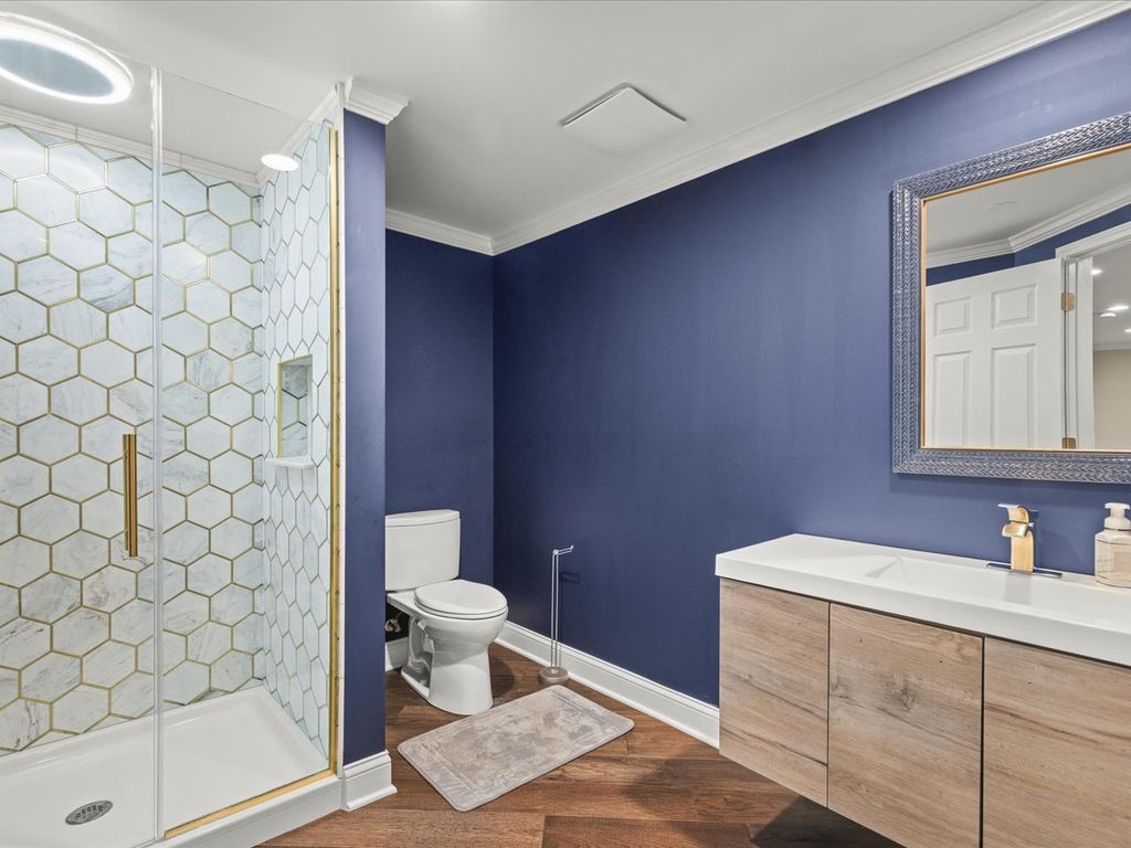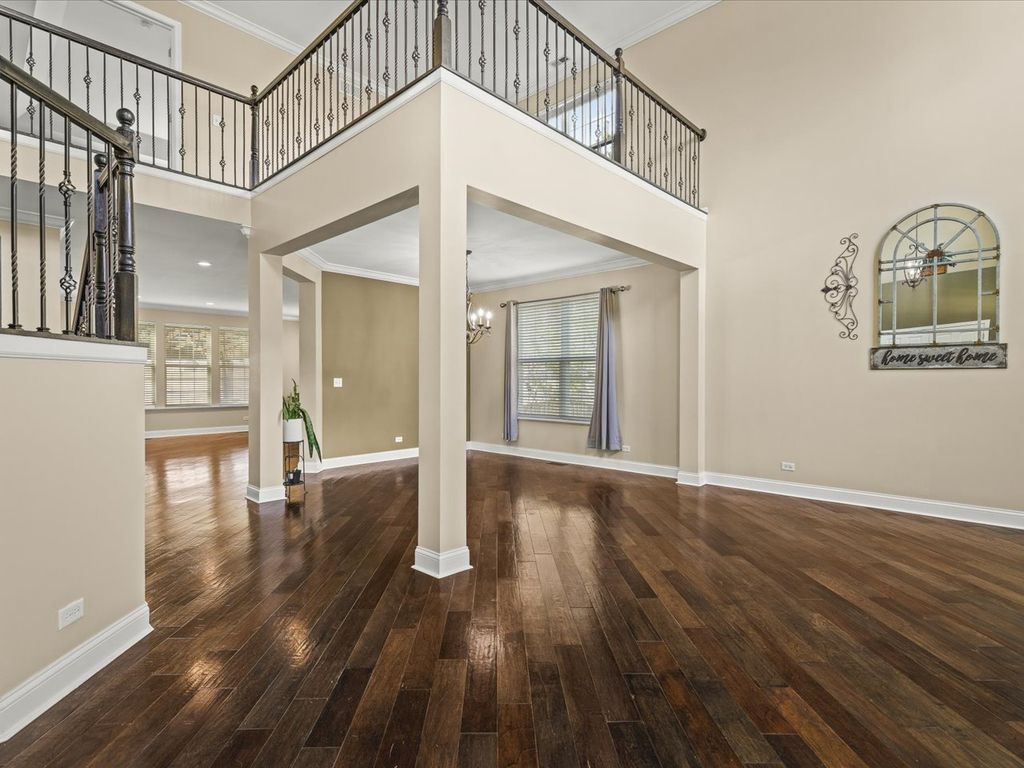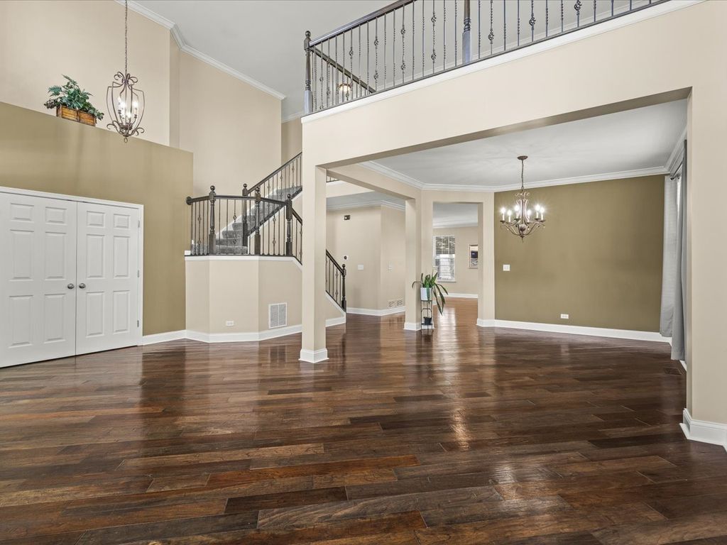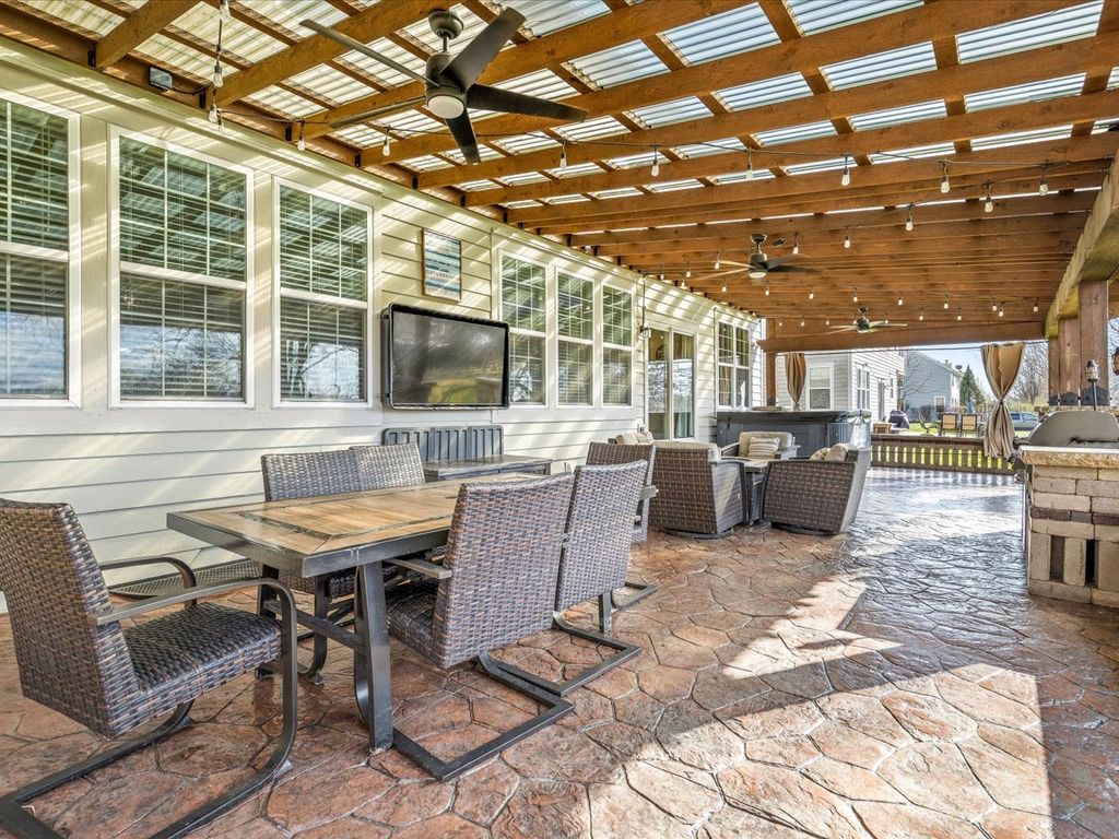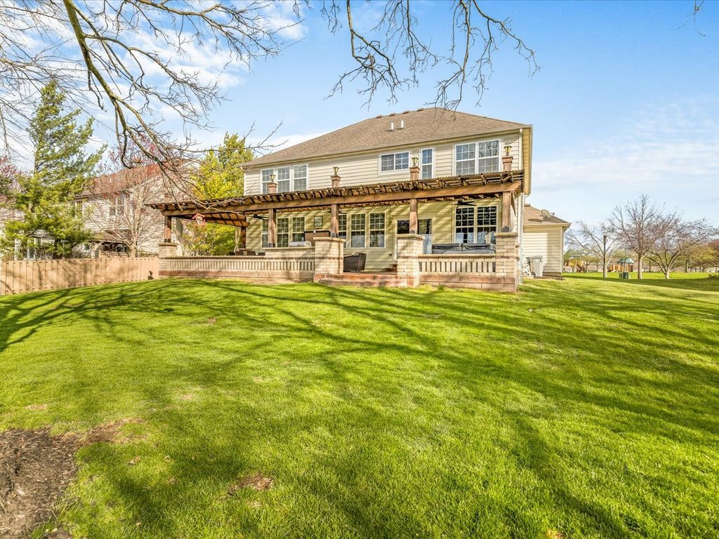 Beautifully updated and exceptionally spacious, this home offers over 3,590 square feet above grade plus a finished lower level for even more versatile living space. A grand entry with vaulted ceilings and custom railings sets the tone, leading to a flowing main level with a living and dining room combination, inviting family room, updated kitchen with granite countertops, a main-floor laundry, office, and a 3-car garage. Upstairs, the spacious primary suite features vaulted ceilings, a walk-in closet, and a private bath with double sinks and a whirlpool tub, along with three additional bedrooms and a full bath. The finished lower level includes egress windows, a full bath, and a second kitchen. Additional highlights include dual furnaces, dual A/C units, and a 75-gallon water heater. Outside, enjoy a covered stamped patio with a built-in grill and lighting, with open views in front and rear, and convenient proximity to local schools.